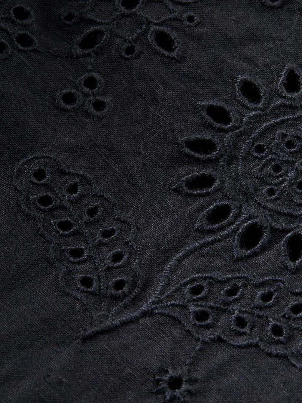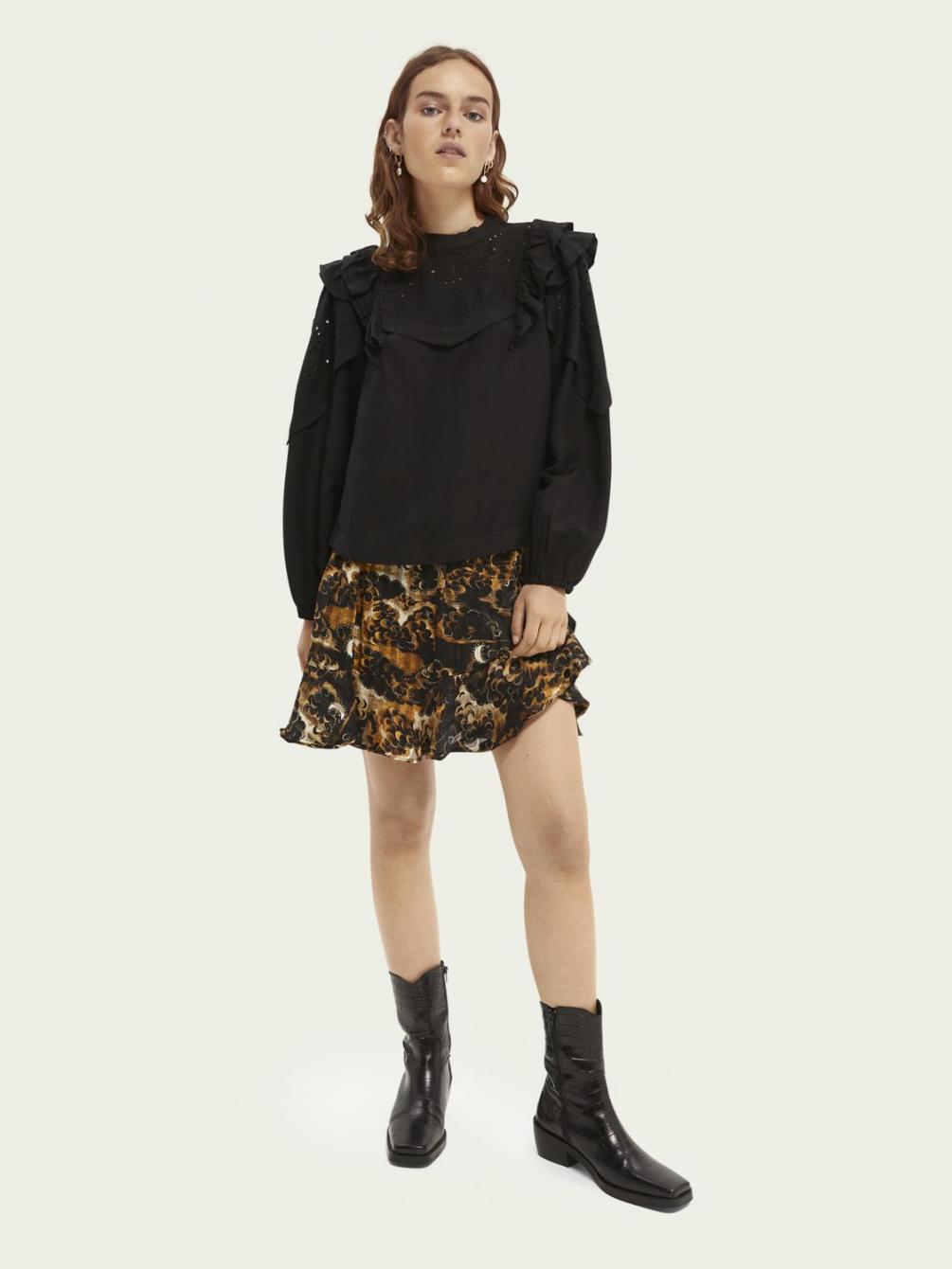 Deze top met ballonmouwen en ruches zit boordevol borduursels. Houd het netjes met een chino eronder….