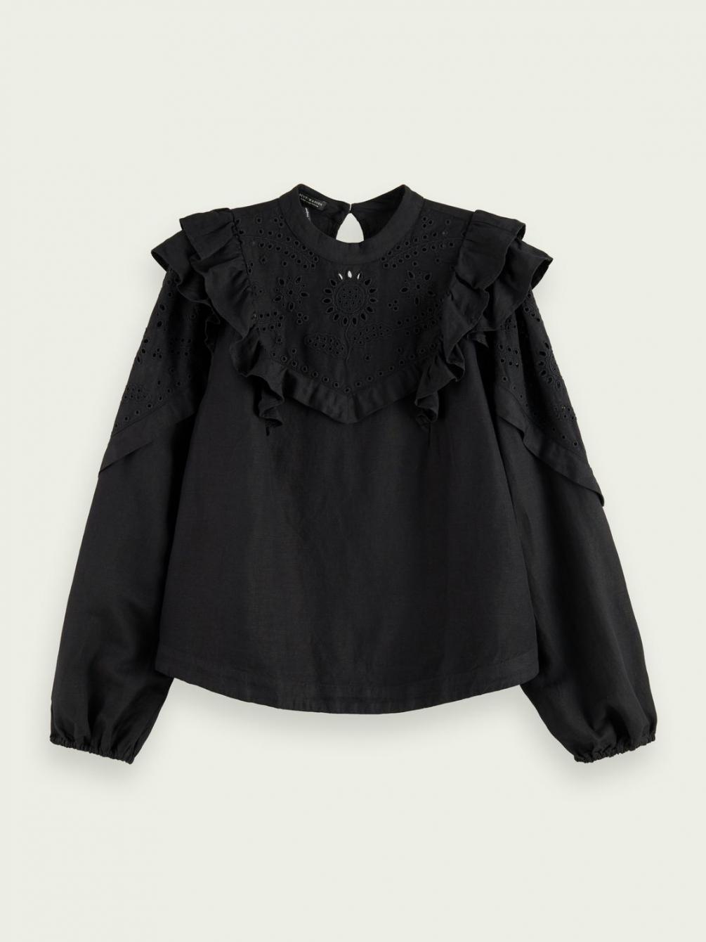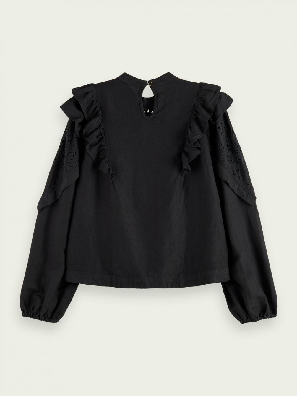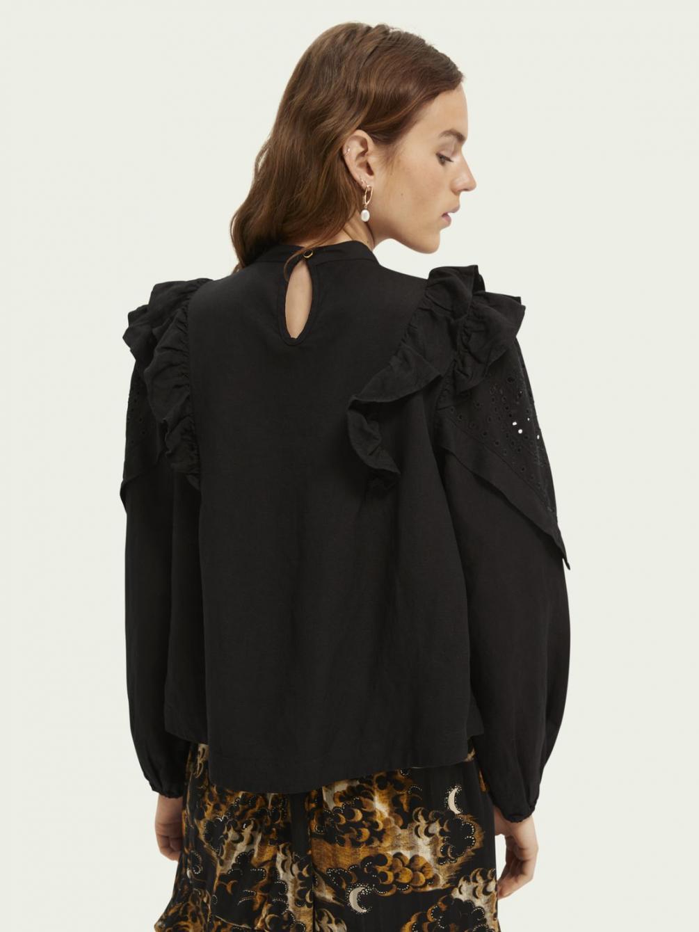 Deze top met ballonmouwen en ruches zit boordevol borduursels. Houd het netjes met een chino eronder.