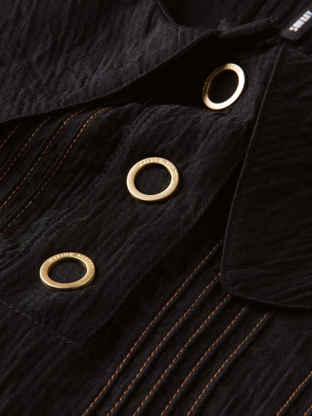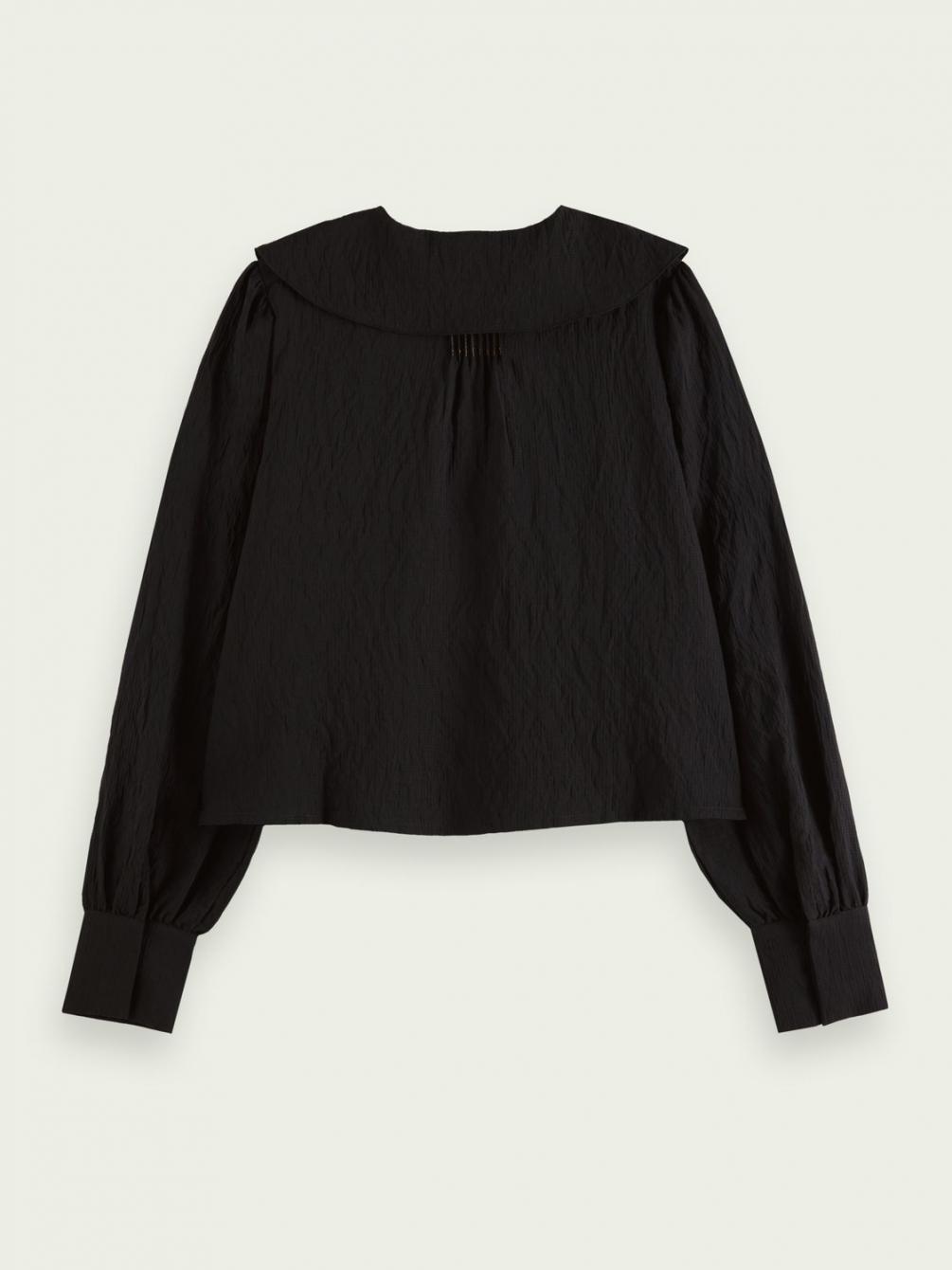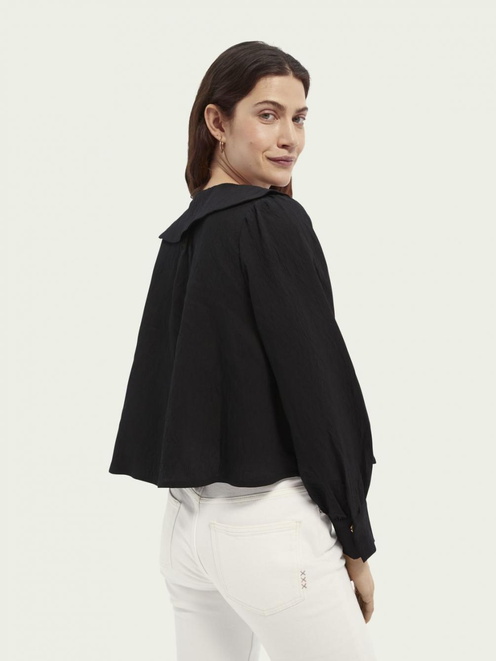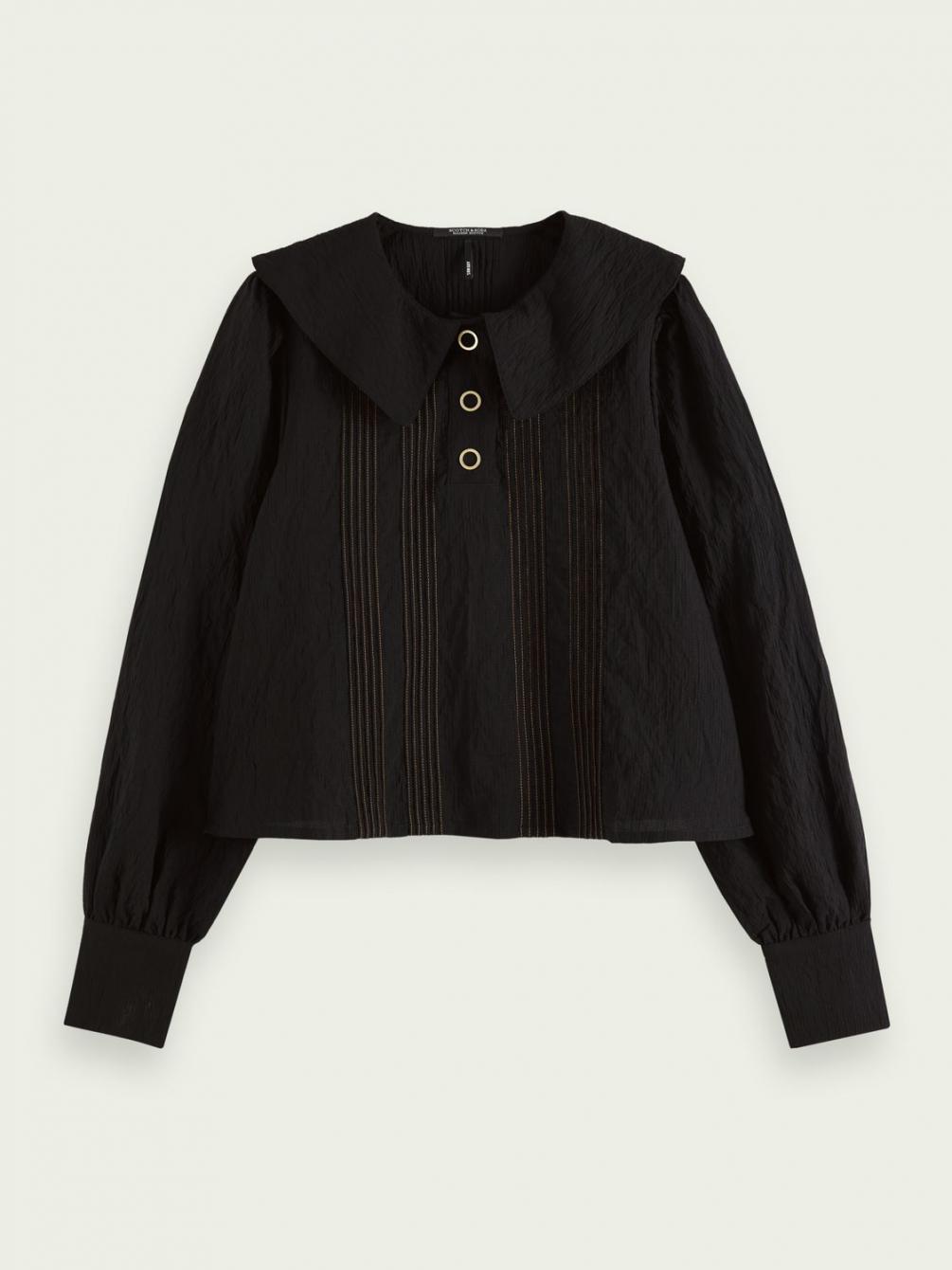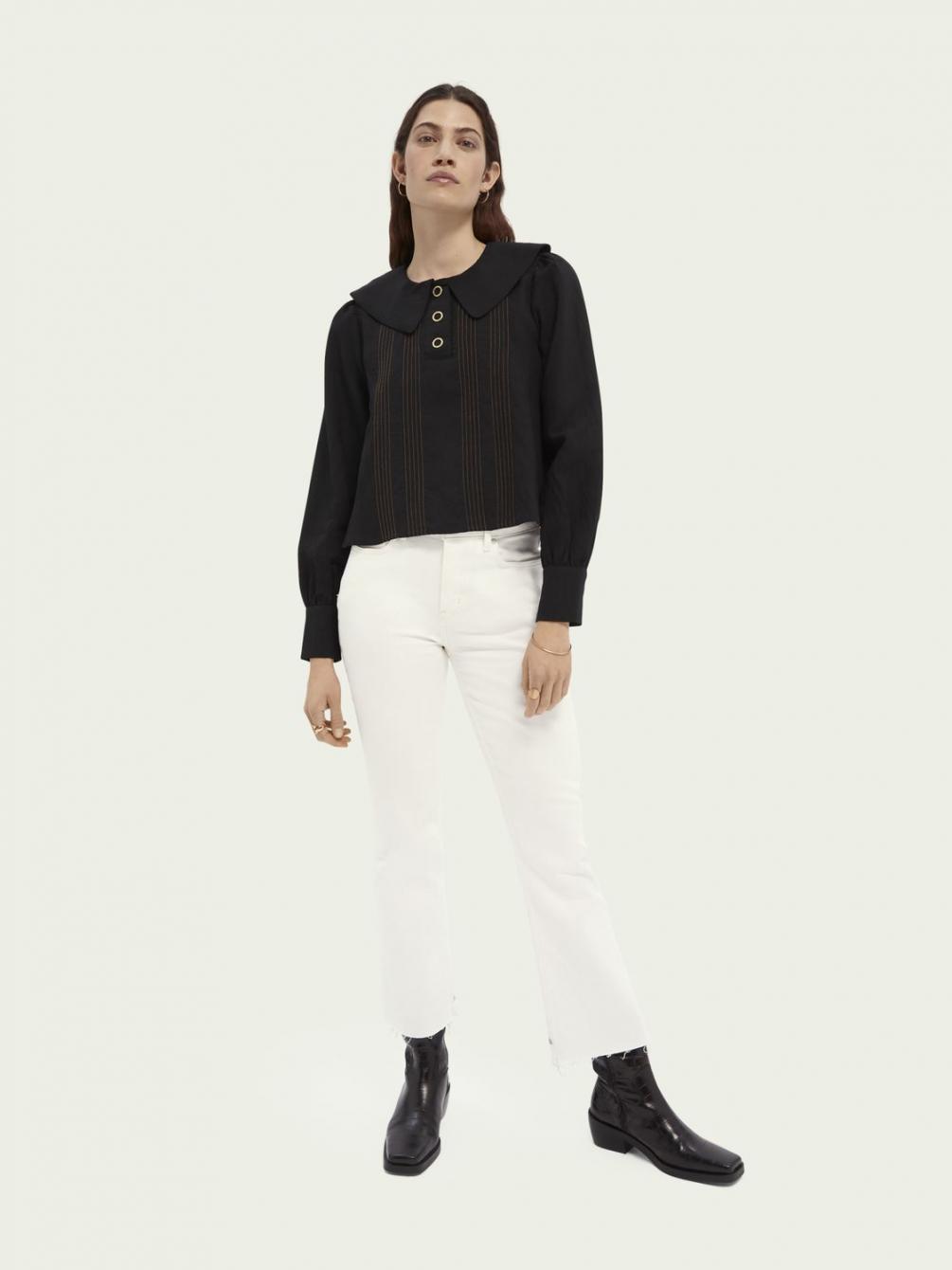Hoe groter, hoe beter. Kijk maar eens naar deze top! Een grote kraag, pofmouwen, contrasterende stiksels die meteen in het oog springen … het kan niet op! Deze top is afgewerkt met knopen en perfect om iedere dag te dragen.