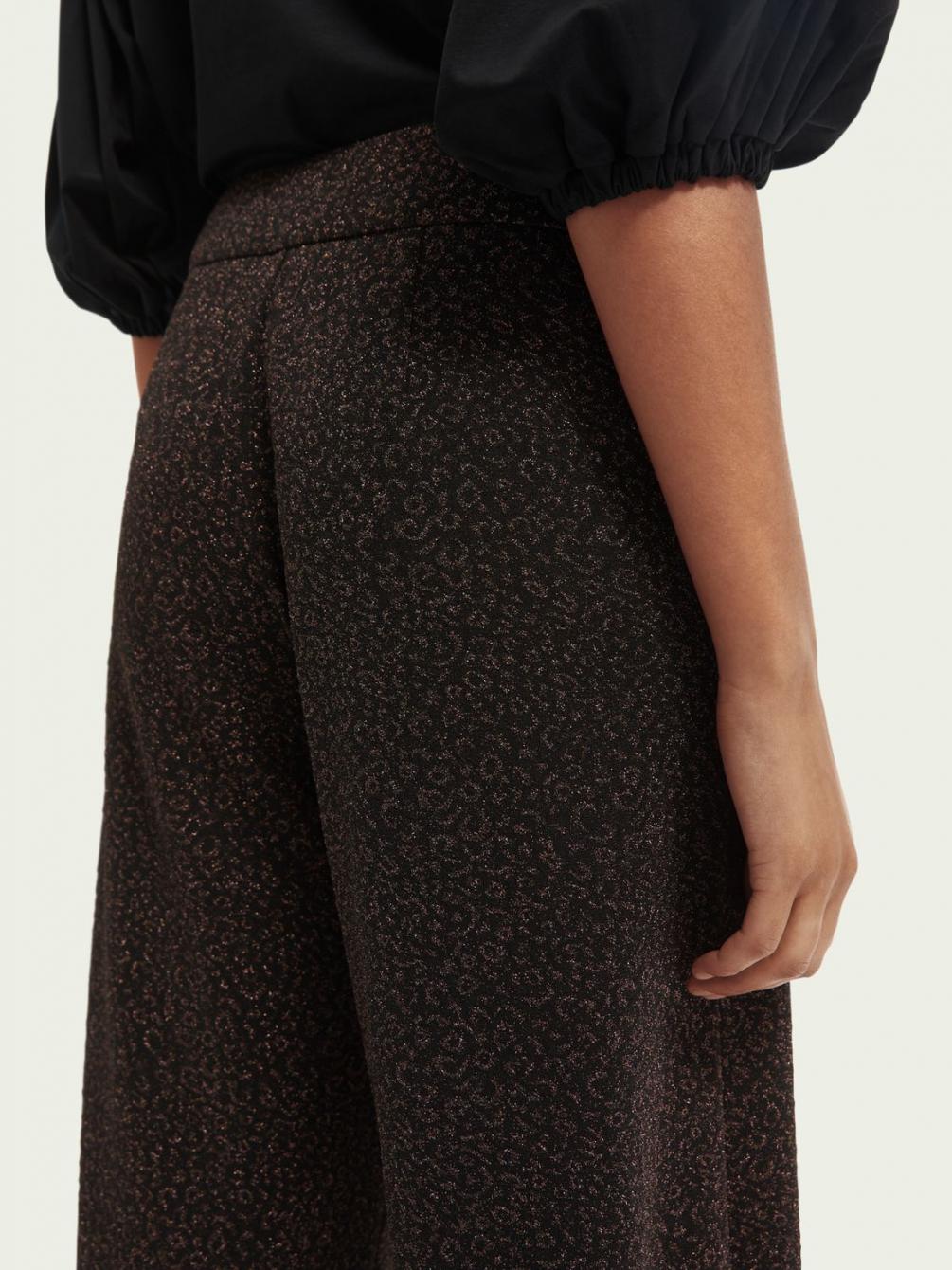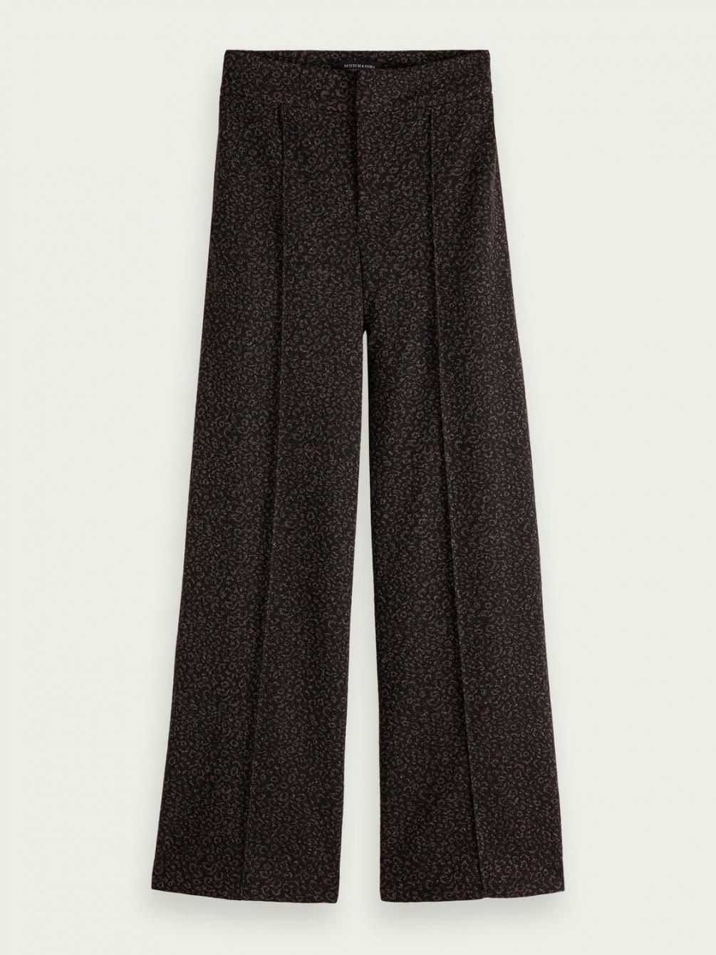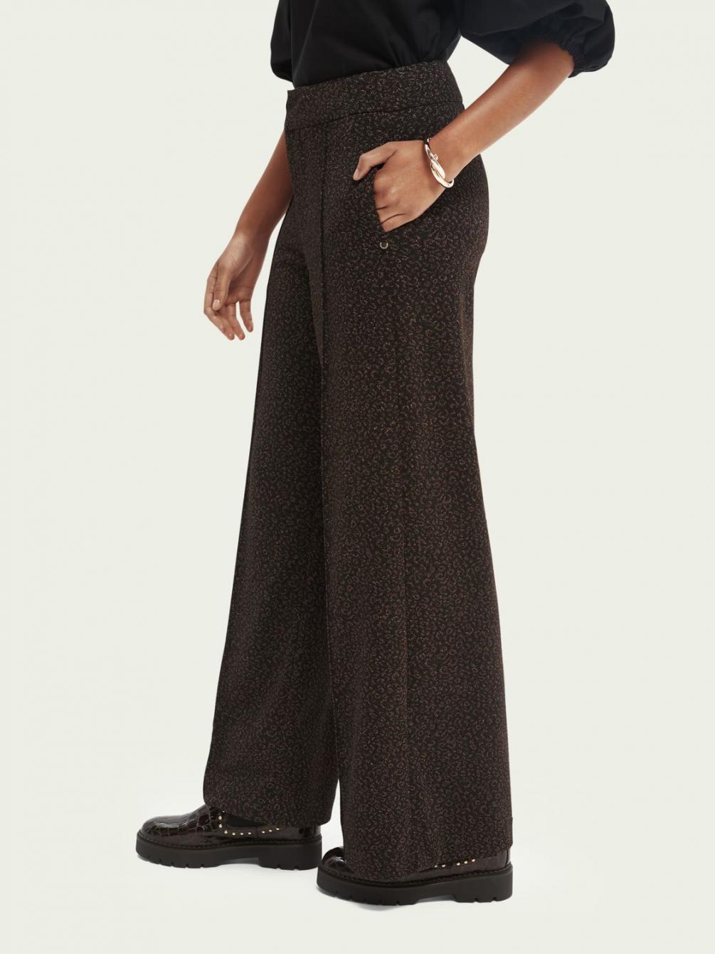 Maak kennis met de nieuwe must-have voor je garderobe. Deze broek heeft wijde pijpen en een glanzend all-over-dessin. De high-rise fit voegt een flatteuze touch toe aan dit coole en moderne item.