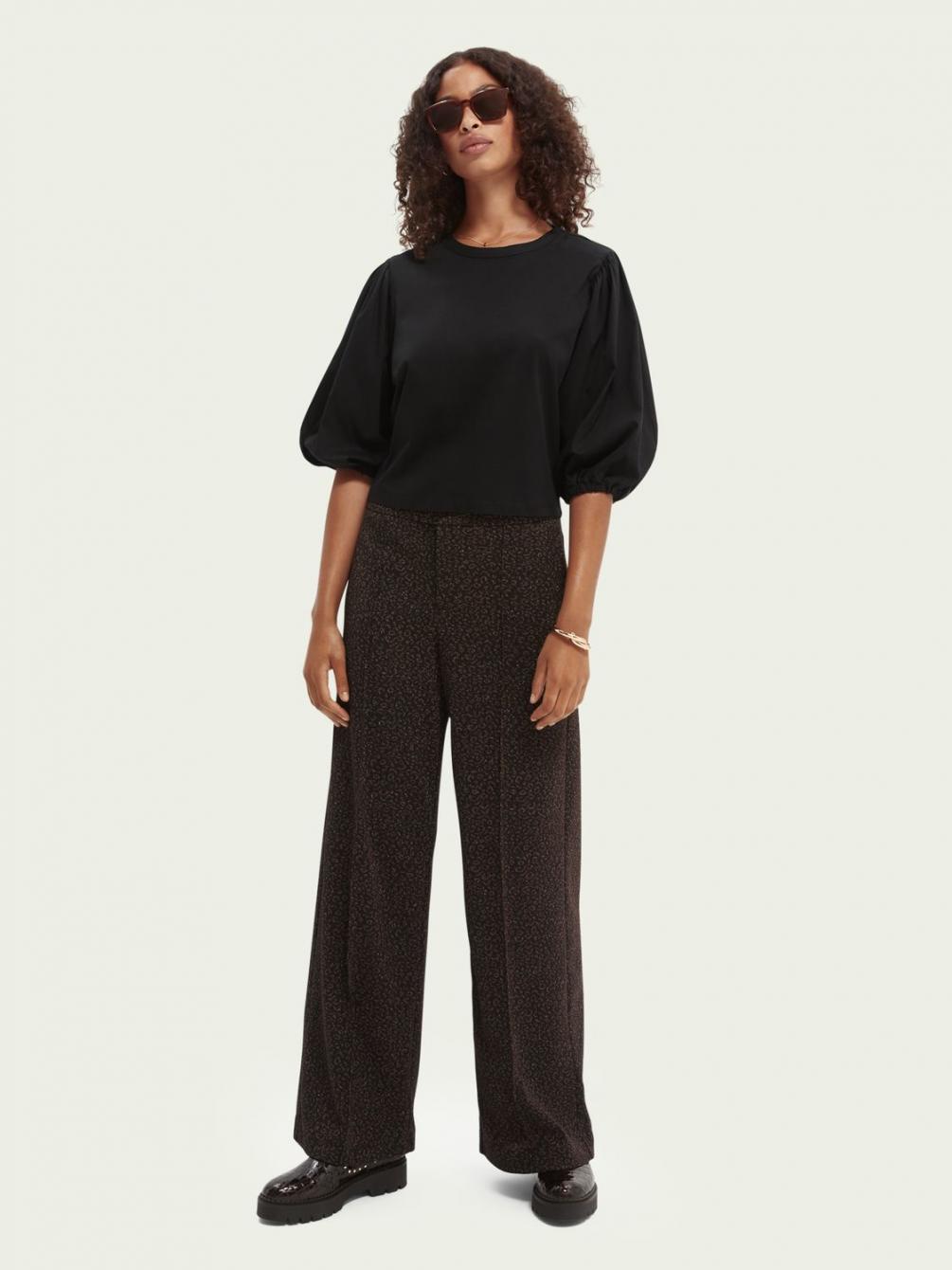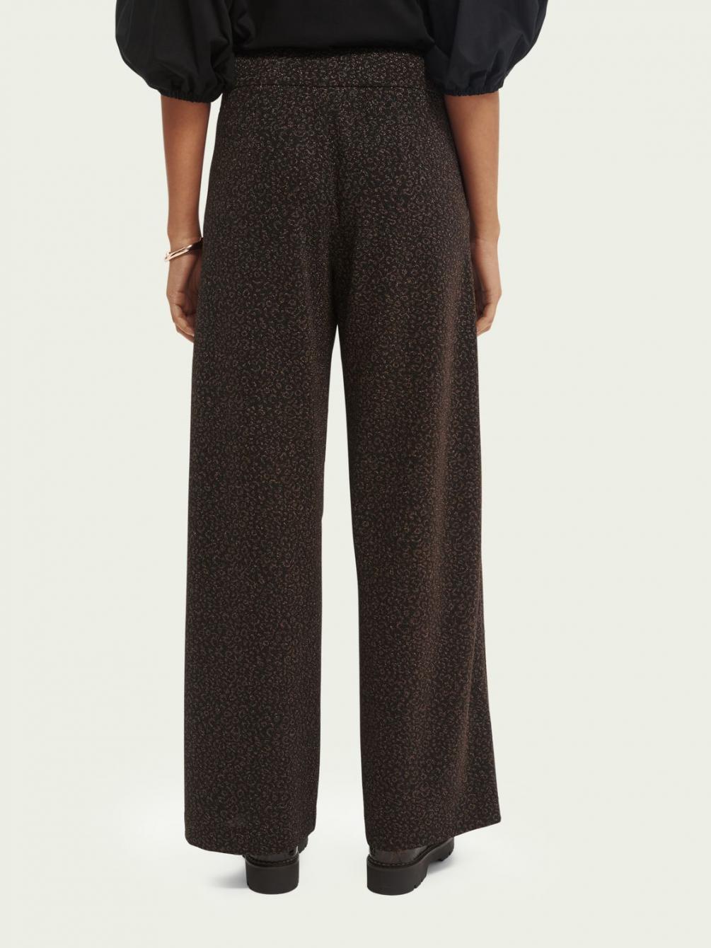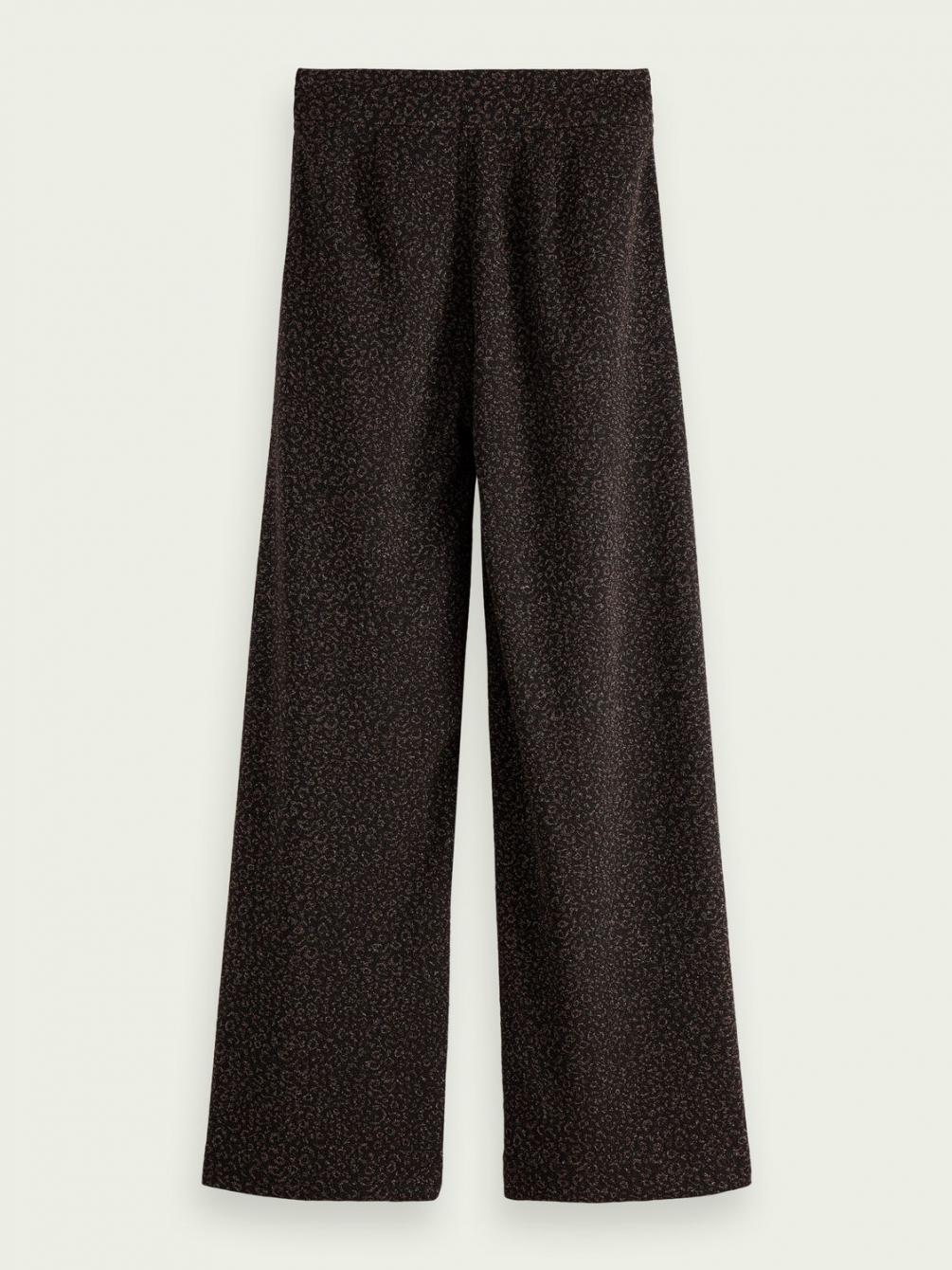 Maak kennis met de nieuwe must-have voor je garderobe. Deze broek heeft wijde pijpen en een glanzend all-over-dessin. De high-rise fit voegt een flatteuze touch toe aan dit coole en moderne item.