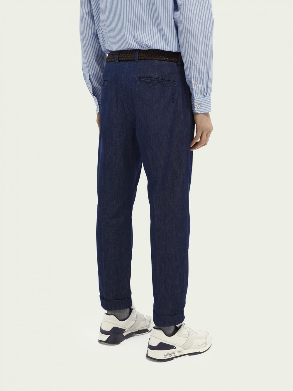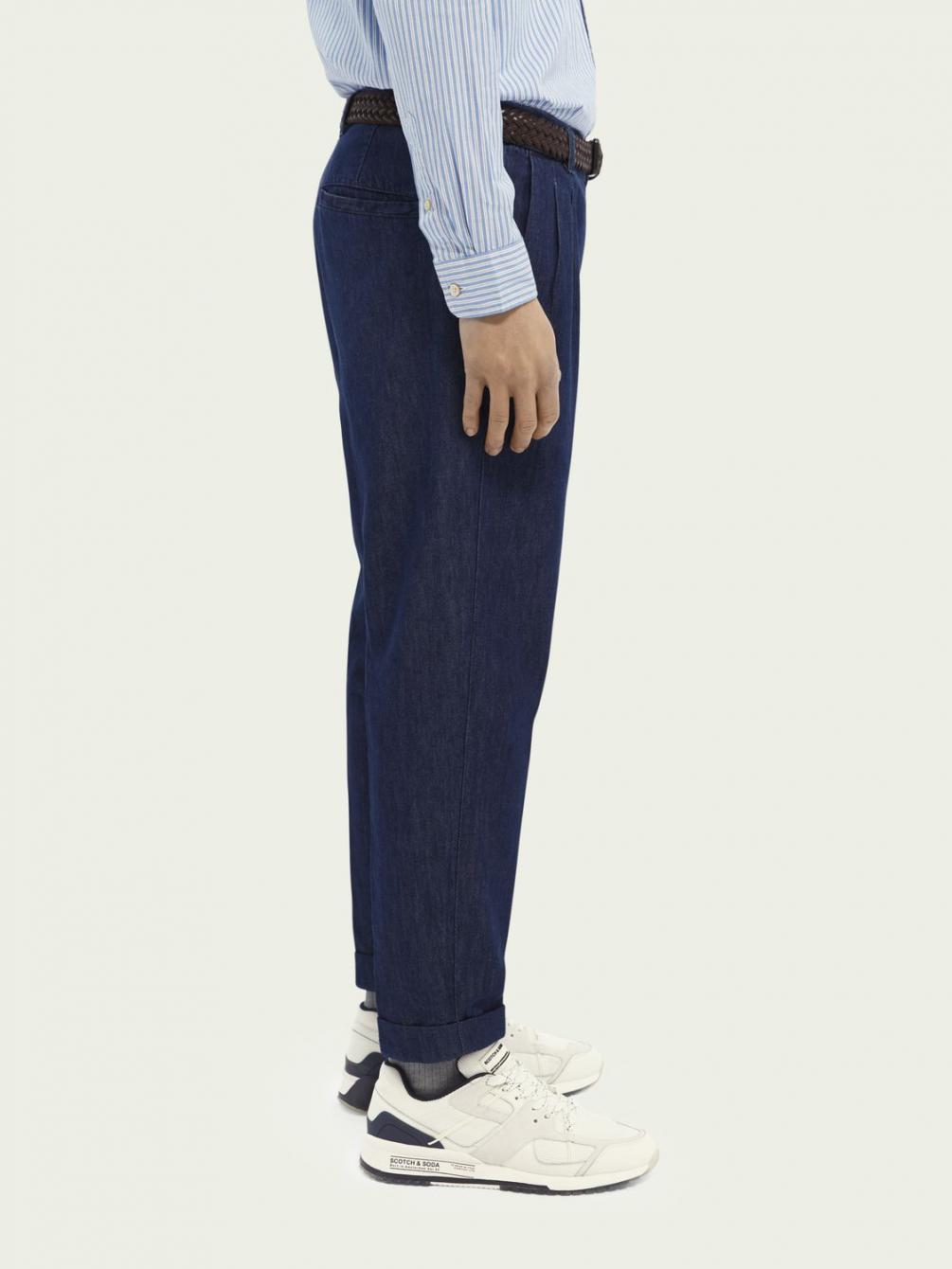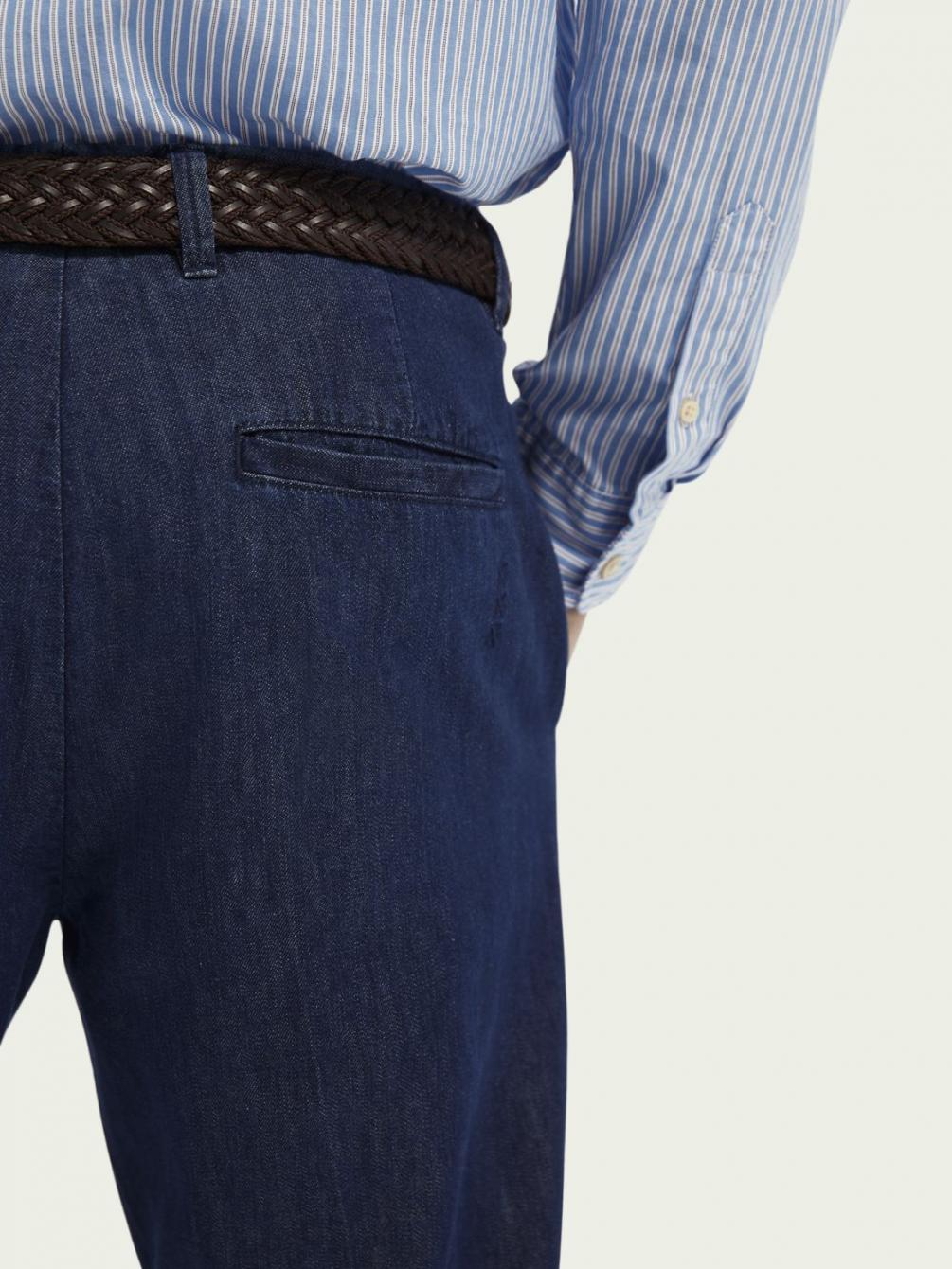 De Twilt is onze loose tapered fit chino, gestructureerd met plooien voor een elegante interpretatie van een casual silhouet. Dit seizoen voegen we er een vleugje AMS Blauw aan toe met denim van een katoenmix in een diepblauwe tint.