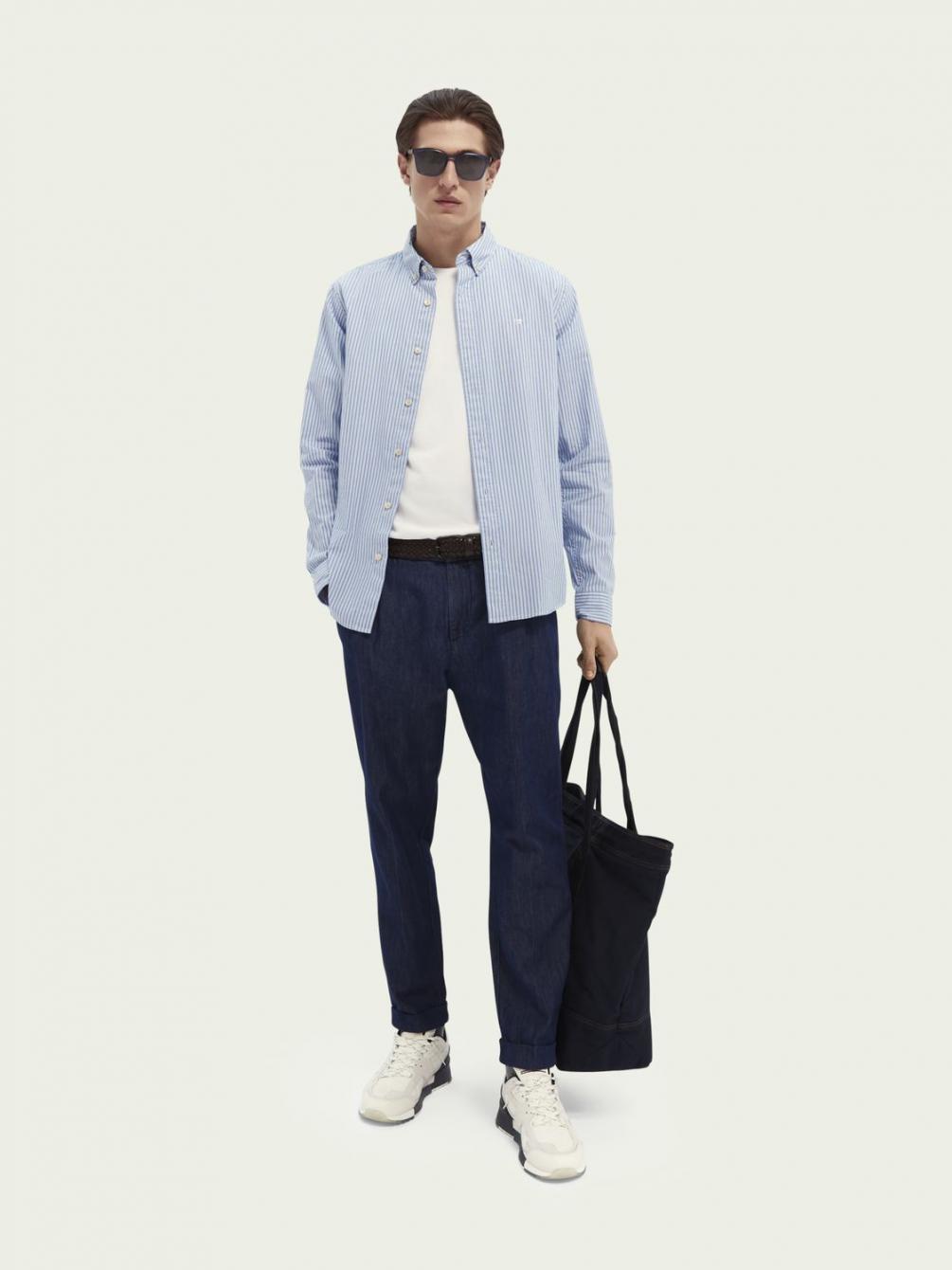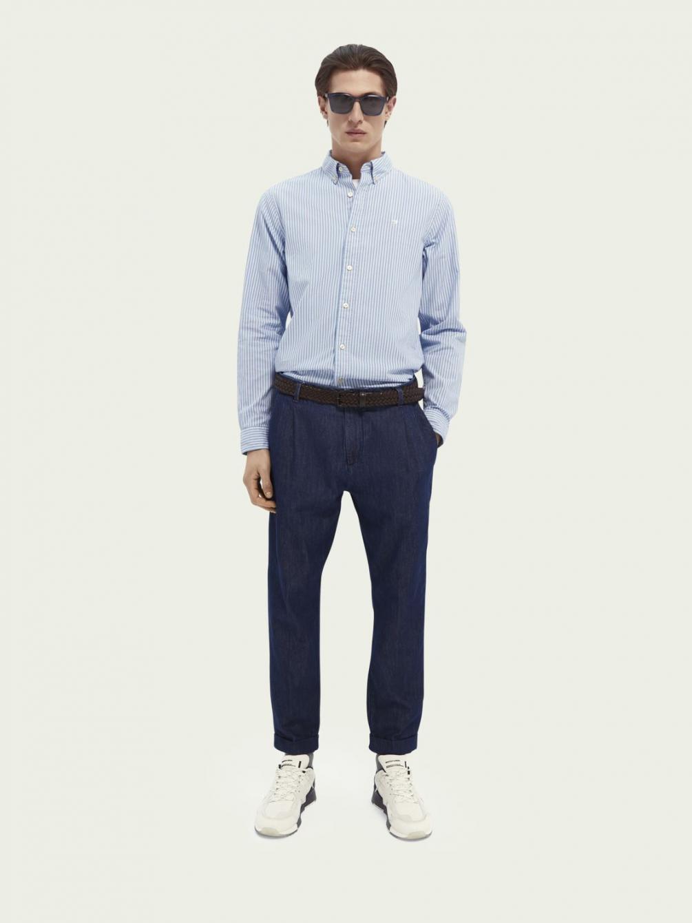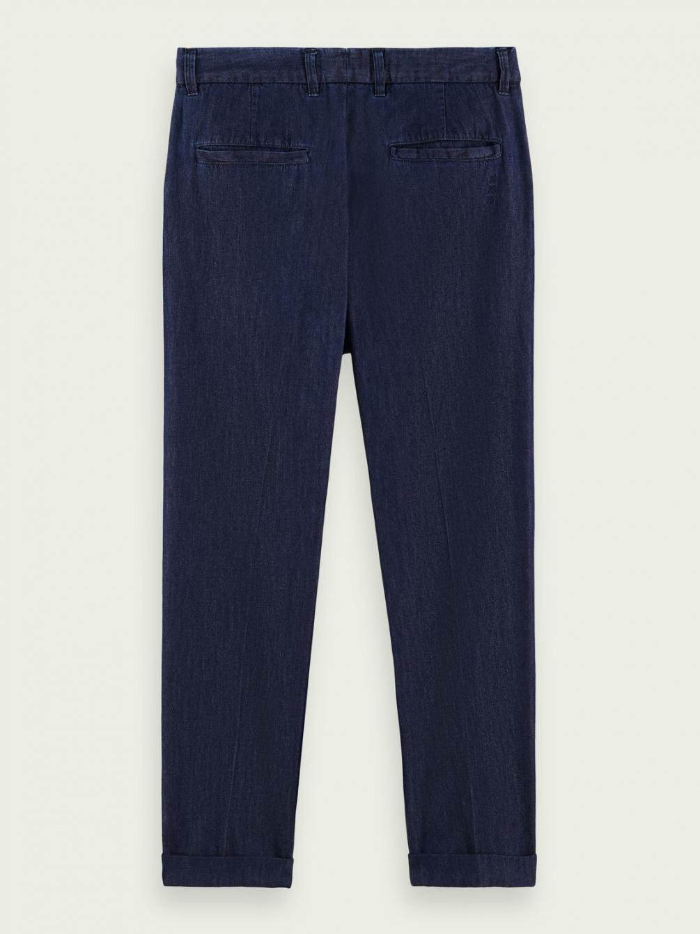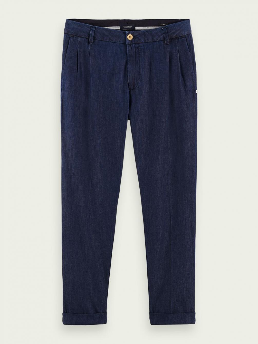 De Twilt is onze loose tapered fit chino, gestructureerd met plooien voor een elegante interpretatie van een casual silhouet. Dit seizoen voegen we er een vleugje AMS Blauw aan toe met denim van een katoenmix in een diepblauwe tint.