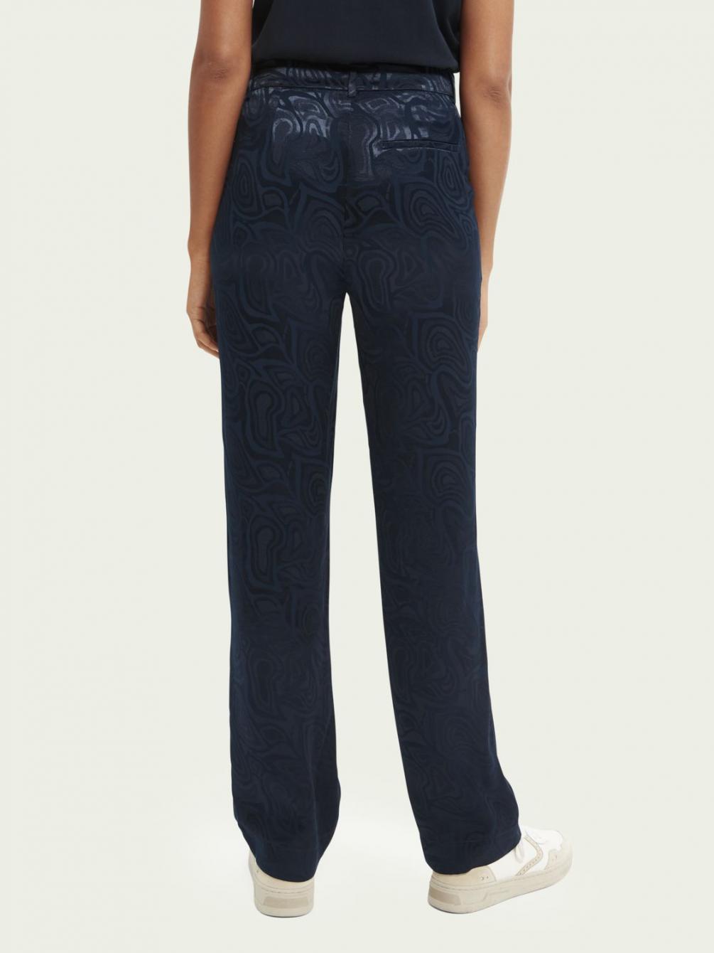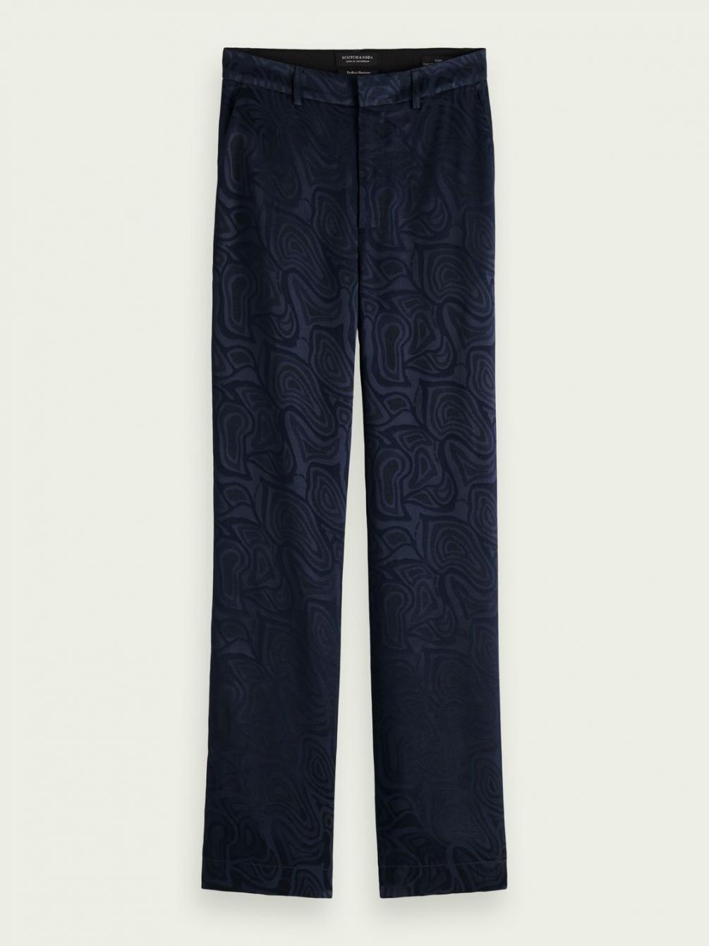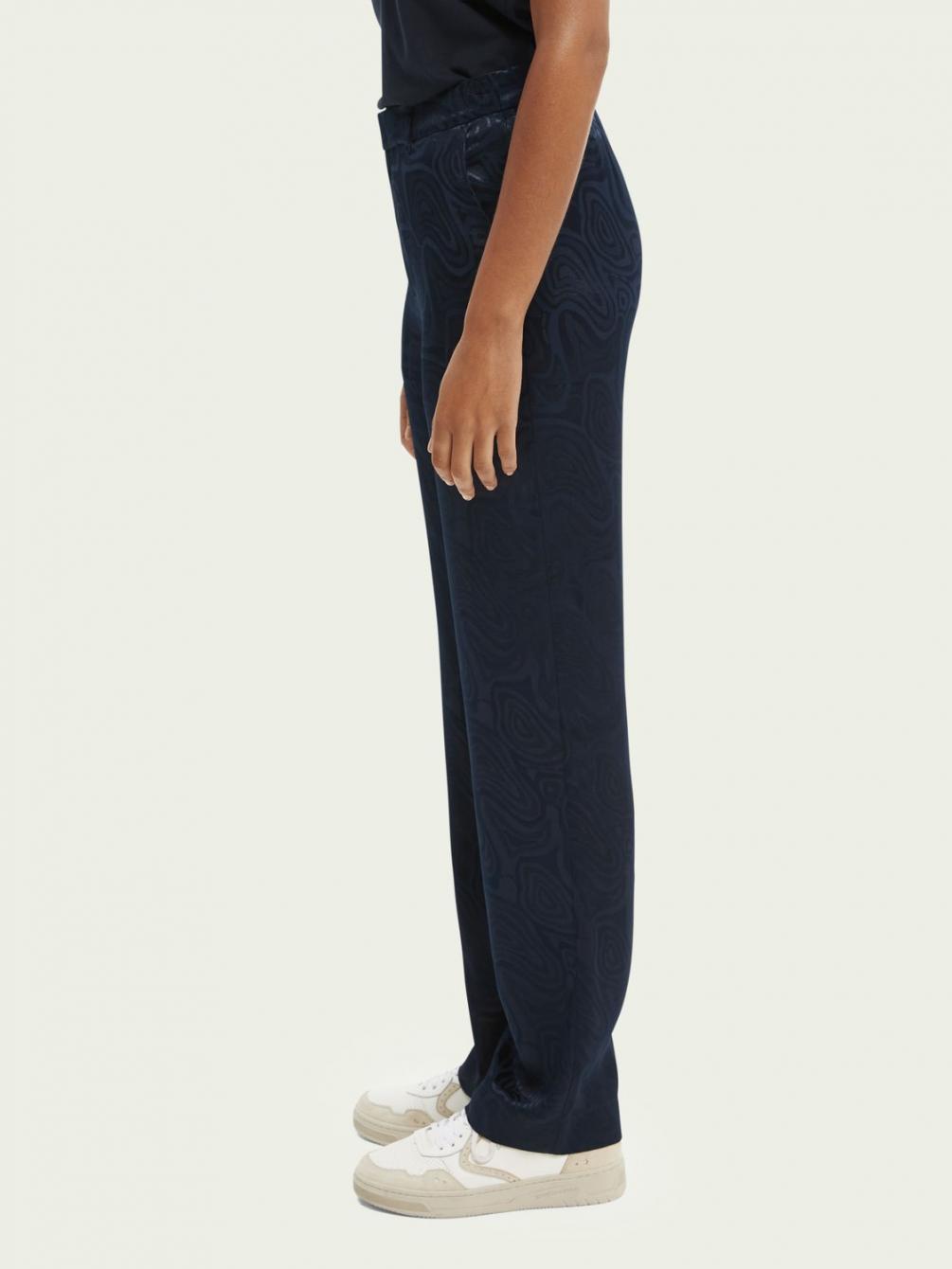 Deze broek is van top tot teen gedecoreerd met jacquardmotieven van organische vormen die in elkaar overvloeien. Deze mid-rise broek met wijde pijpen combineert comfort met stijl. Draag er onze bijpassende blazer bij en je look kan niet meer stuk.
