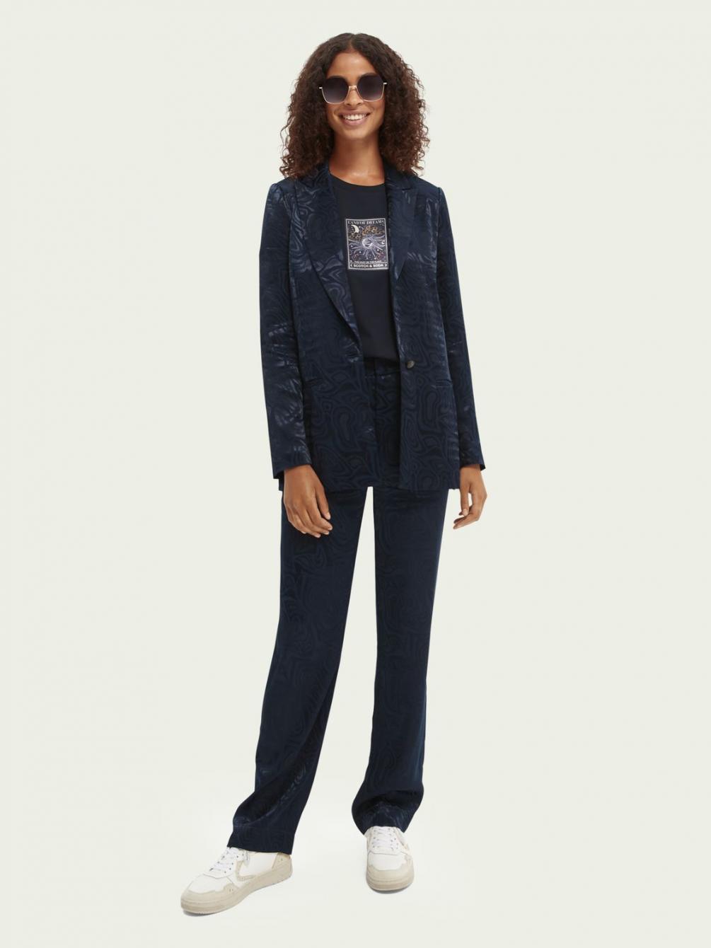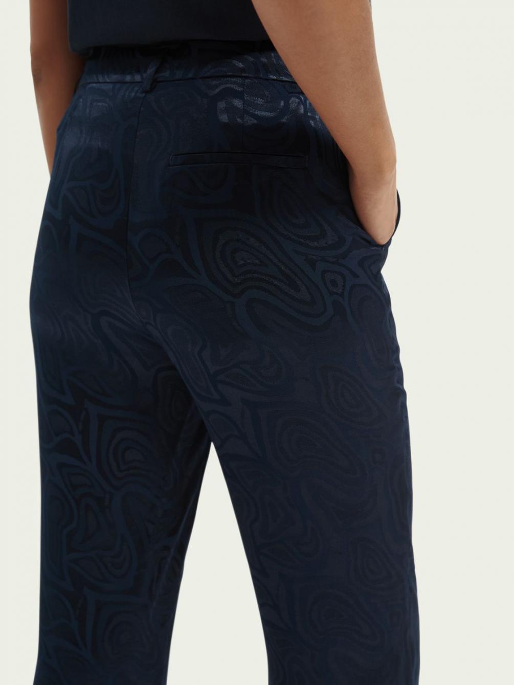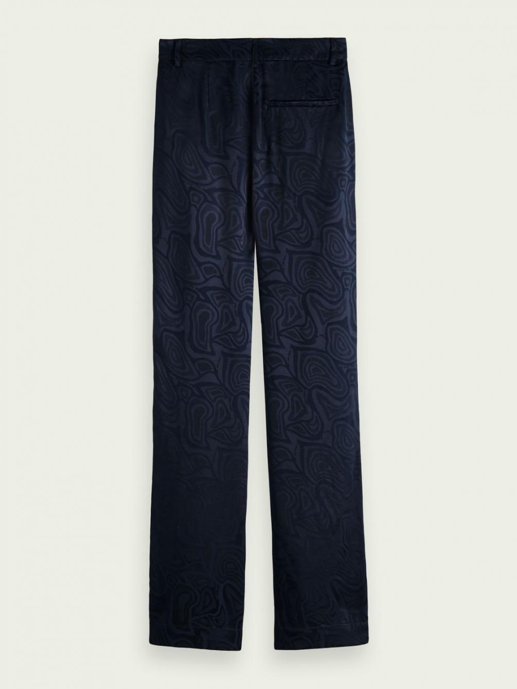 Deze broek is van top tot teen gedecoreerd met jacquardmotieven van organische vormen die in elkaar overvloeien. Deze mid-rise broek met wijde pijpen combineert comfort met stijl. Draag er onze bijpassende blazer bij en je look kan niet meer stuk.