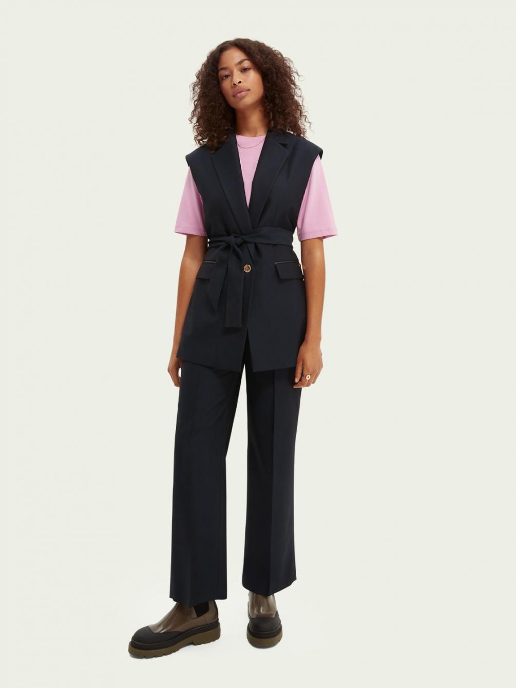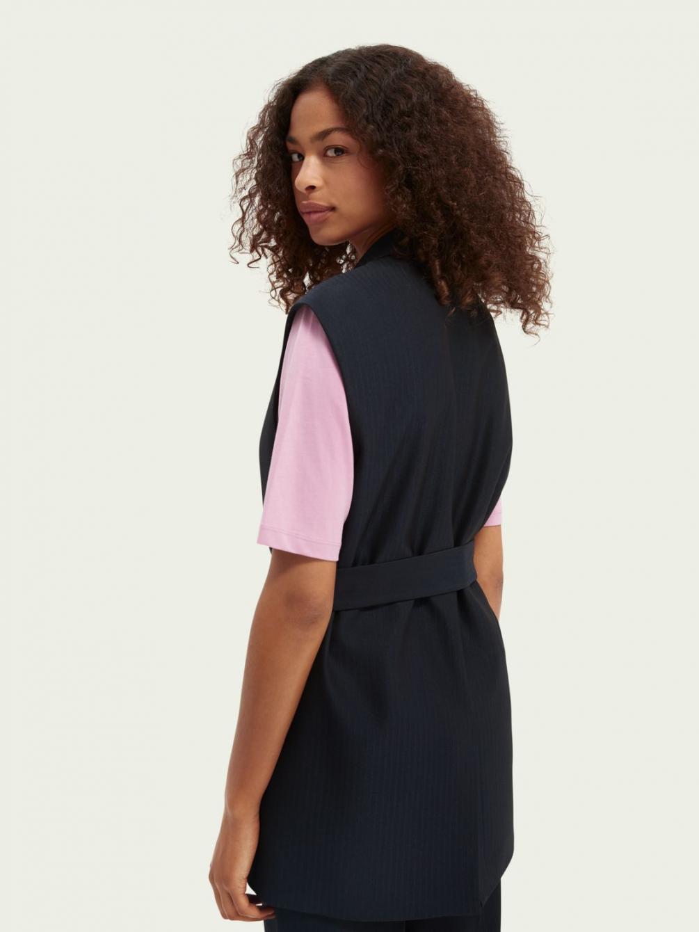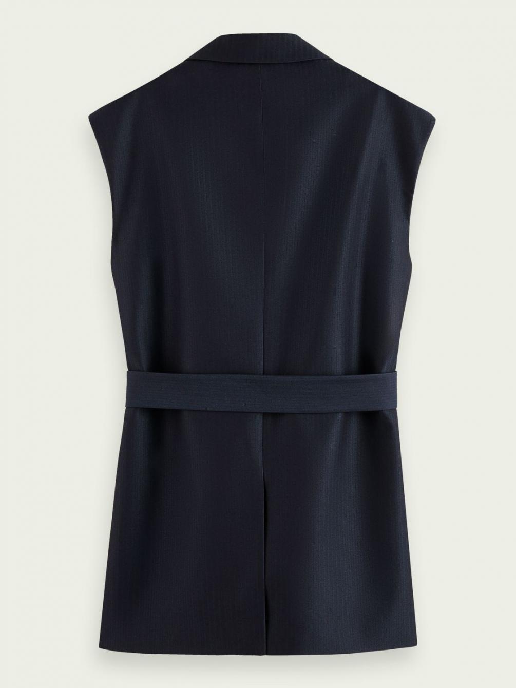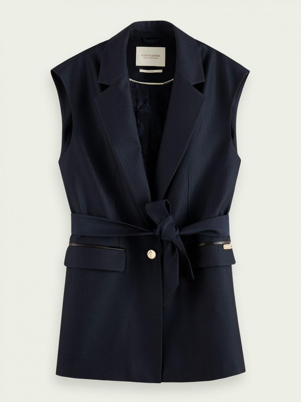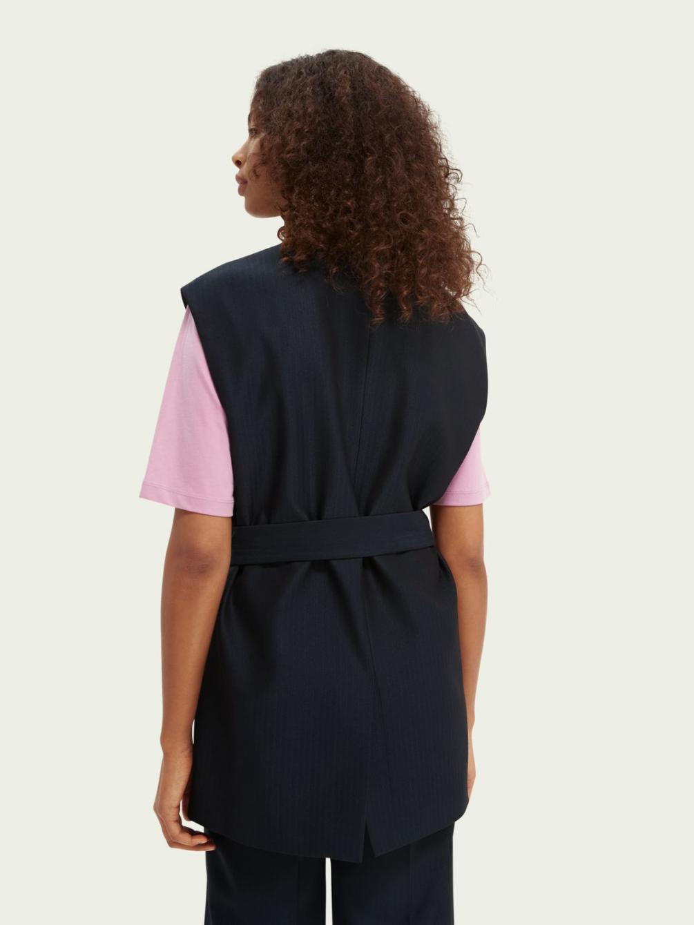 Dit oversized fit gilet in een diepe nachtblauwe tint is een perfect maatwerk item. De stoffen riem en knoopsluiting bieden de mogelijkheid om je vrouwelijke vormen te benadrukken, terwijl de klepzakken een praktische touch toevoegen. Draag dit gilet over een jurk of met een blouse en chino.
