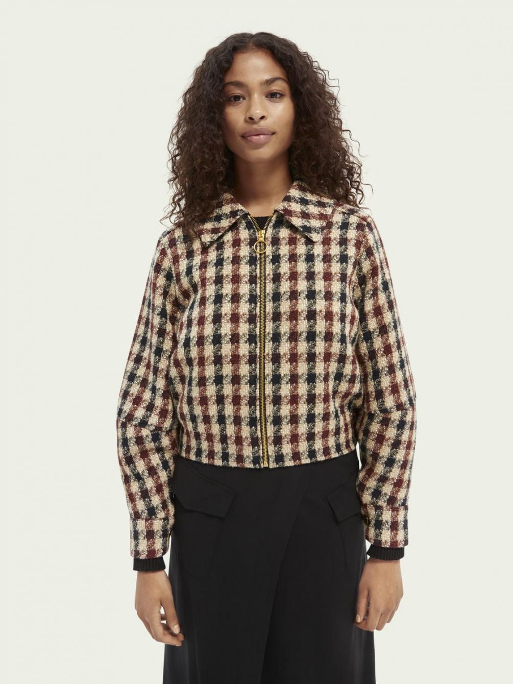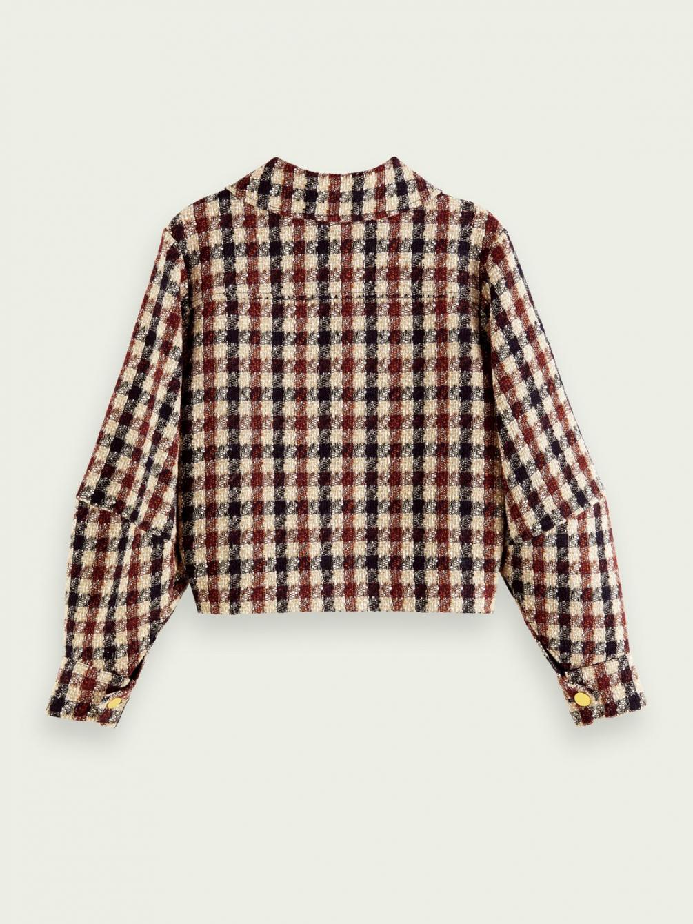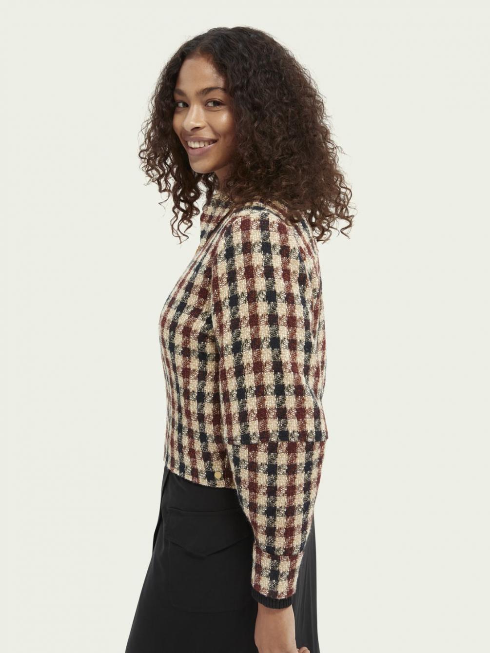 Te warm voor een jas, maar te koud voor blote armen? Ons korte jack van tweed met pied-de-poule dessin is de oplossing. De klassieke kraag en ballonmouwen geven het nog een extra boost mee en maken deze klassieker bijzonder modern.
