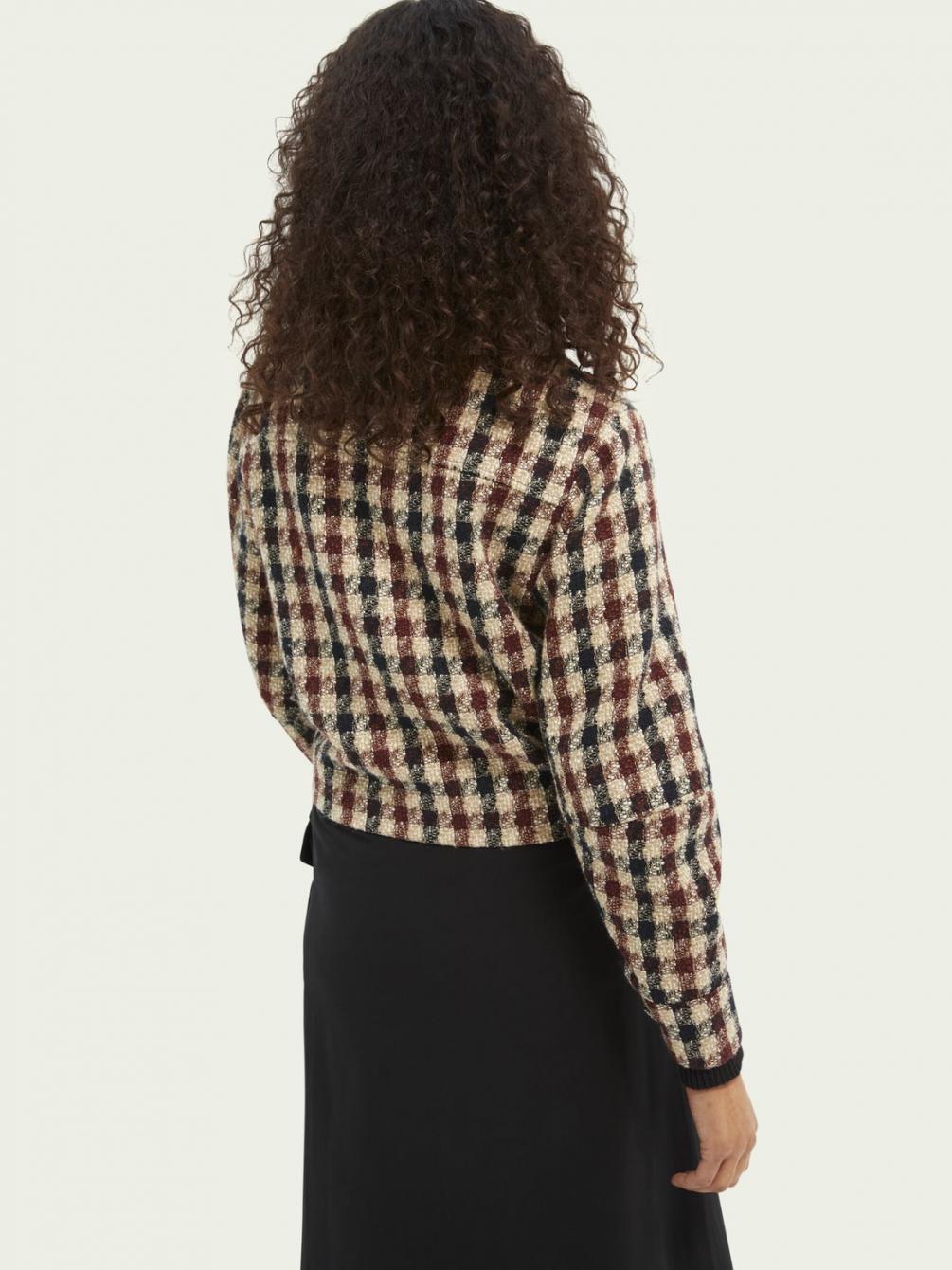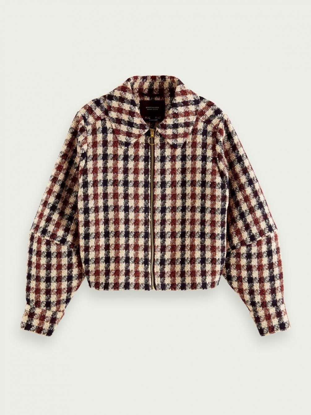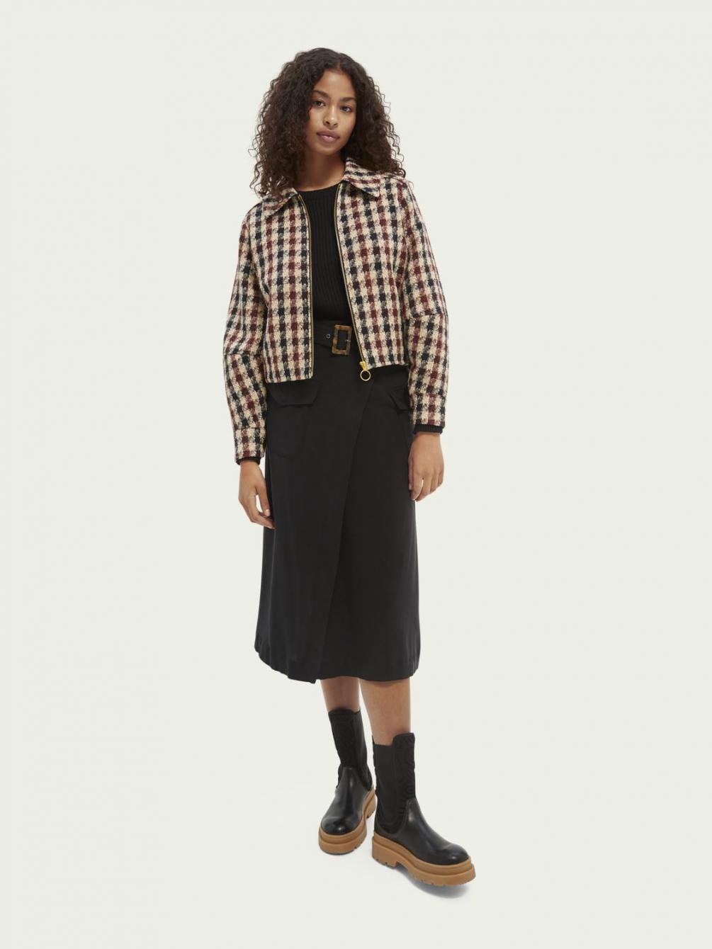 Te warm voor een jas, maar te koud voor blote armen? Ons korte jack van tweed met pied-de-poule dessin is de oplossing. De klassieke kraag en ballonmouwen geven het nog een extra boost mee en maken deze klassieker bijzonder modern.