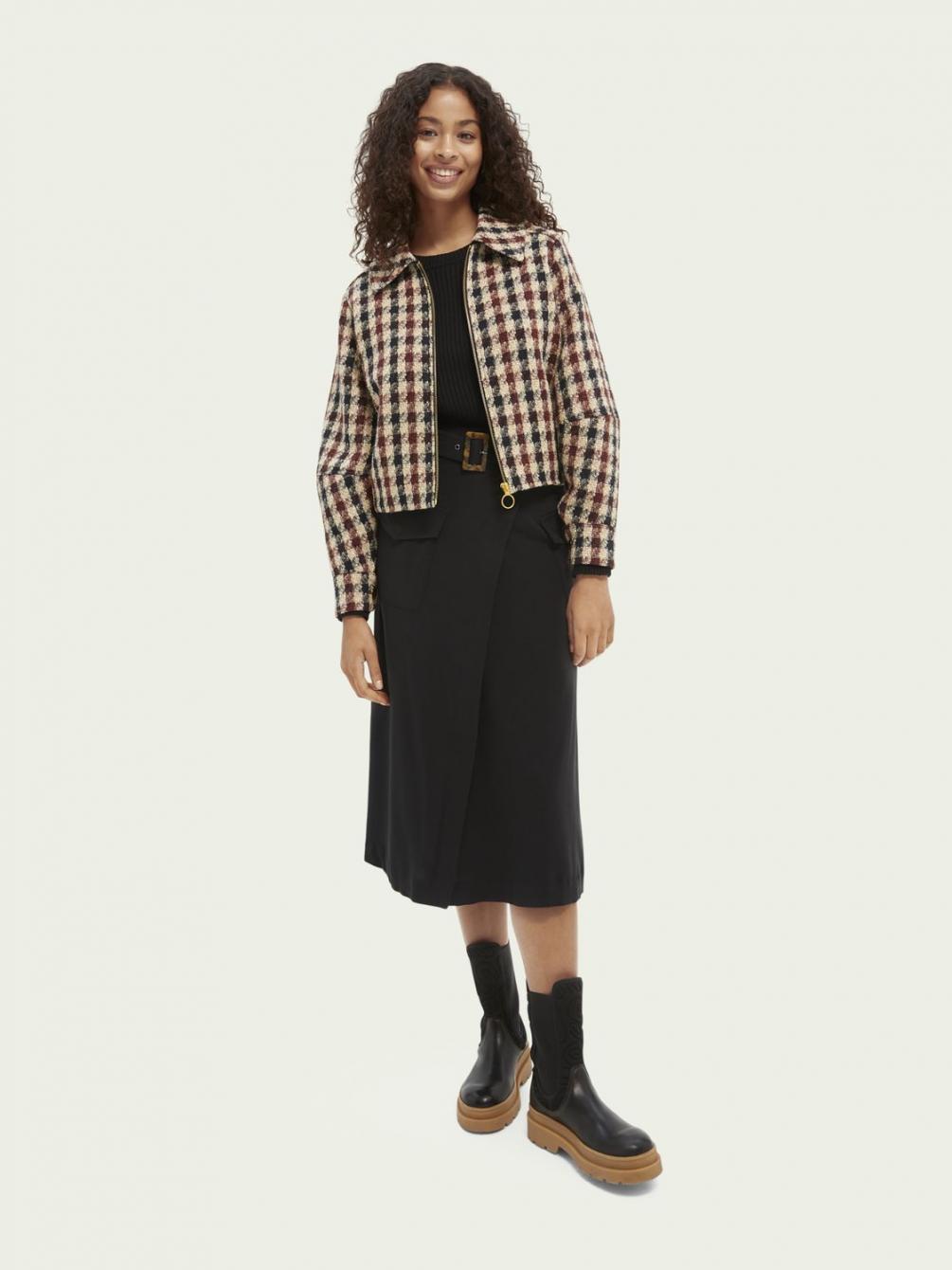 Te warm voor een jas, maar te koud voor blote armen? Ons korte jack van tweed met pied-de-poule dessin is de oplossing. De klassieke kraag en…