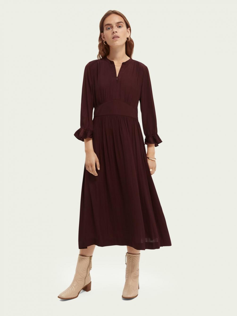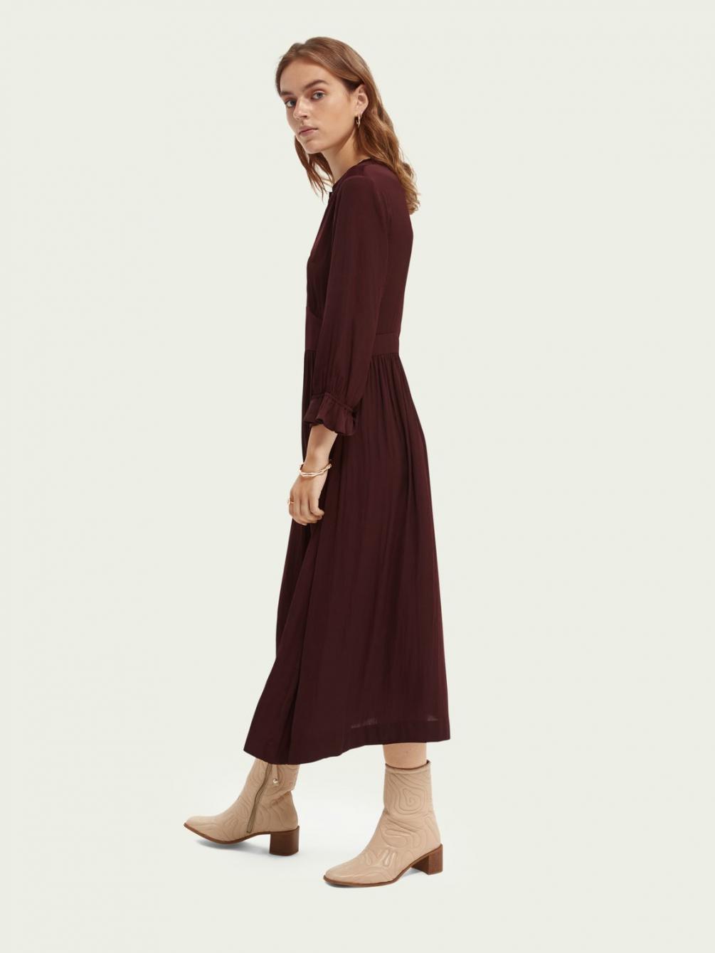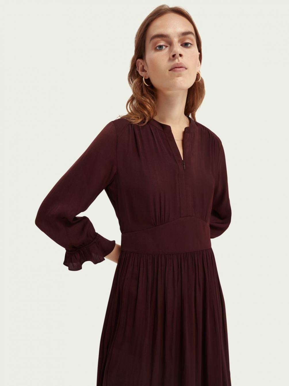 Deze midi-jurk zit boordevol beeldige details, zoals de V-hals met knoopsluiting, zodat je zelf kunt bepalen hoe diep je de hals wilt dragen. De ballonmouwen met ruches aan de manchetten geven deze look nog een extra boost. Deze jurk is getailleerd voor een vrouwelijke look.