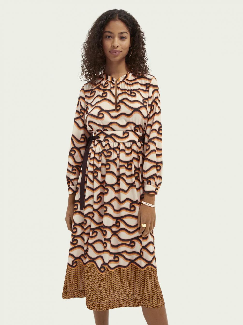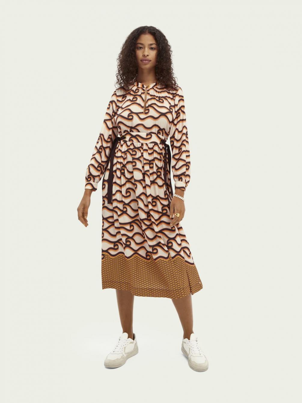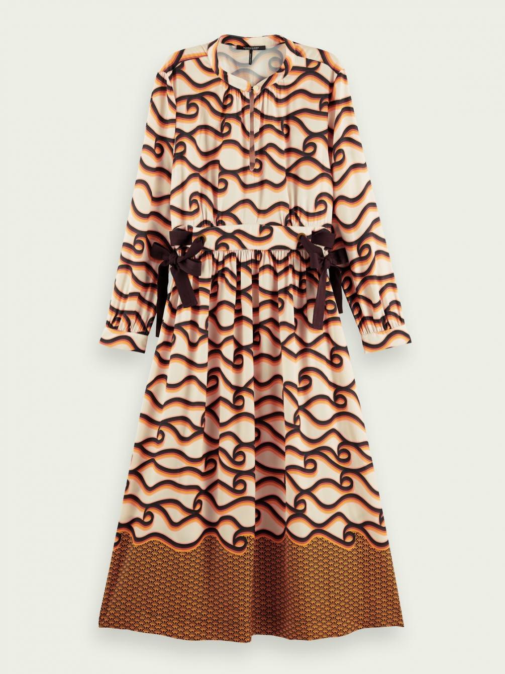 Deze midi-jurk zit boordevol beeldige details die dit item een onderscheidende look geven, zoals het knoopje aan de bovenkant van de V-hals. De volumineuze mouwen en de prachtige print maken het nog specialer. Je kunt de vrouwelijke vormen accentueren door de bandjes aan beide zijkanten van de jurk te strikken.