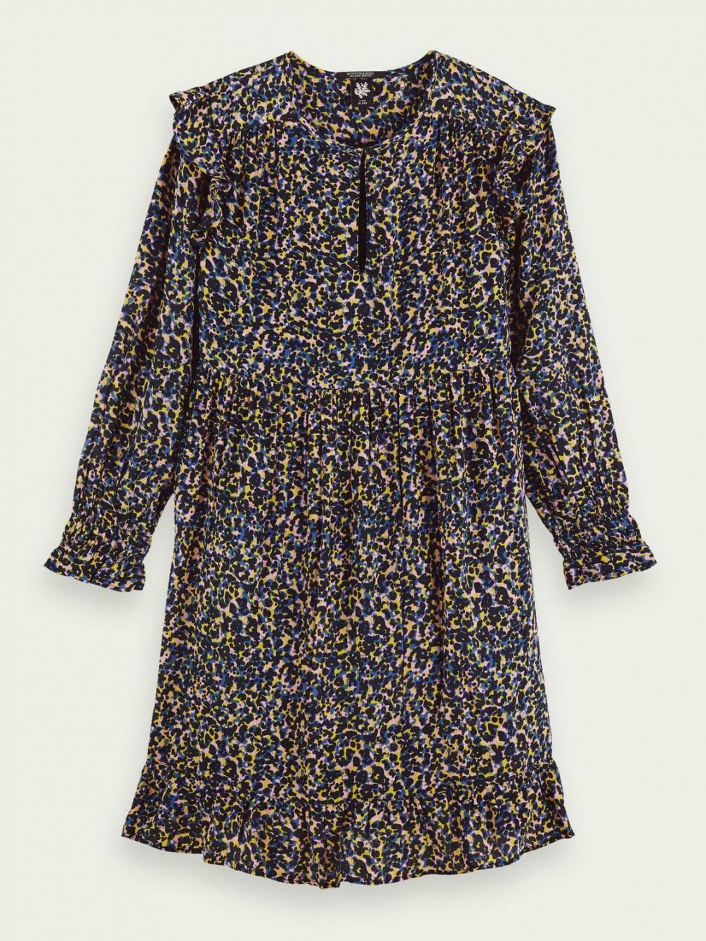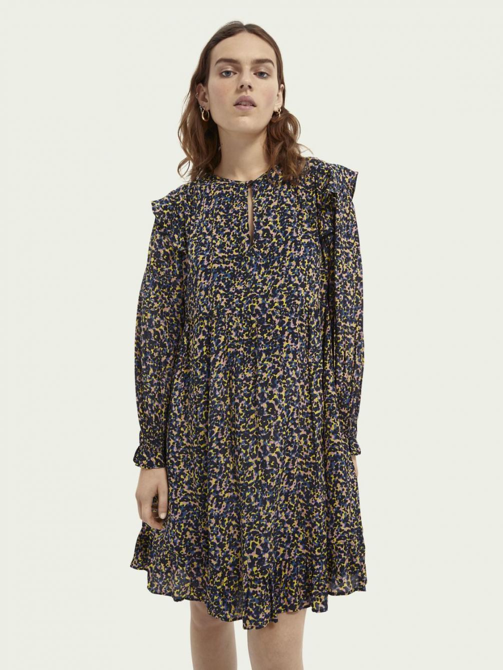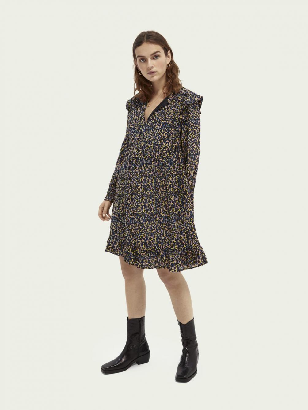 Mix een vrolijke print met ruches en je hebt onze nieuwste jurk. Het A-lijn-model is afgewerkt met opvallende ruches aan de schouders en subtiele ruches aan de zoom. Het knoopje aan de hals is de finishing touch; zo kun je zelf bepalen hoe diep je de hals wilt dragen. Met een paar stevige laarzen eronder heb je toch nog een festivalgevoel.