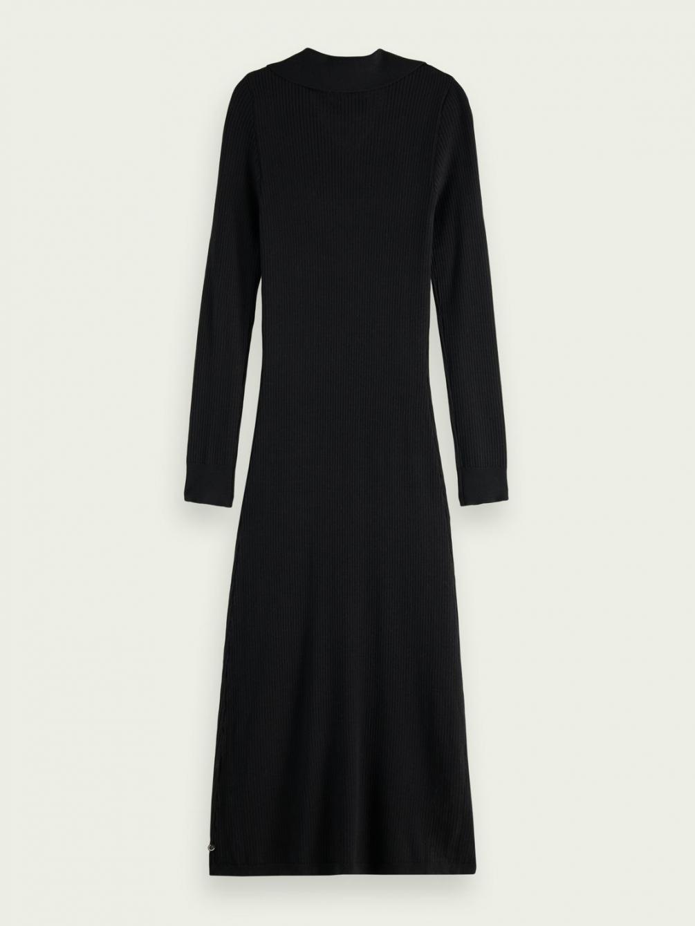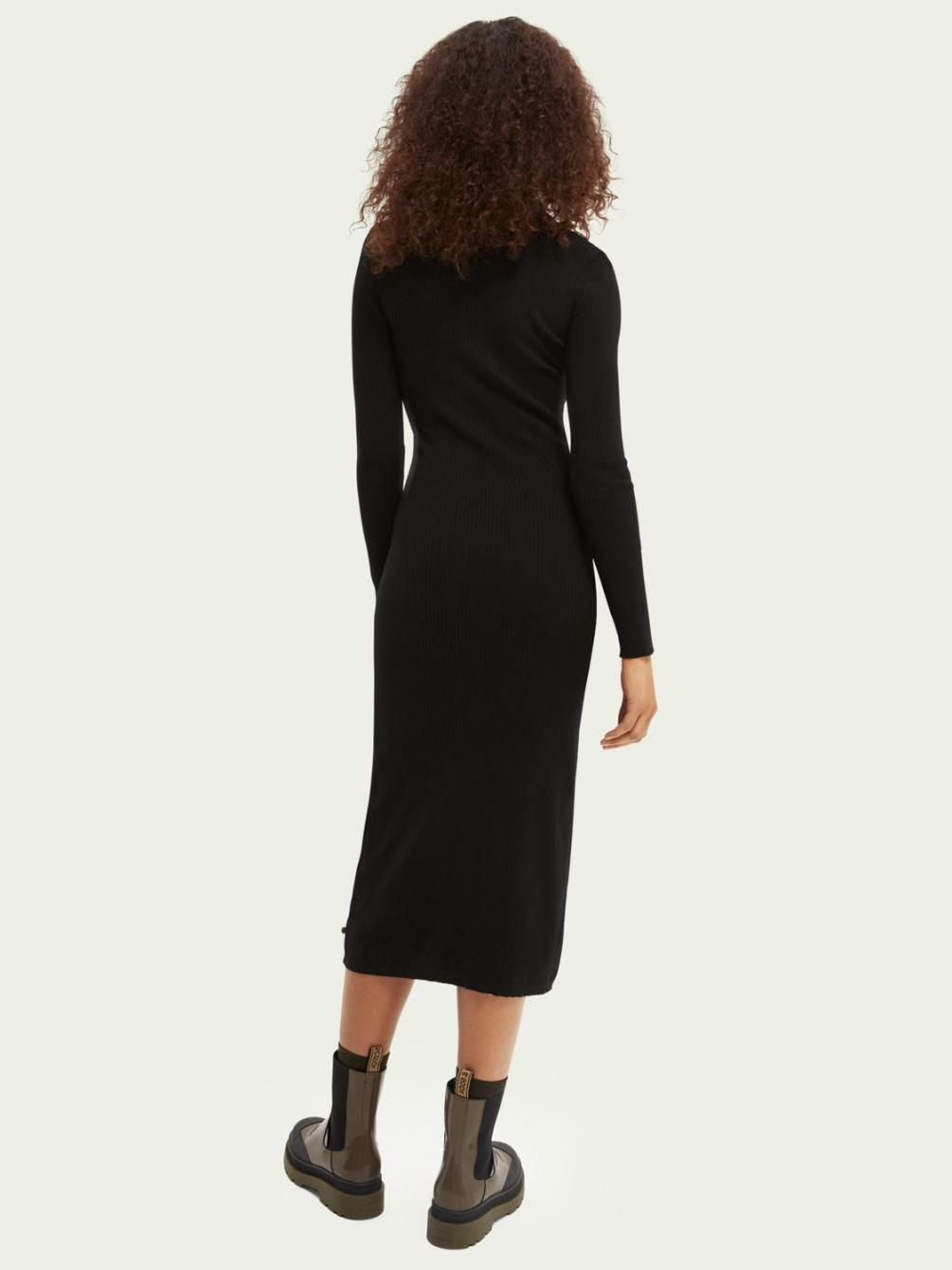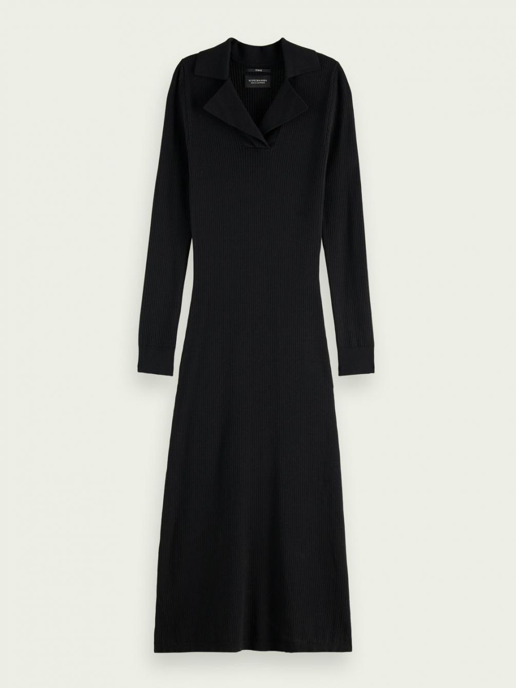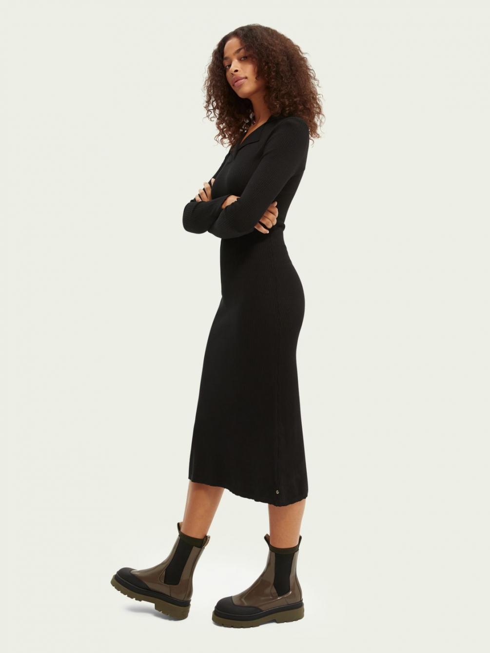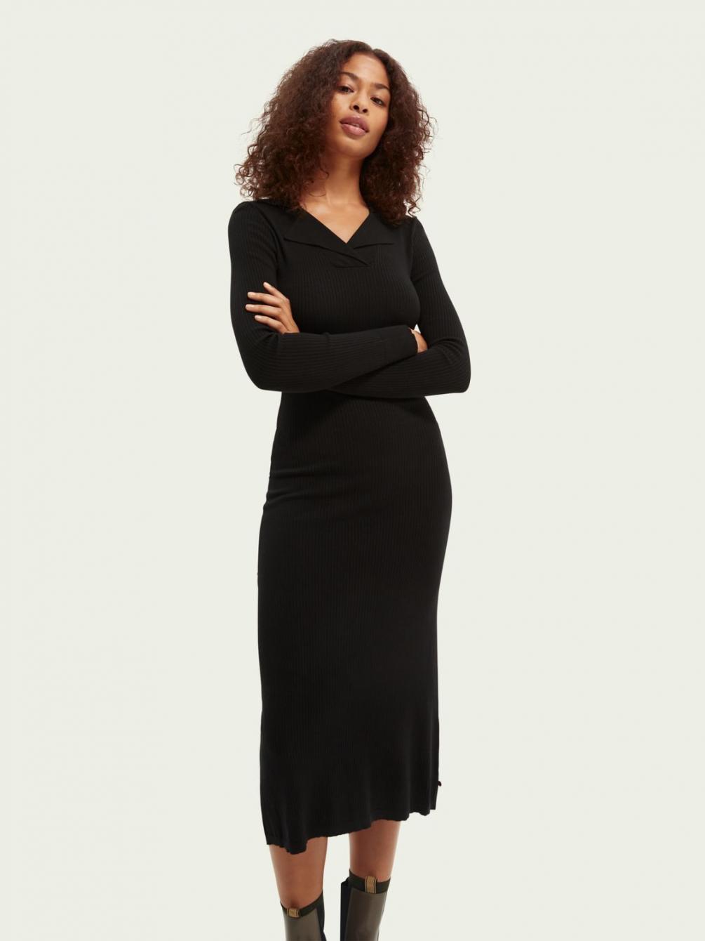 Deze midi-jurk met een diepe V-hals met kraag geeft je garderobe een vleugje ‘oh la la’. De hoogwaardige uitstraling is te danken aan het ribgebreide materiaal. Perfect voor iedere gelegenheid.