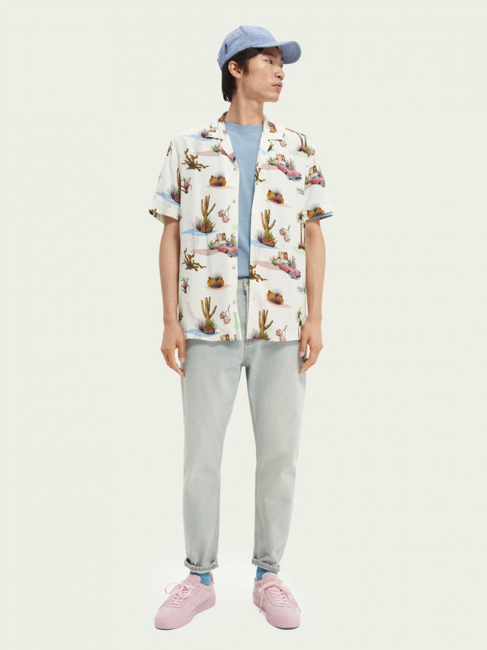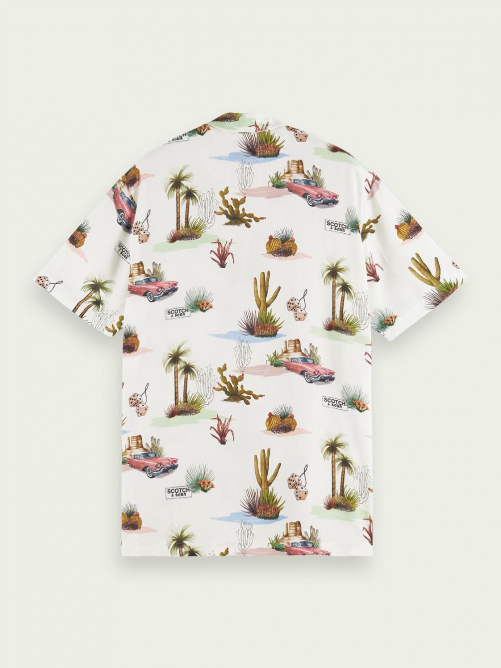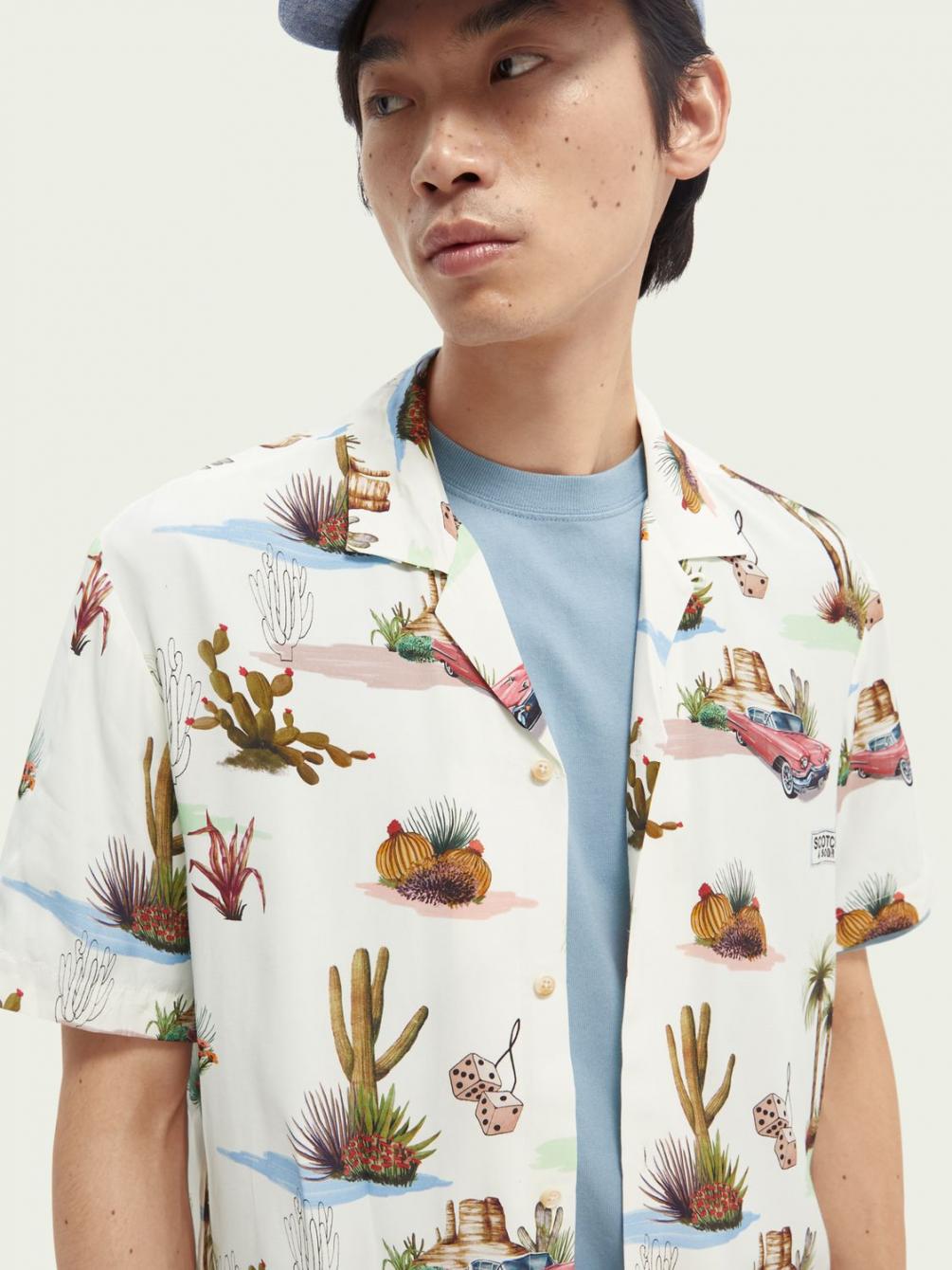 Relax in Hawaïaanse sferen met ons overhemd met korte mouwen. De klassieke wijde kraag, palmboomprint en wijde mouwen geven deze stijl eilandvibes….