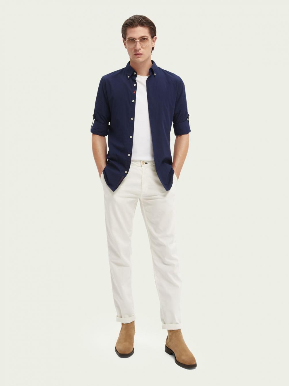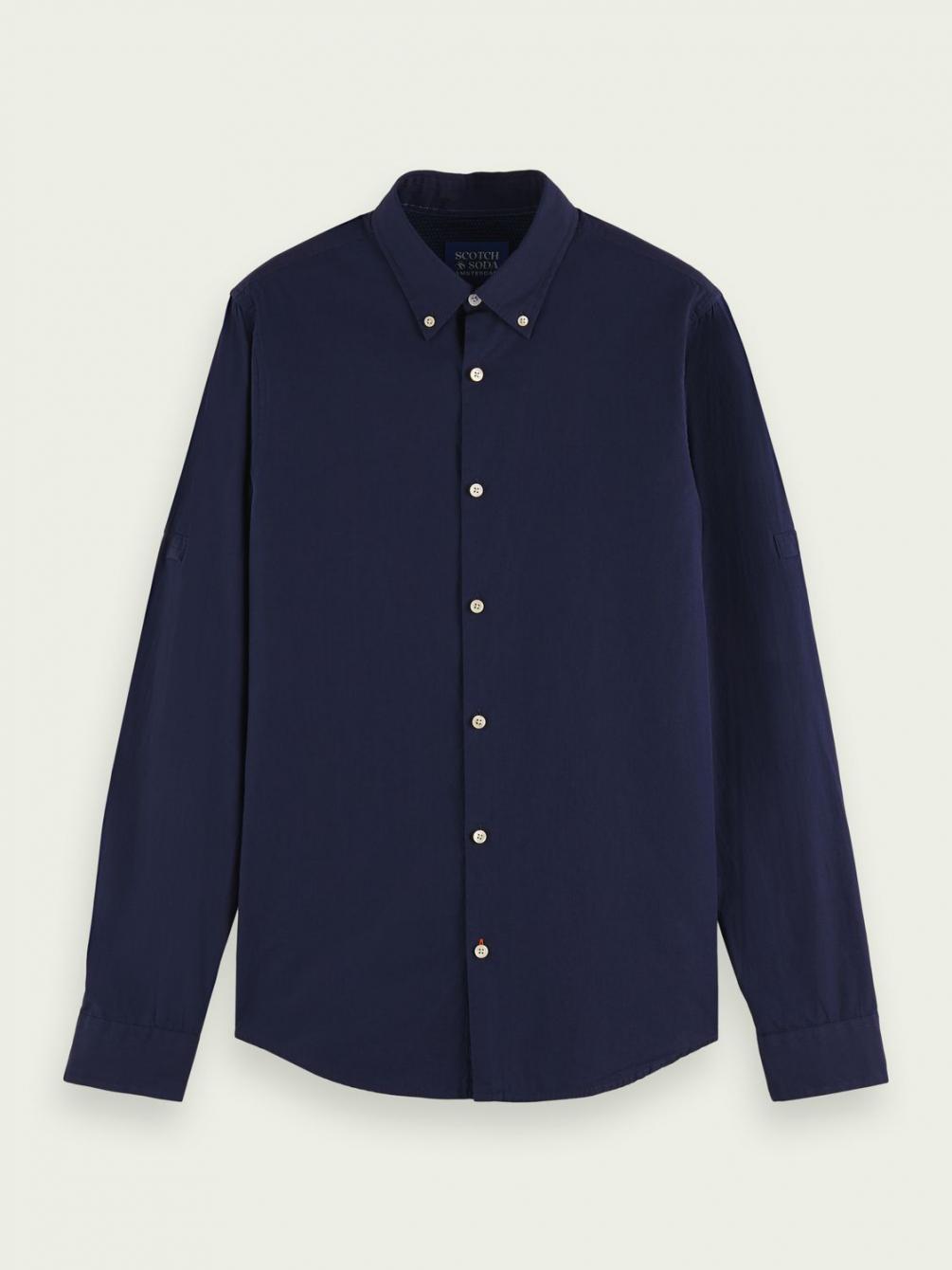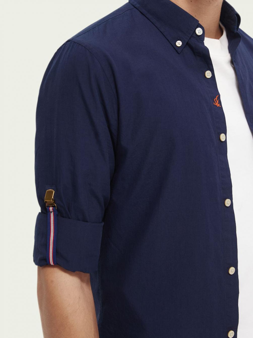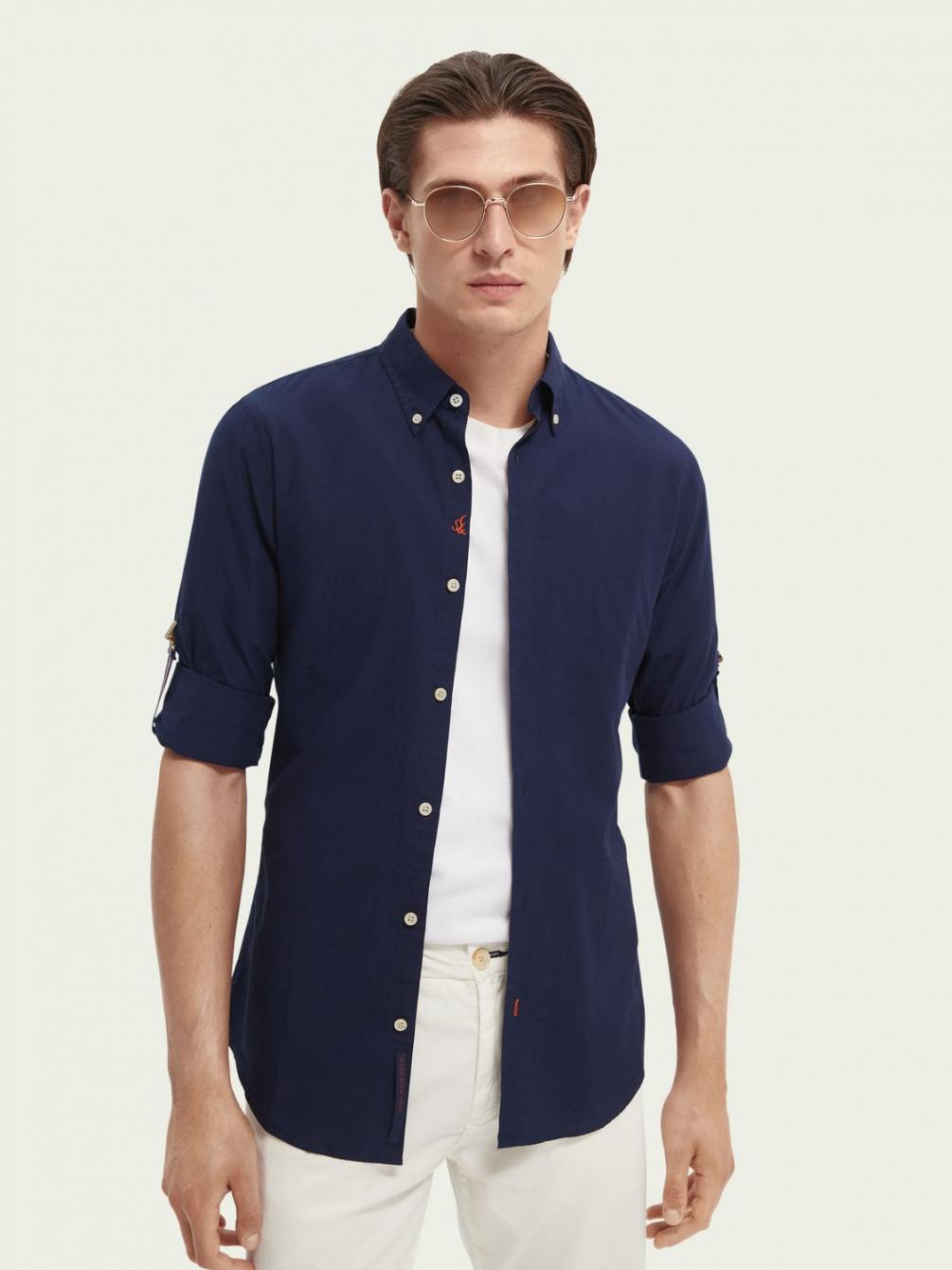 Dit overhemd is gemaakt van 100% katoen, niet meer en niet minder. Het is een veelzijdige variant van onze slim fit met knoopsluiting. Dankzij de mouwophouders is dit ontwerp makkelijk aan te passen aan het weer en de gelegenheid. Van een picknick in het park tot een vergadering op het werk, je kunt dit overhemd voor alles aantrekken.