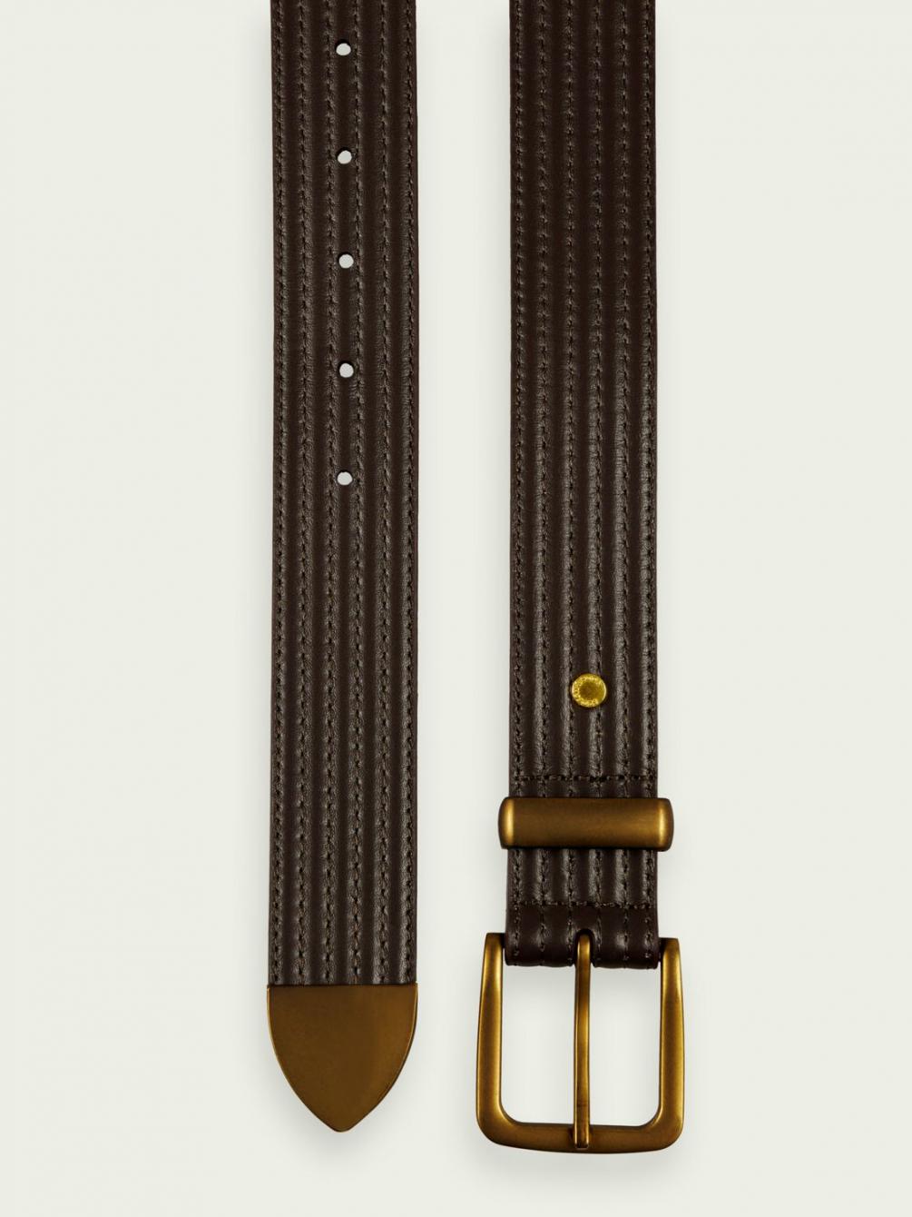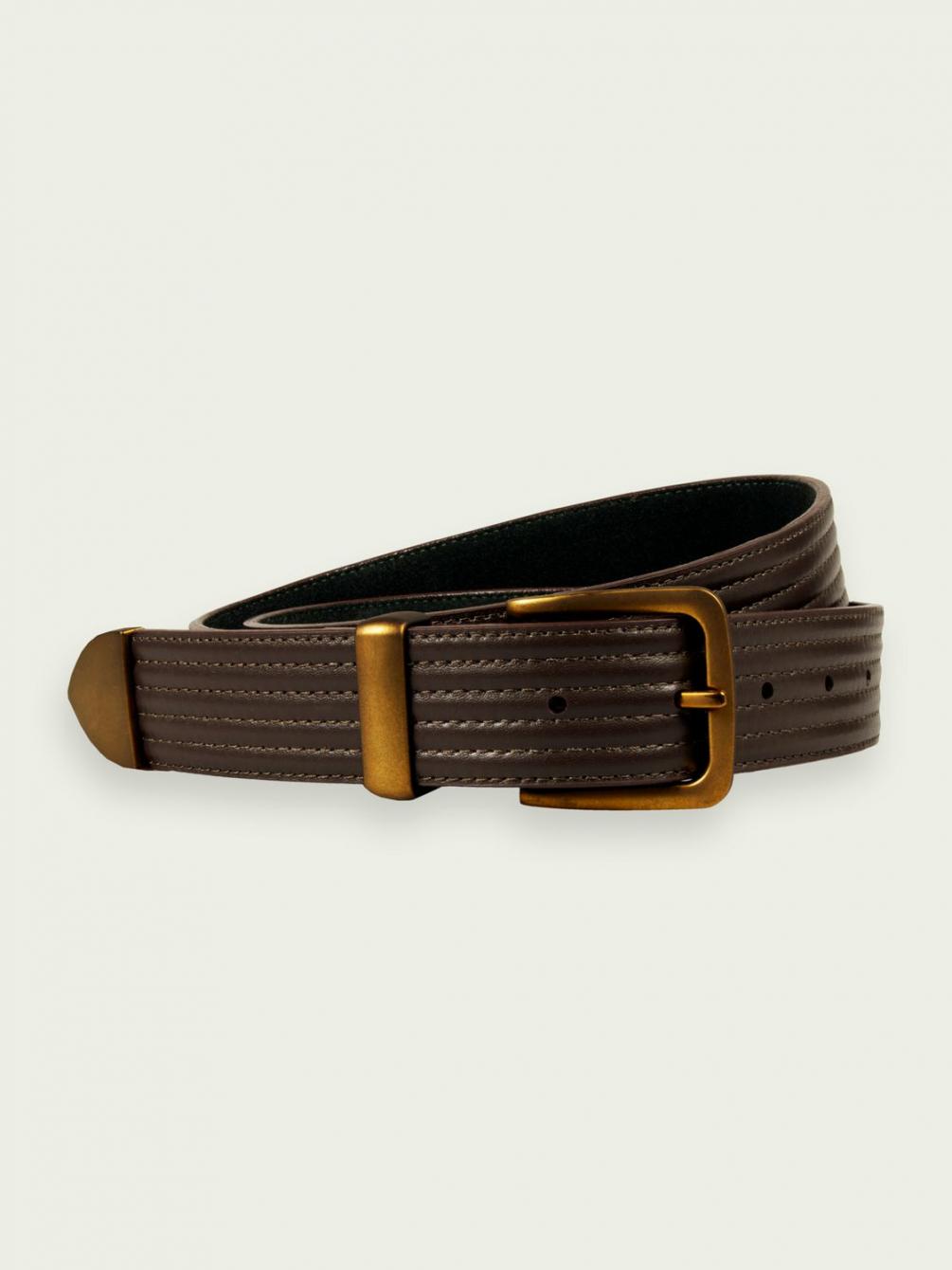 Deze leren riem met bronskleurige metalen details en gestikte accenten is een tijdloze stijl. Je kunt hem bijna overal bij dragen; deze riem zal iedere look een boost geven.