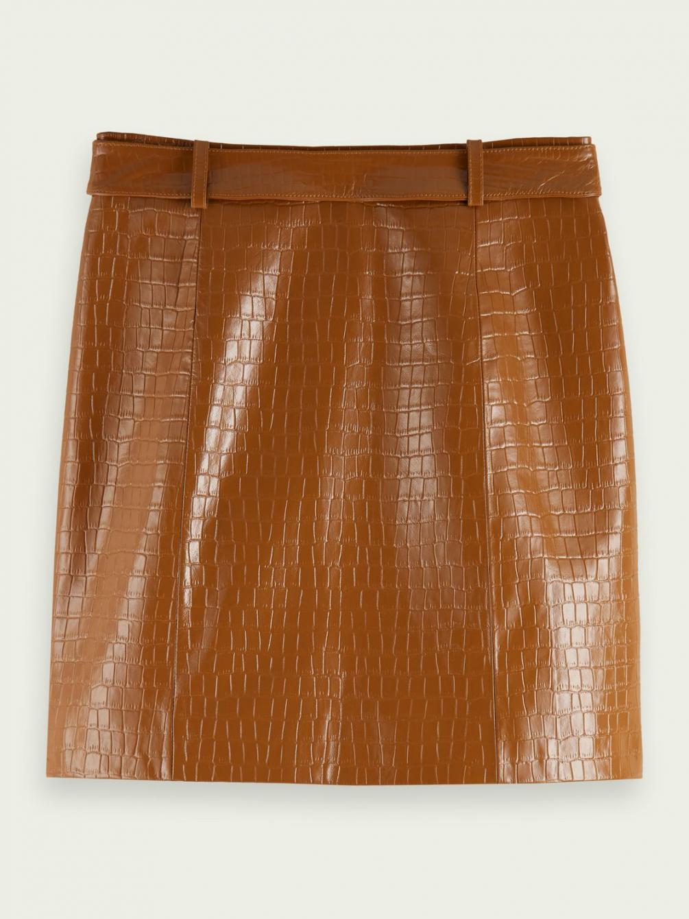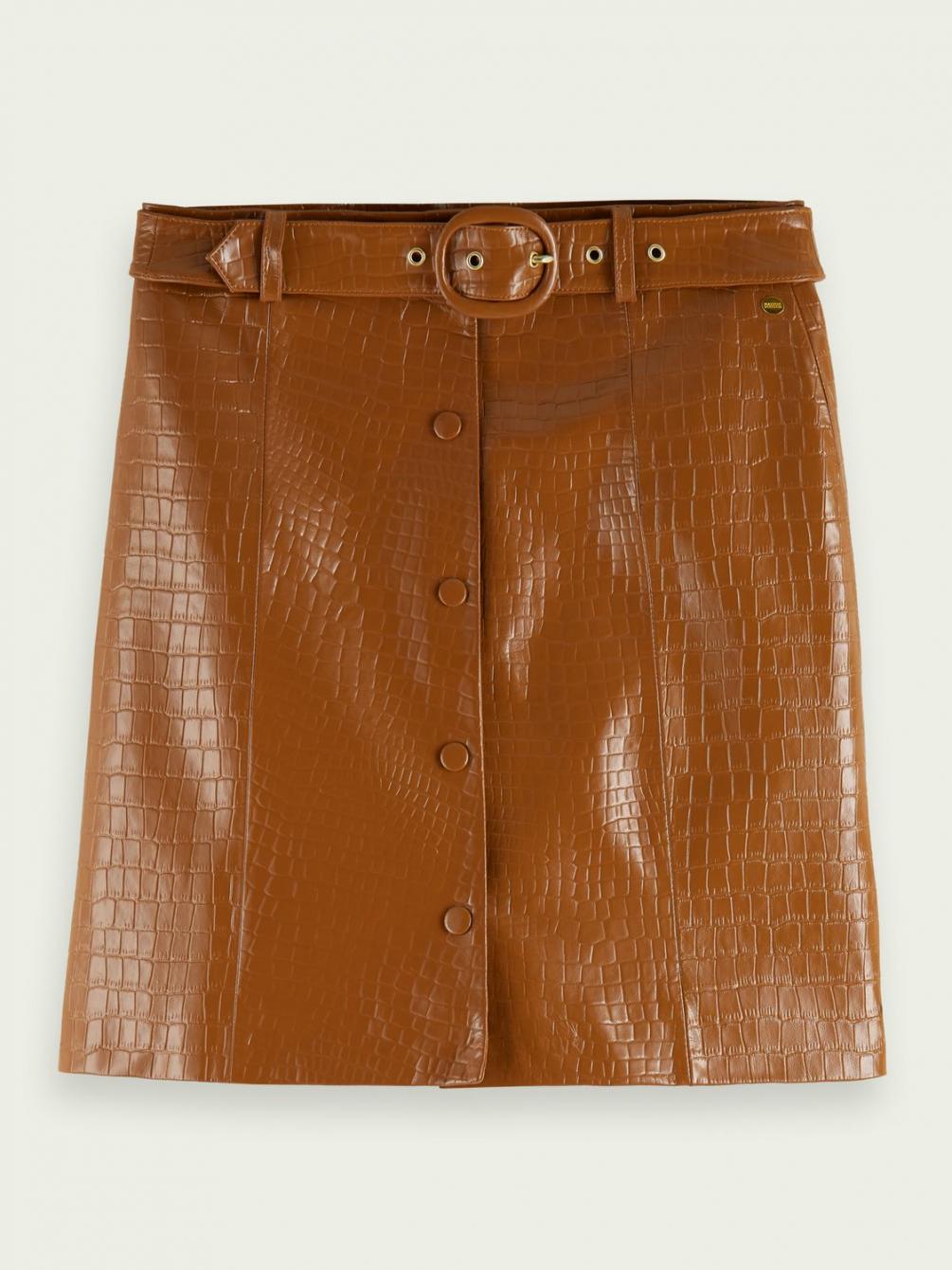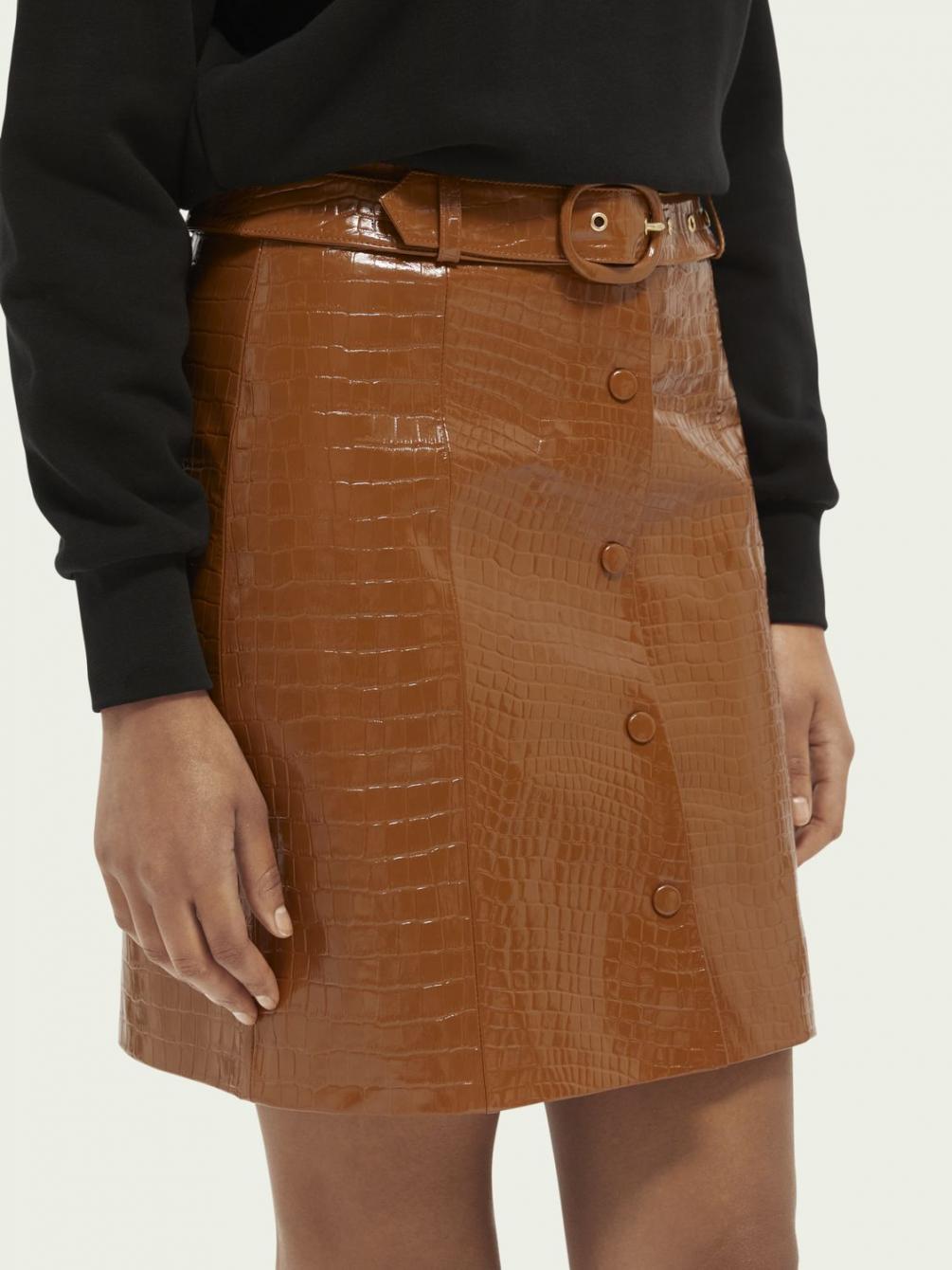 Deze rok heeft alles in zich om je een geweldig gevoel te geven. Zoals het kroko-effect, de knoopsluiting en als finishing touch de riem. Draag er een eenvoudige blouse boven, want deze blikvanger verdient alle aandacht.