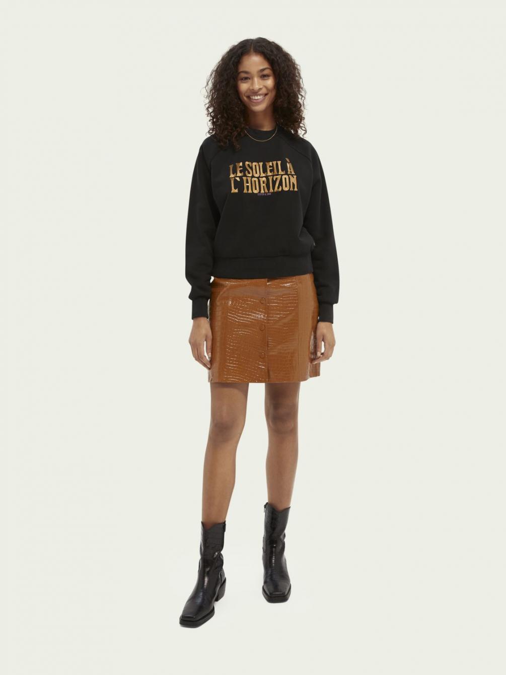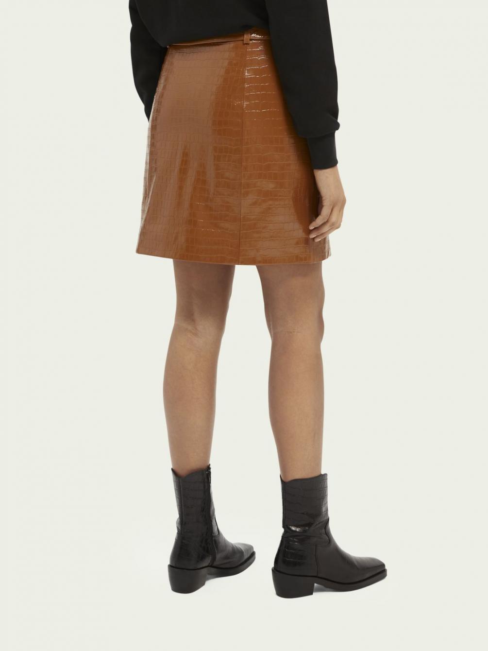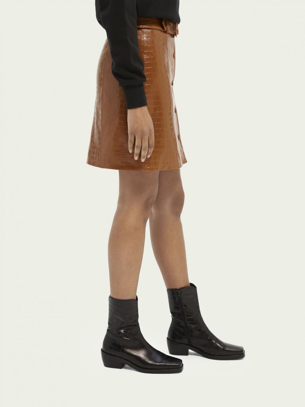 Deze rok heeft alles in zich om je een geweldig gevoel te geven. Zoals het kroko-effect, de knoopsluiting en als finishing touch de riem. Draag er een eenvoudige blouse boven, want deze blikvanger verdient alle aandacht.