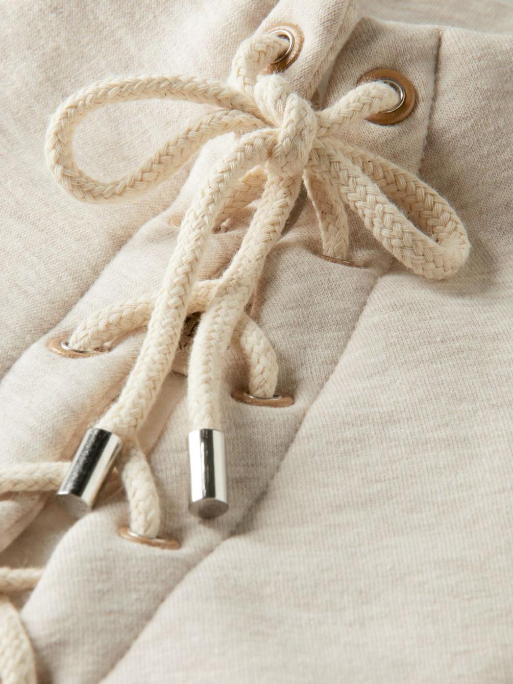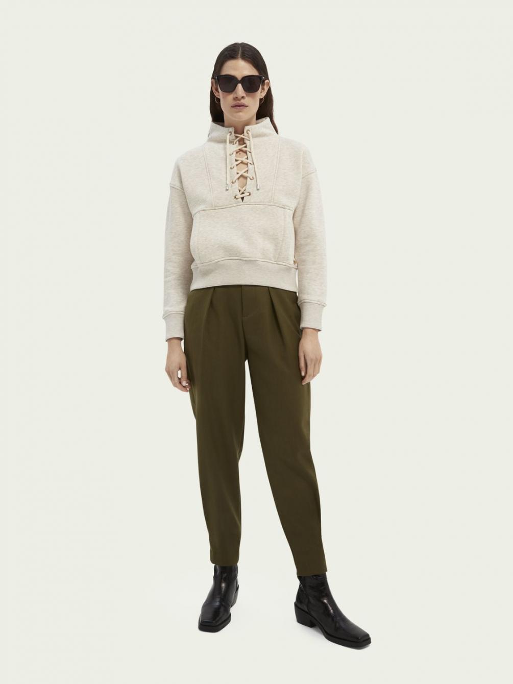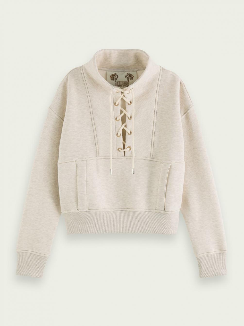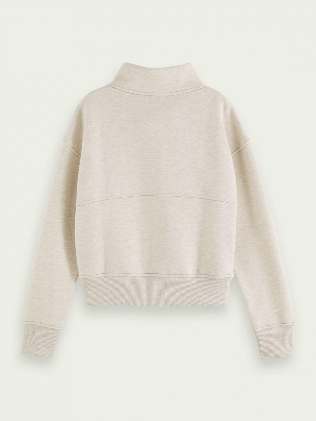 Een boxy model met utility-details. Deze sweater is gemaakt van gemêleerd materiaal in gebroken wit en afgewerkt met een halve vetersluiting en hoge hals.