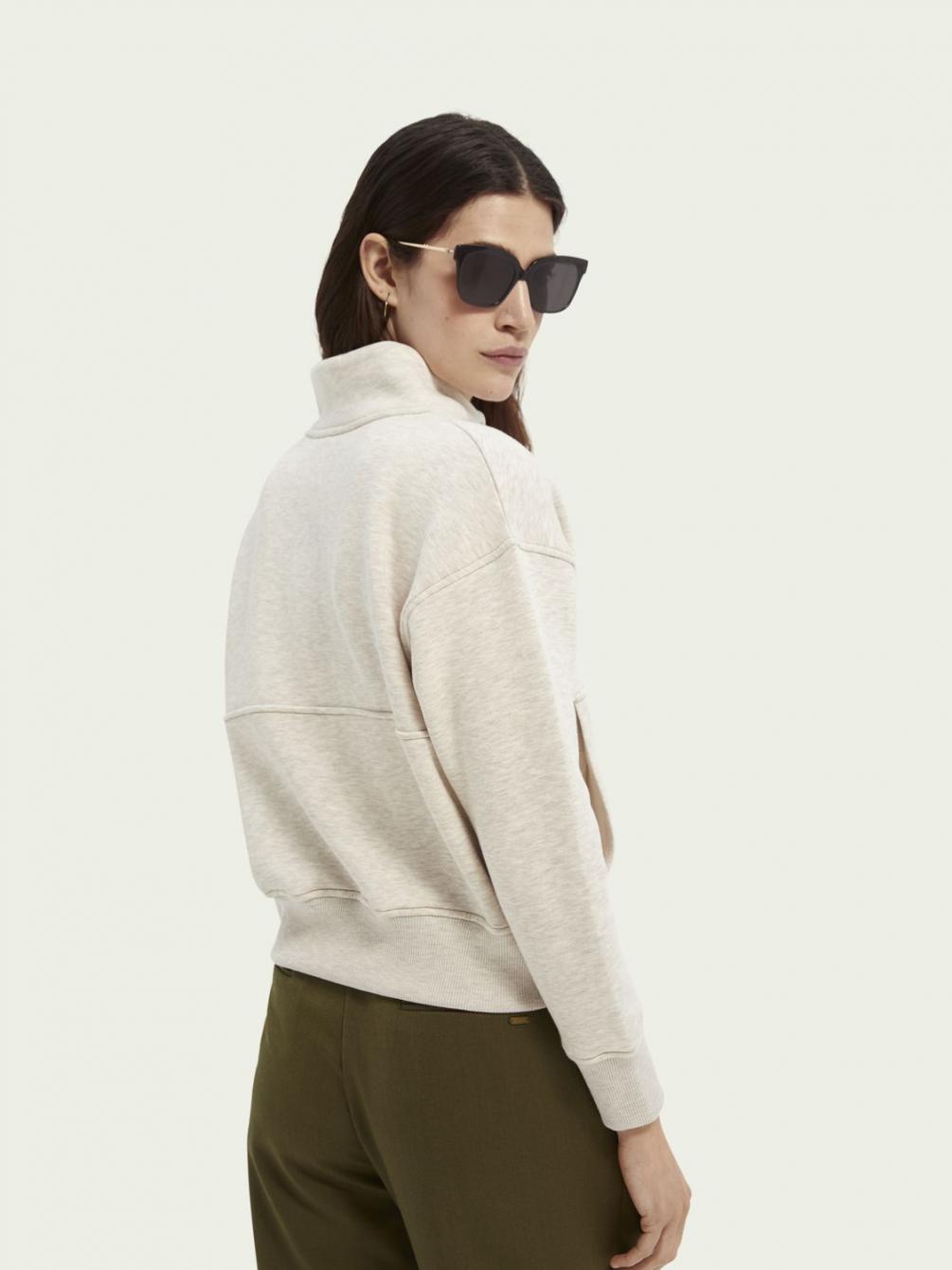 Een boxy model met utility-details. Deze sweater is gemaakt van gemêleerd materiaal in gebroken wit en afgewerkt met een halve vetersluiting en hoge hals….