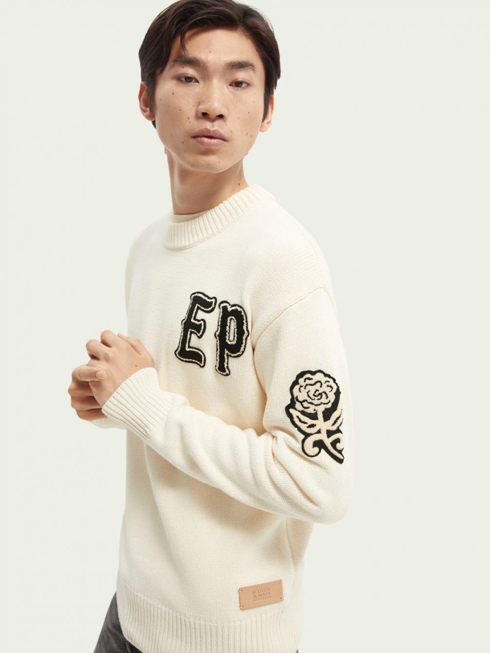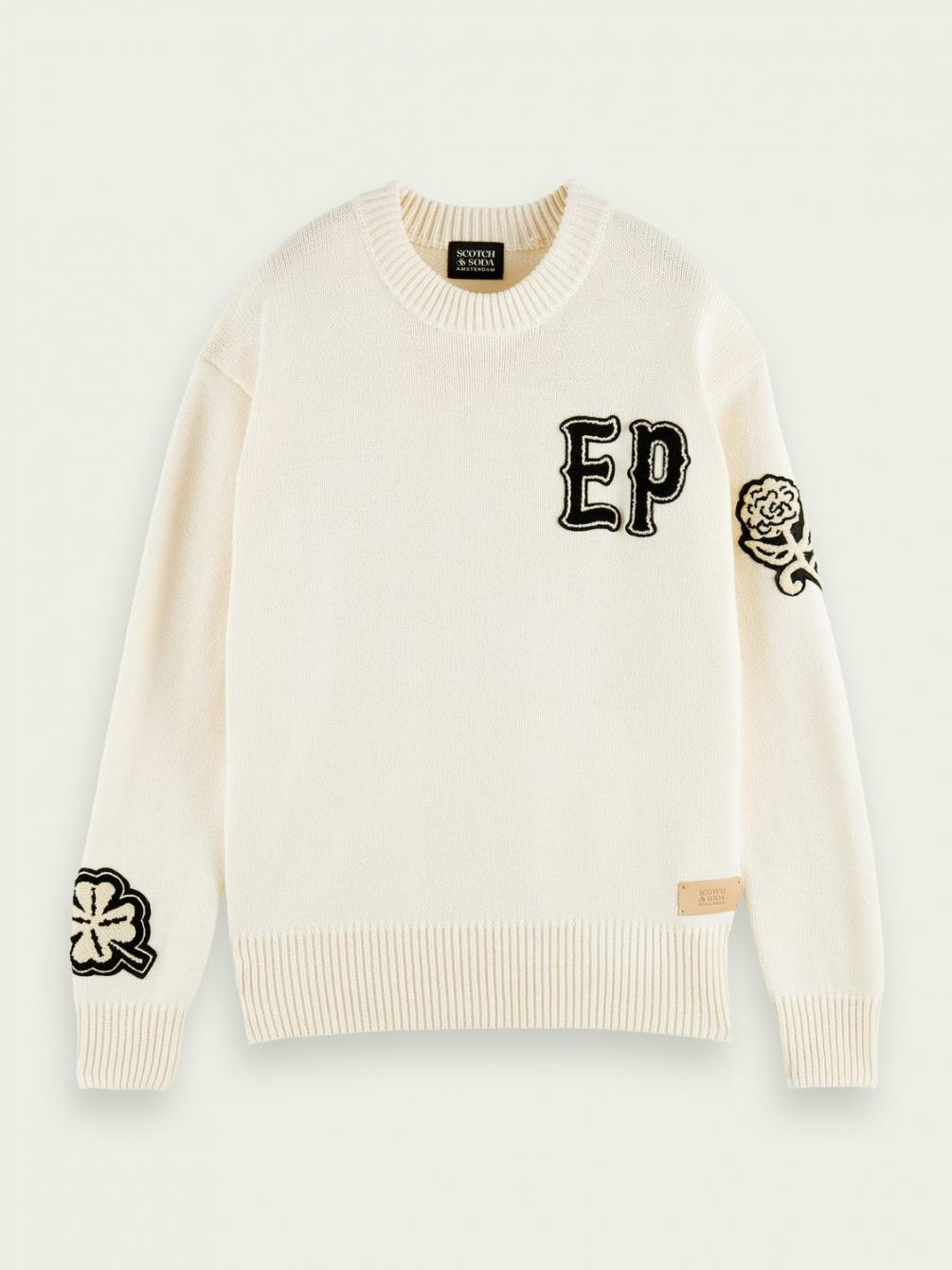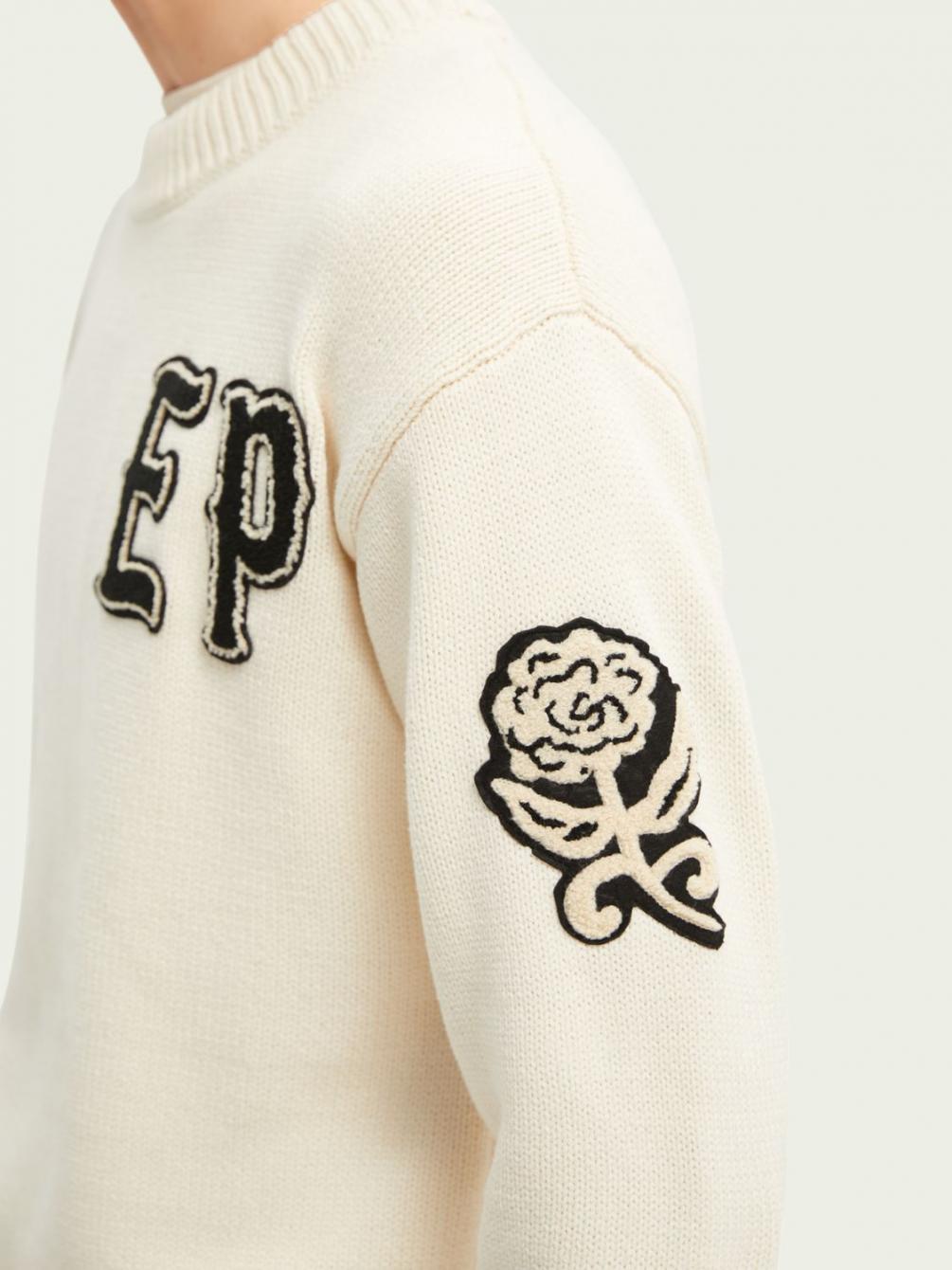 Onze klassieke gebreide trui brengt een ode aan een klassieke artiest. Zacht, licht en ribgebreid voor maximaal comfort. Dankzij de zijdezachte crèmekleur vallen de geborduurde patches nog meer op.