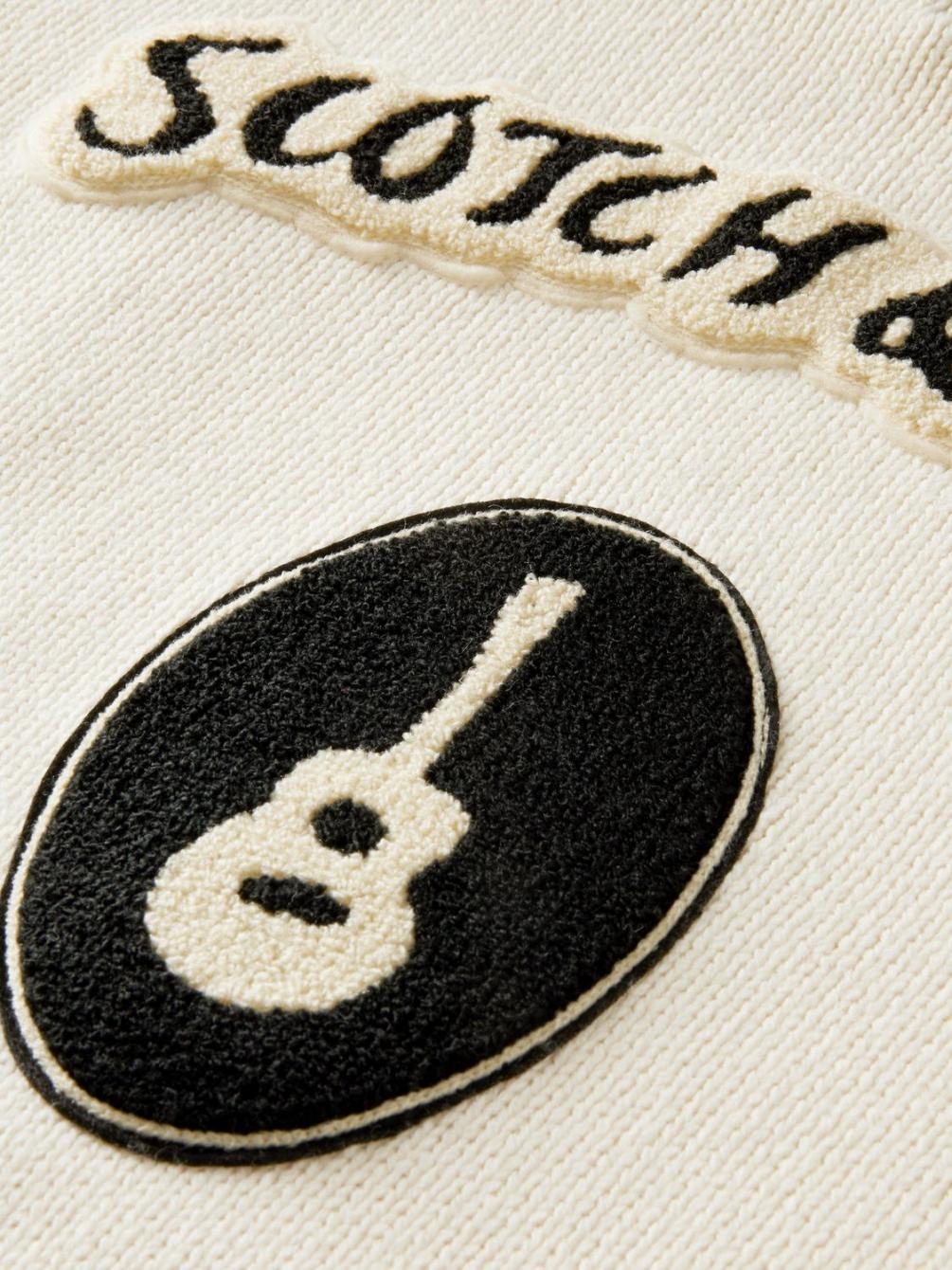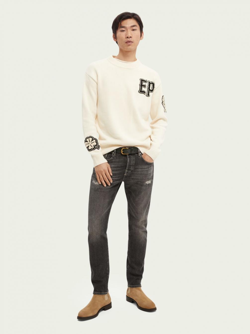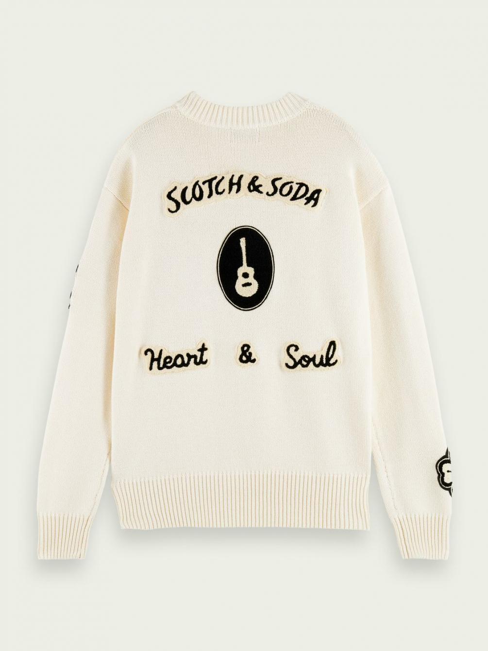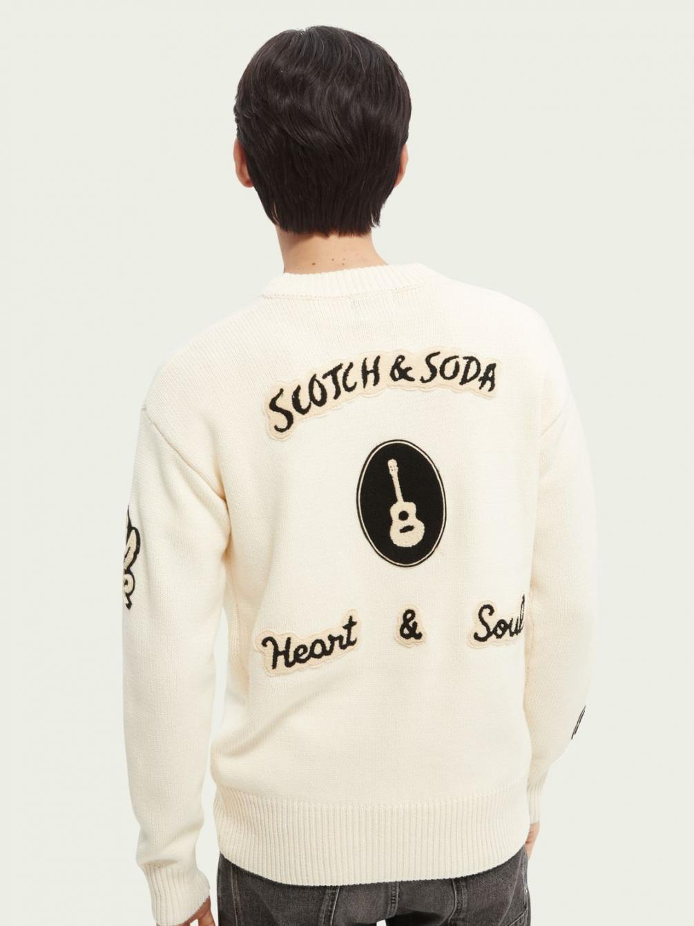 Onze klassieke gebreide trui brengt een ode aan een klassieke artiest. Zacht, licht en ribgebreid voor maximaal comfort. Dankzij de zijdezachte crèmekleur vallen de geborduurde patches nog meer op.