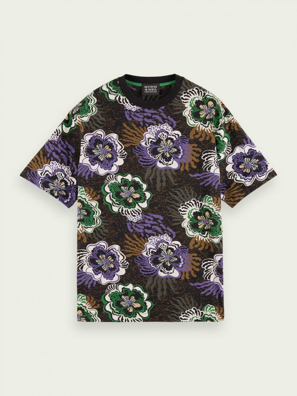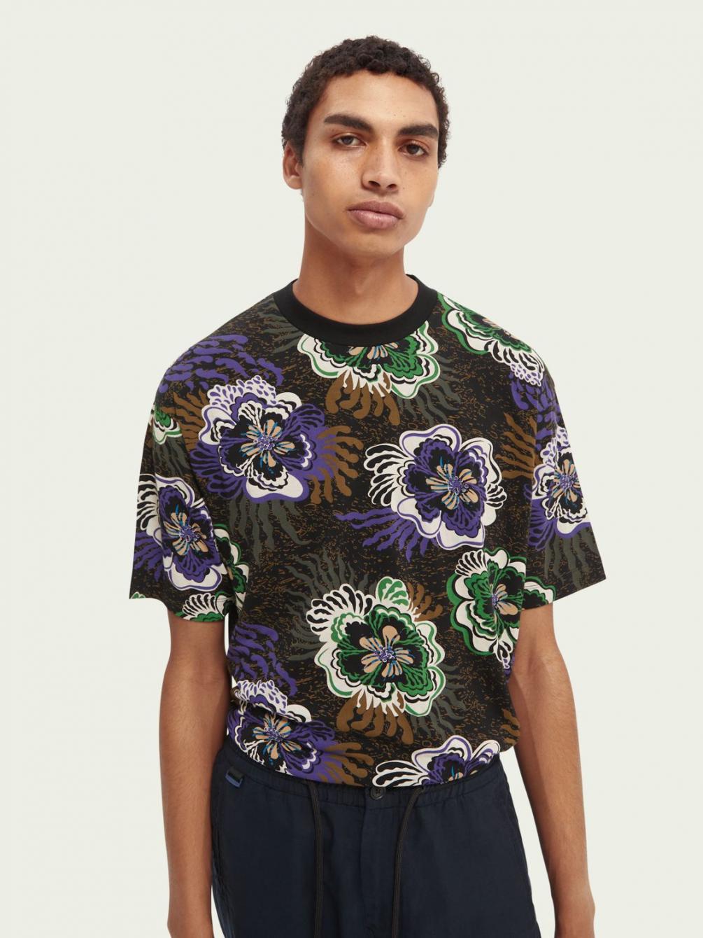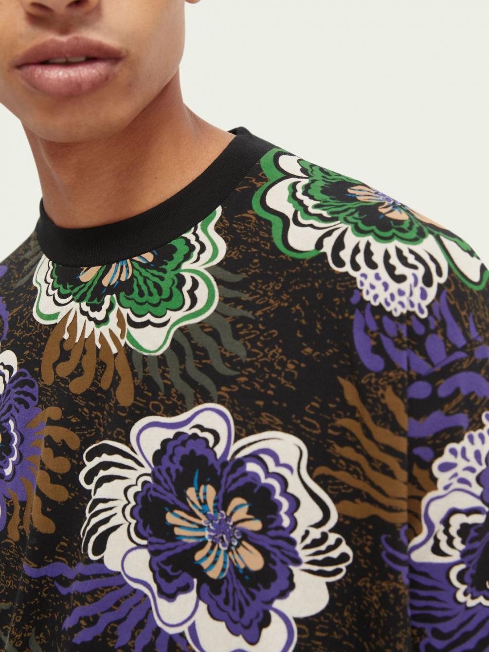 On this T-shirt, we put a print with green and blue coloured flowers in front of a dark-toned background. We also chose to cut this piece in a relaxed-fit….