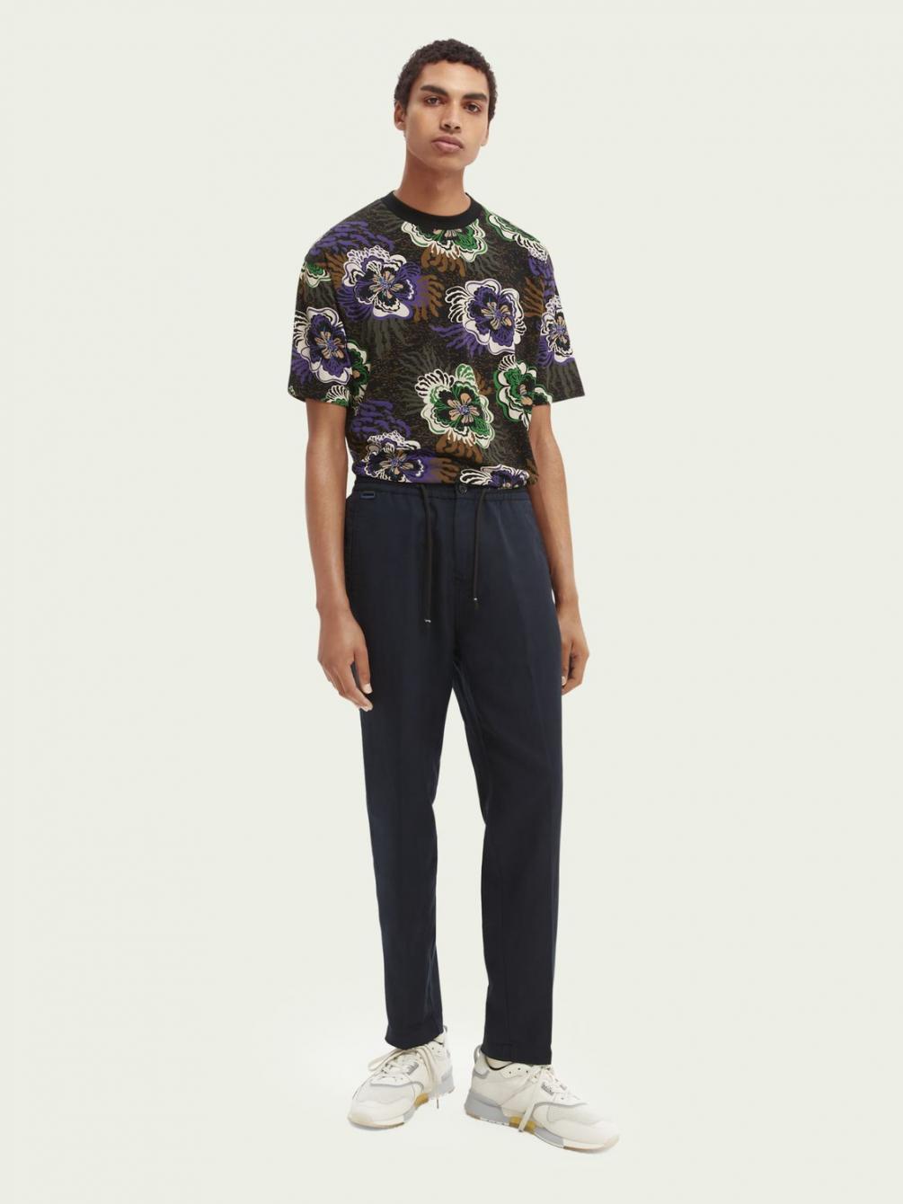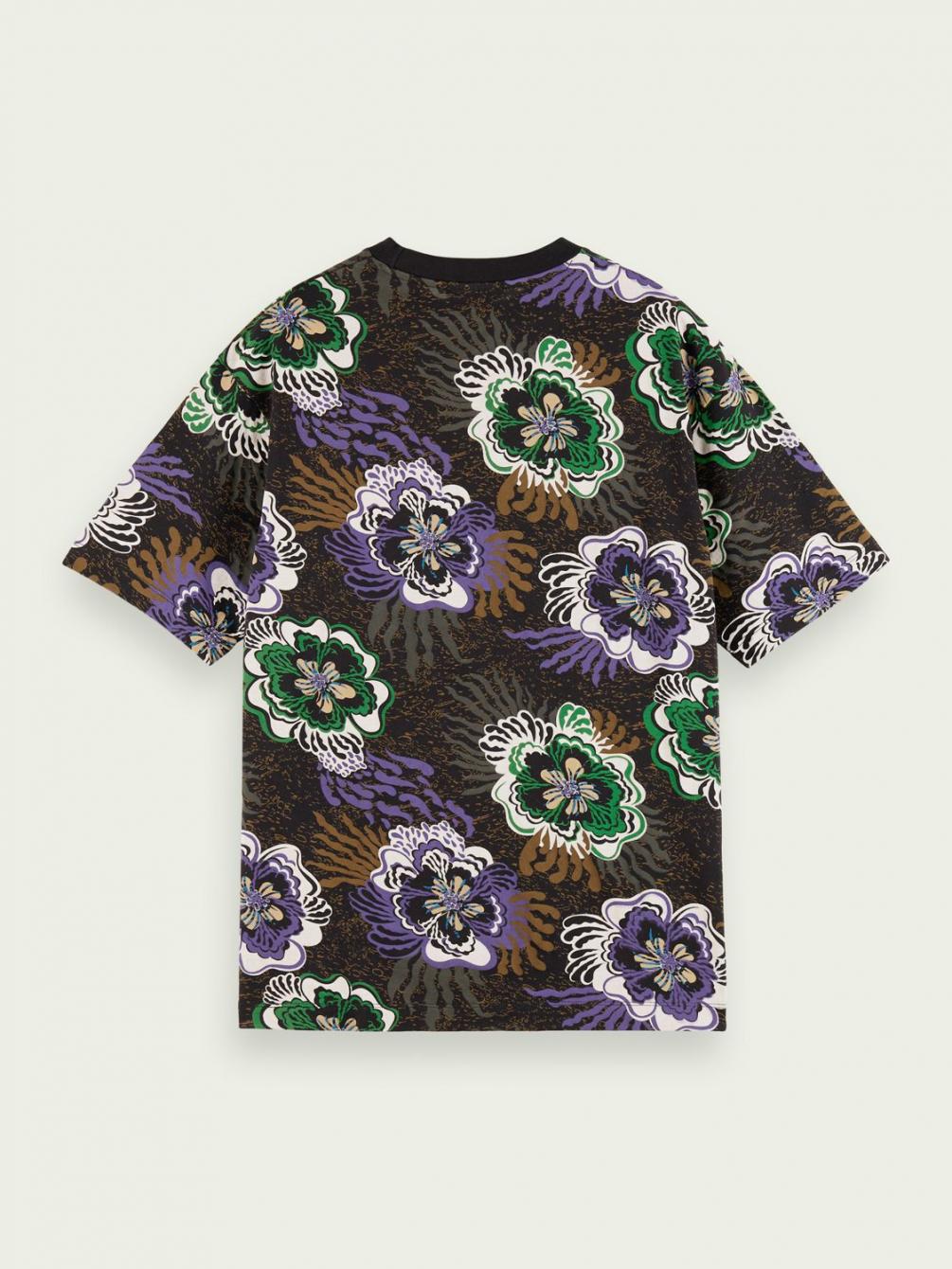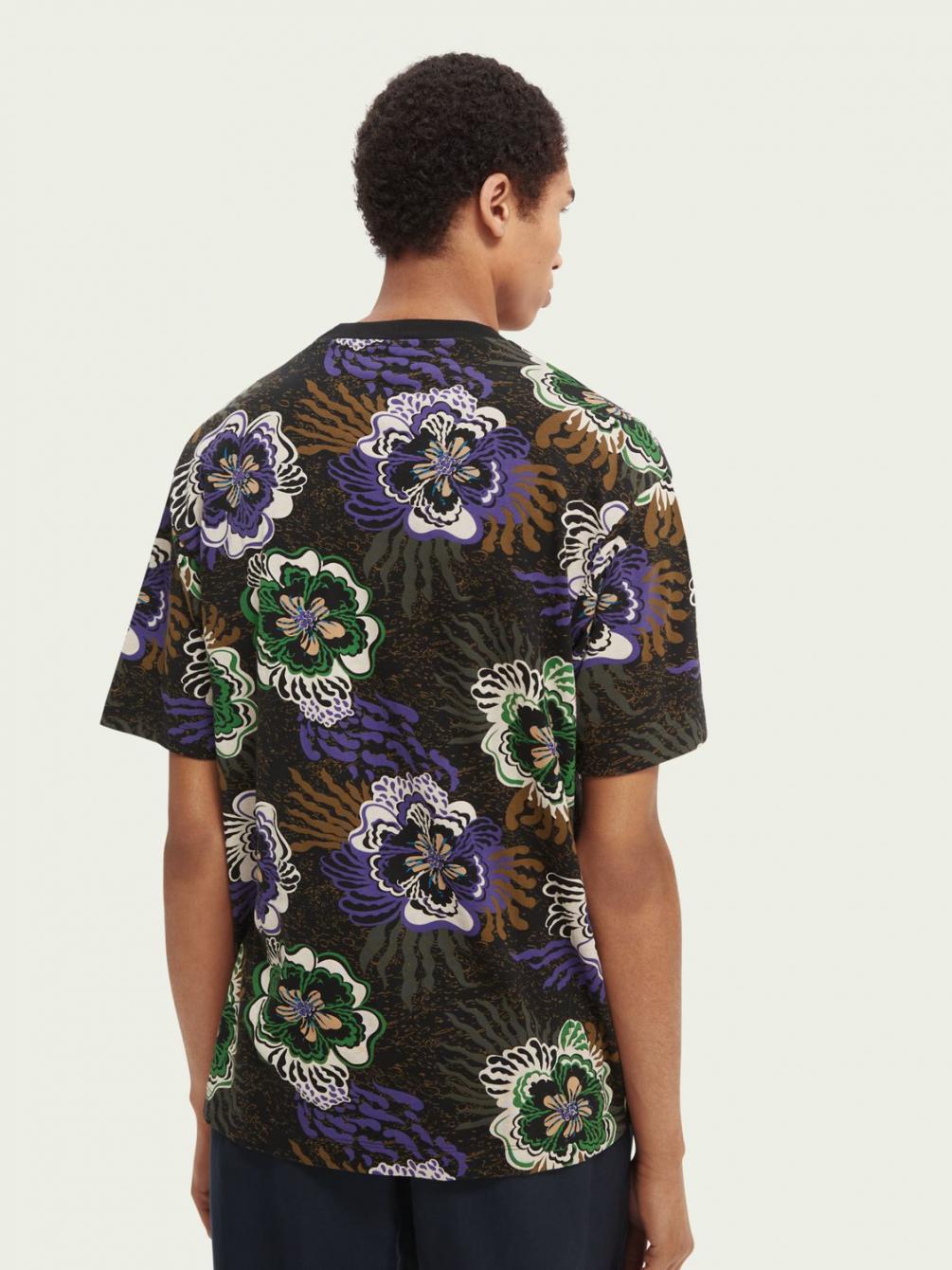 On this T-shirt, we put a print with green and blue coloured flowers in front of a dark-toned background. We also chose to cut this piece in a relaxed-fit….