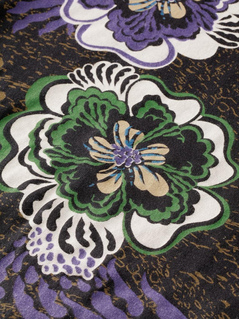 On this T-shirt, we put a print with green and blue coloured flowers in front of a dark-toned background. We also chose to cut this piece in a relaxed-fit.