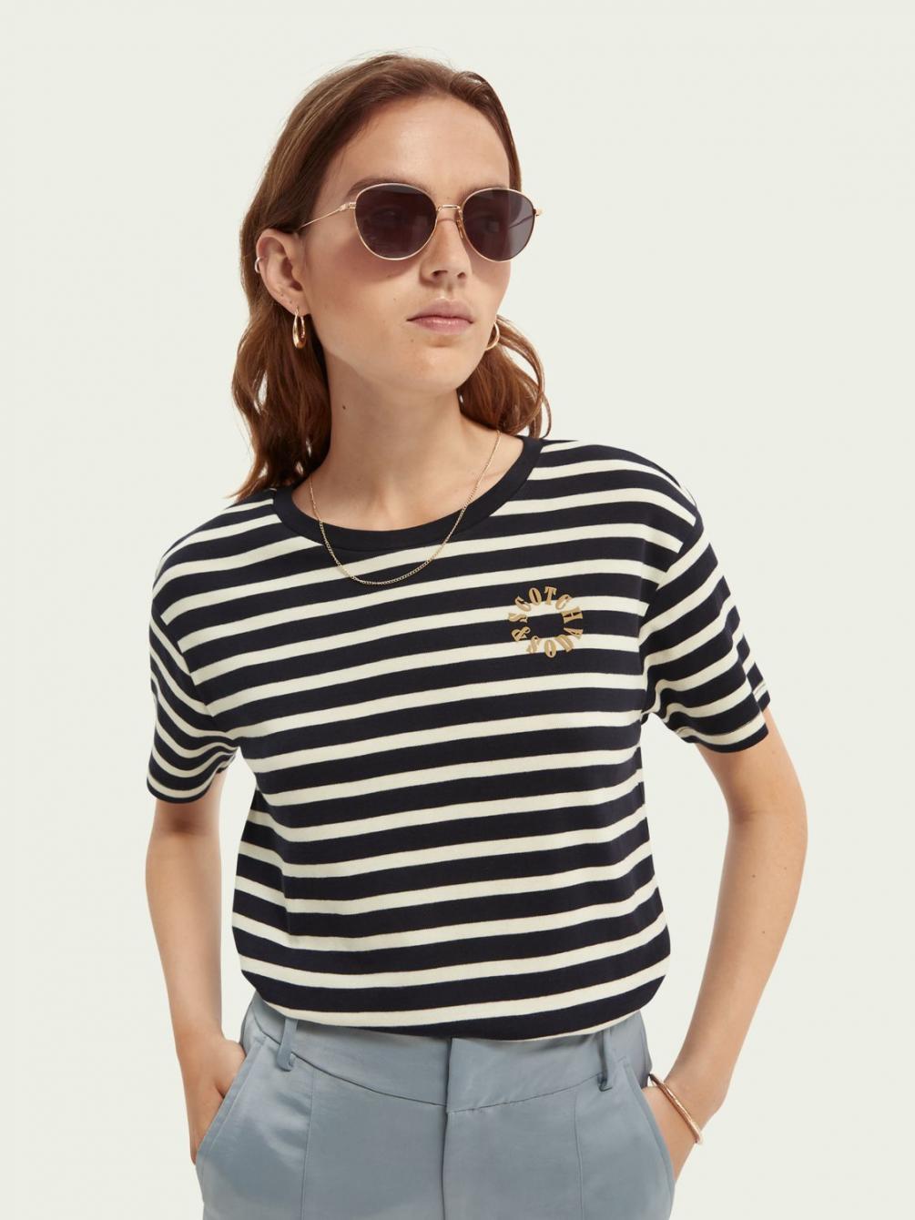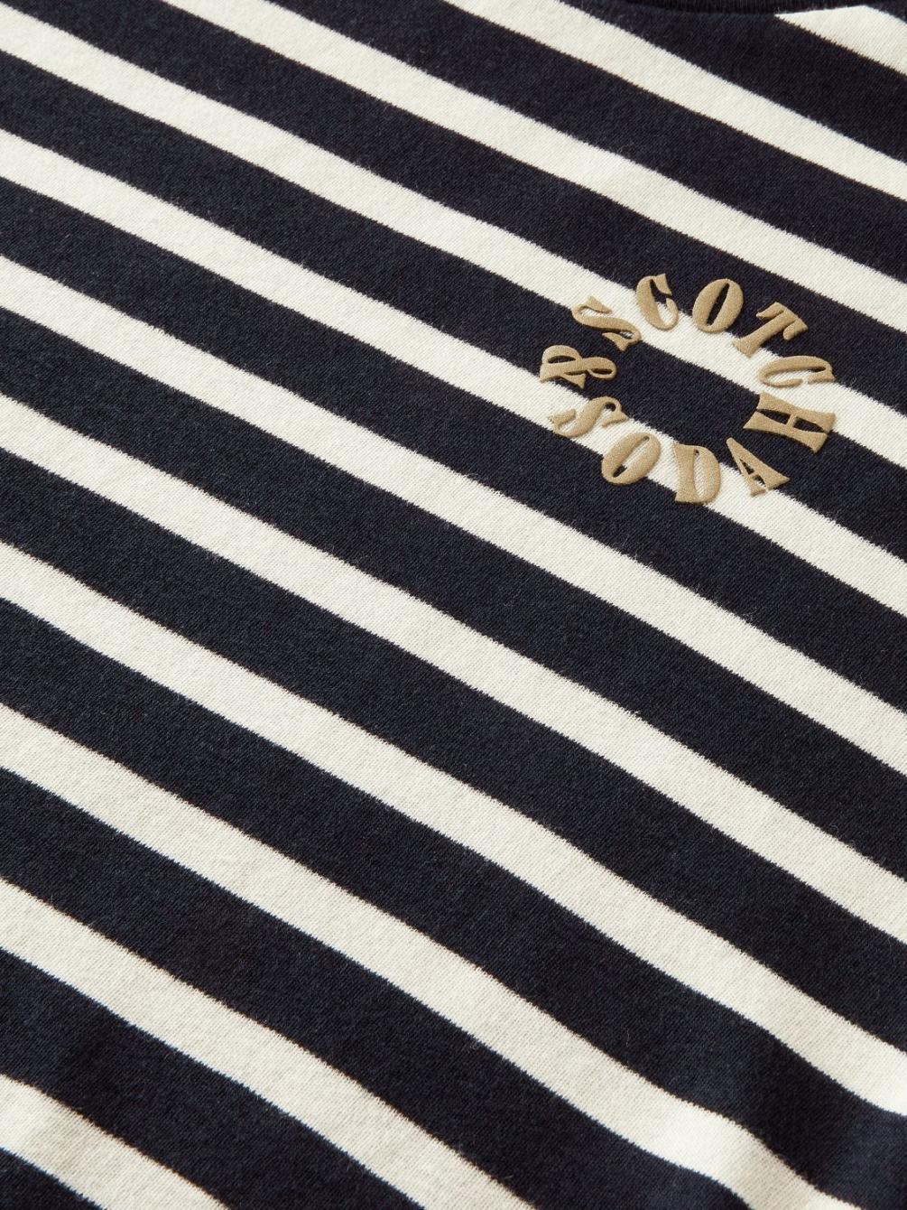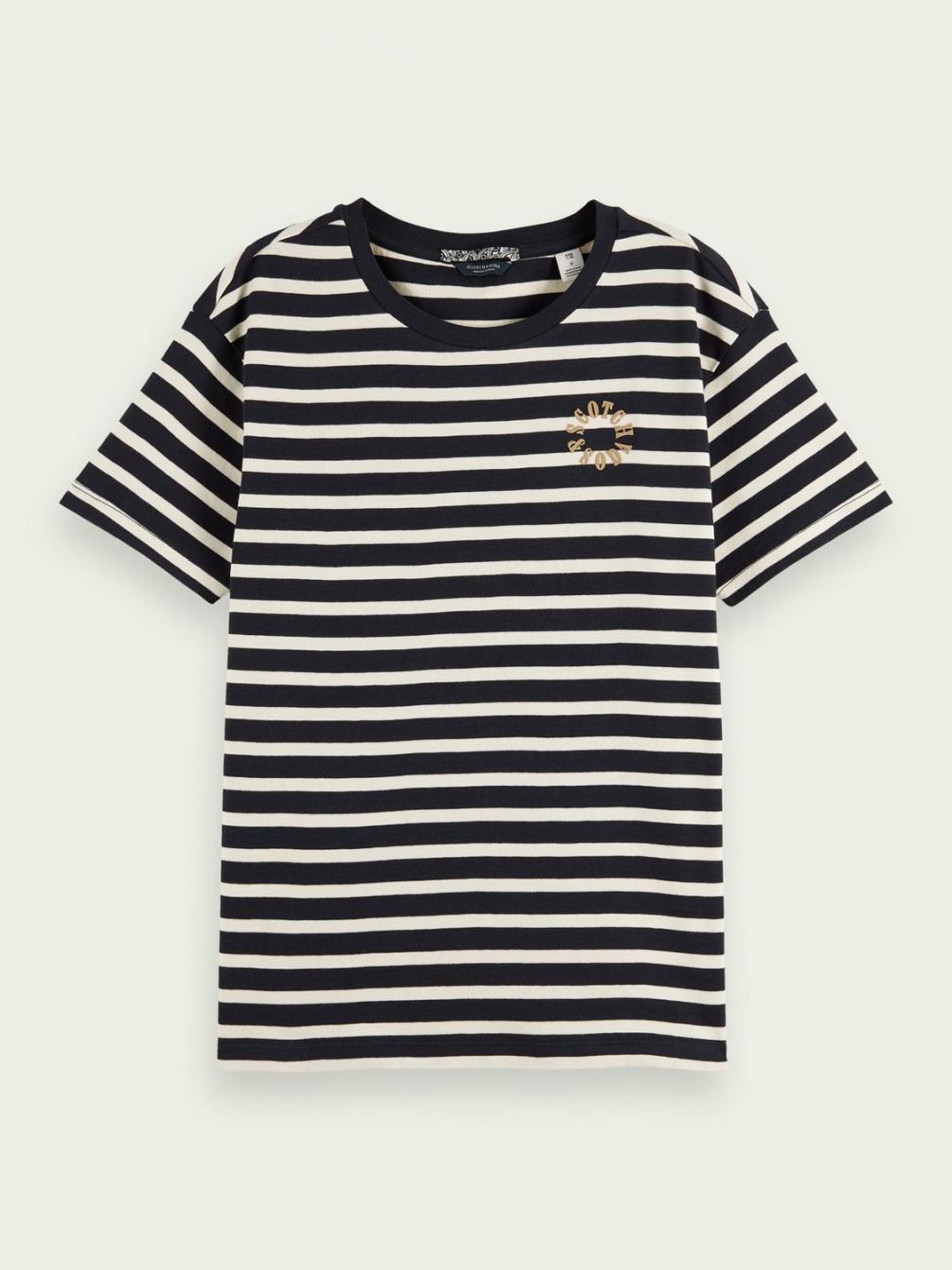 Dit gestreepte T-shirt vankatoen staat geweldig in laagjeslooks. Het grafische detail links op de borst voegt een vrolijke finishing touch toe. Dit item is klaar voor zomerdagen….