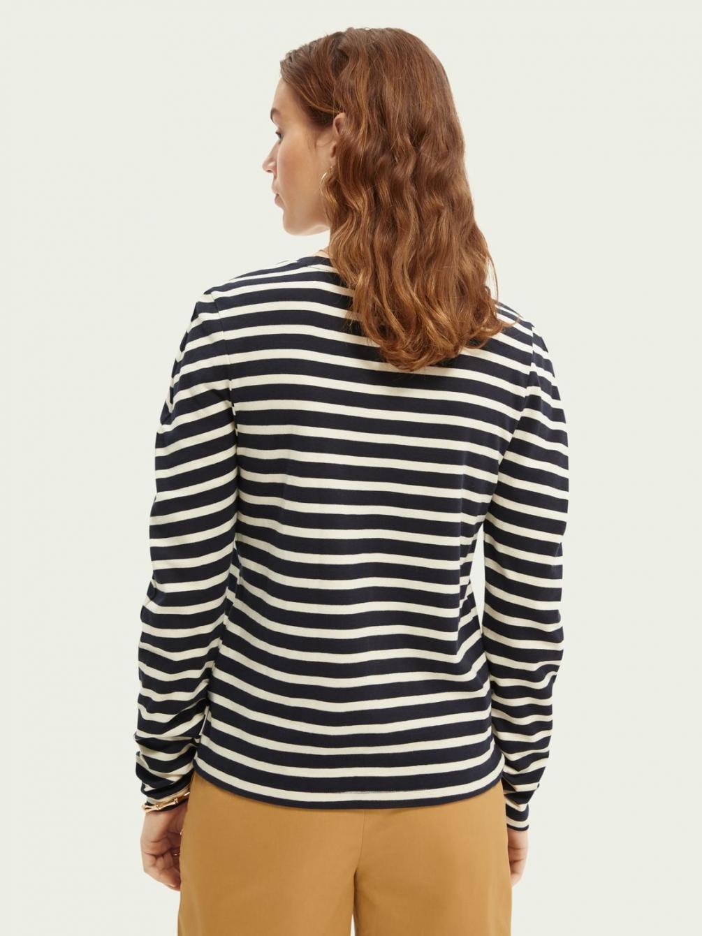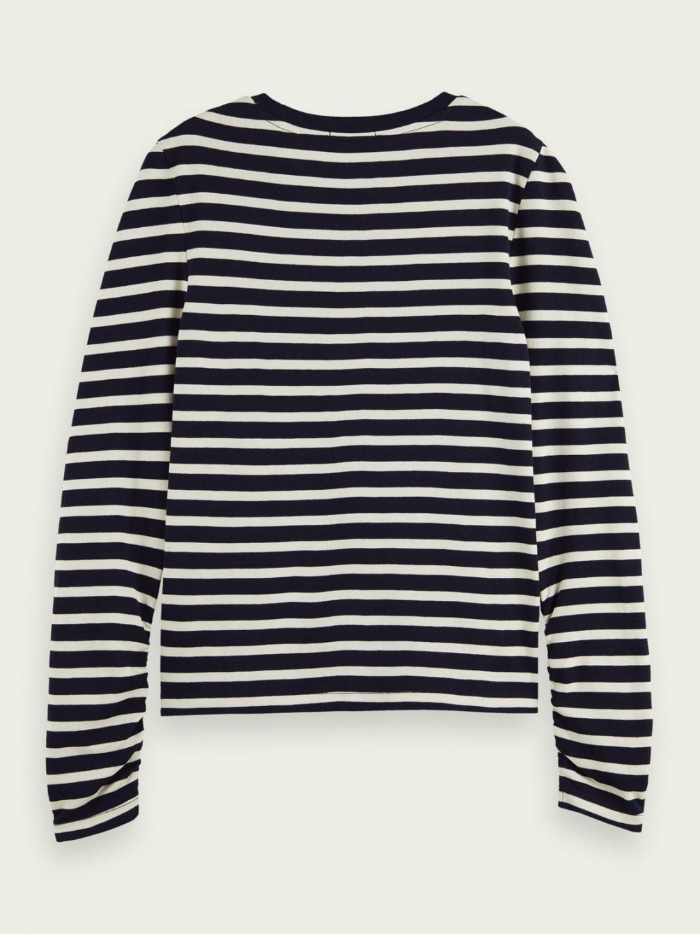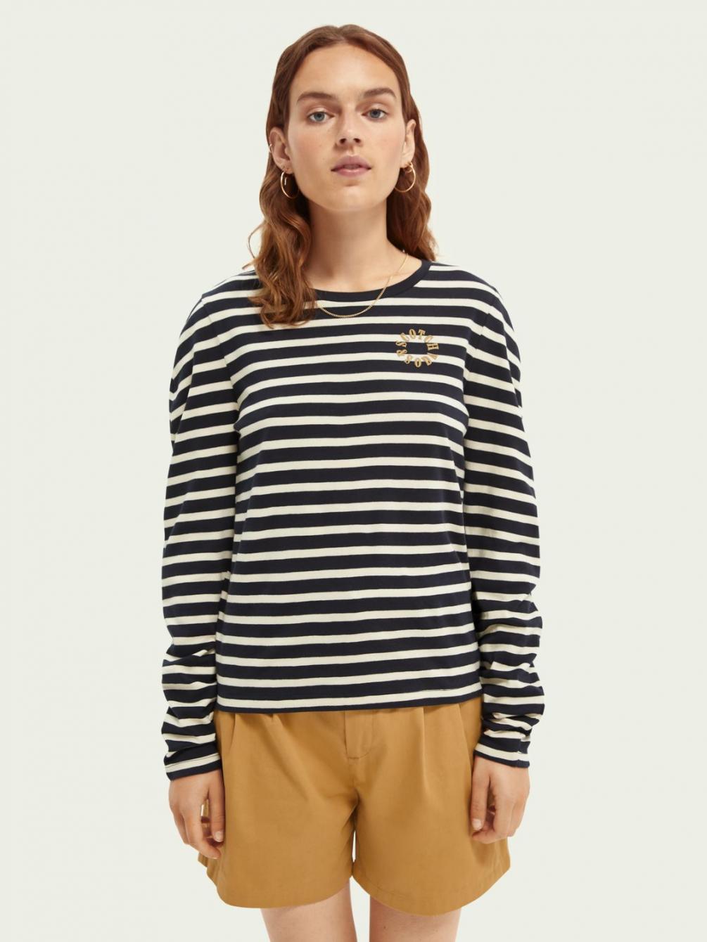 Net als je denkt dat je alles al gezien hebt … is daar onze gestreepte, katoenen top met lange mouwen. De ronde vorm van de mouwen voegt een surrealistisch en subtiel extra vleugje karakter toe. Een kleine graphic links op de borst zorgt voor de finishing touch.