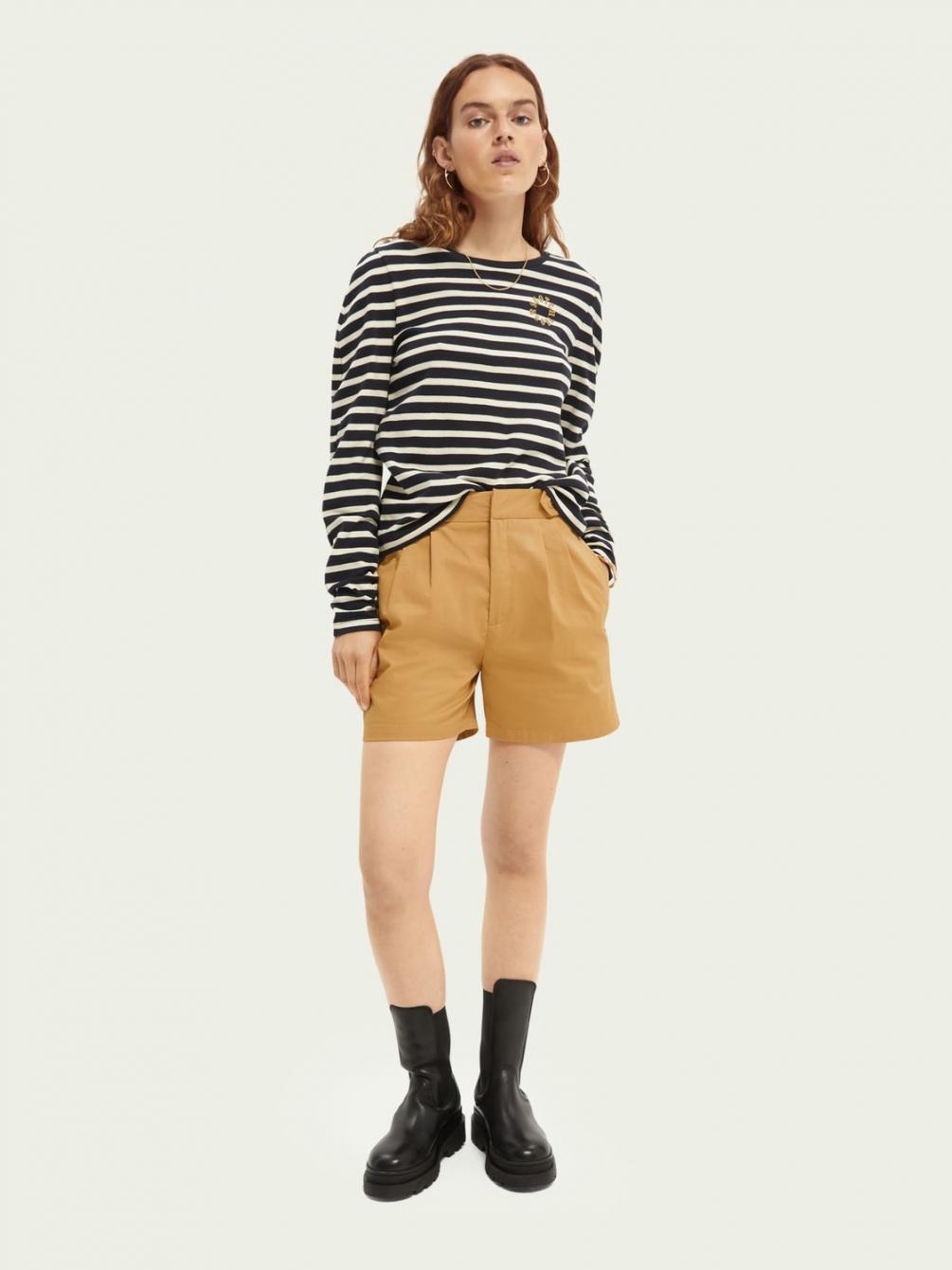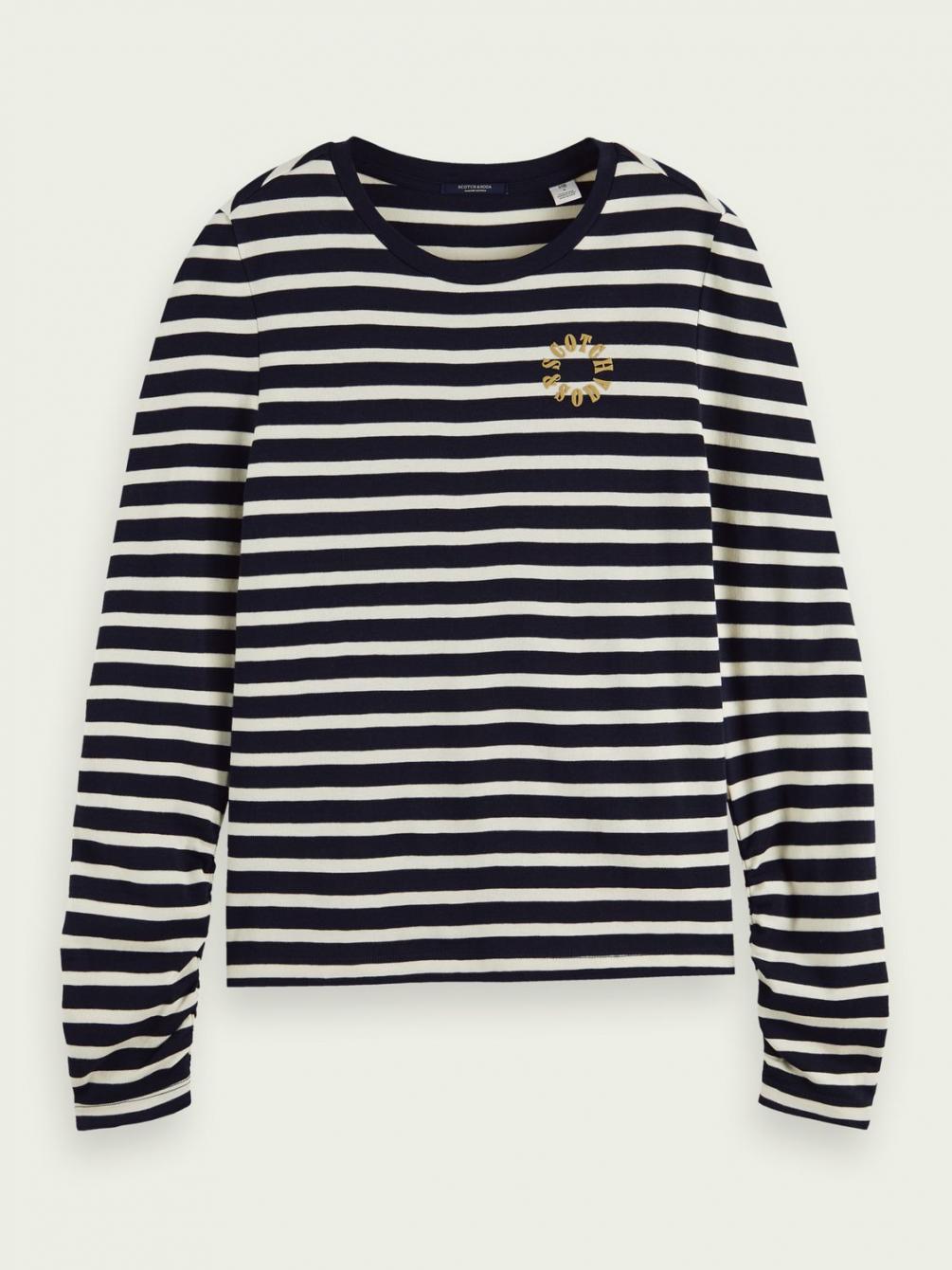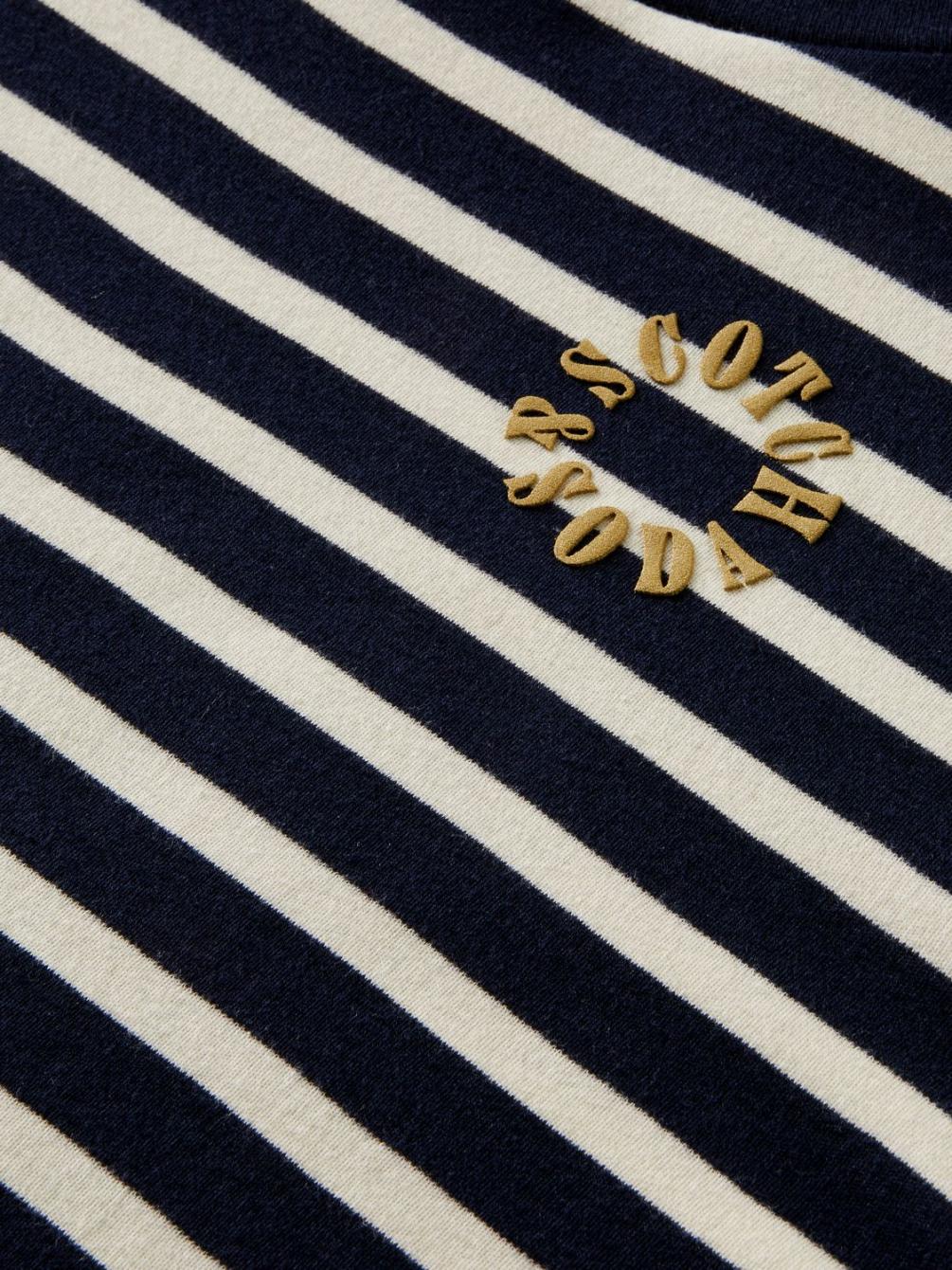 Net als je denkt dat je alles al gezien hebt … is daar onze gestreepte, katoenen top met lange mouwen. De ronde vorm van de mouwen voegt een surrealistisch en subtiel extra vleugje karakter toe. Een kleine graphic links op de borst zorgt voor de finishing touch.