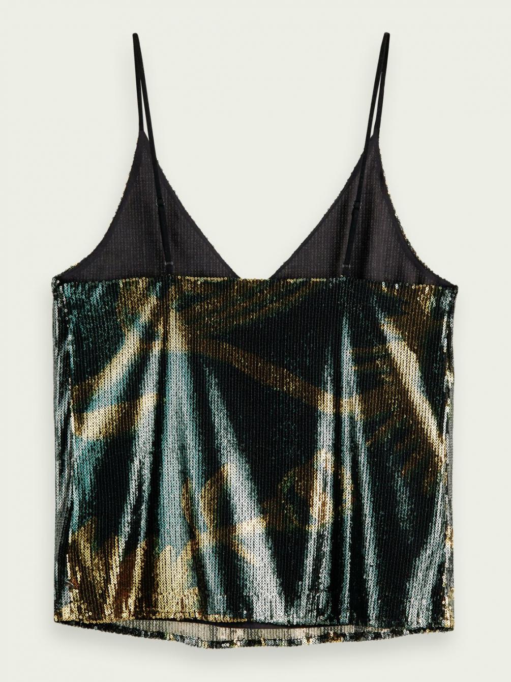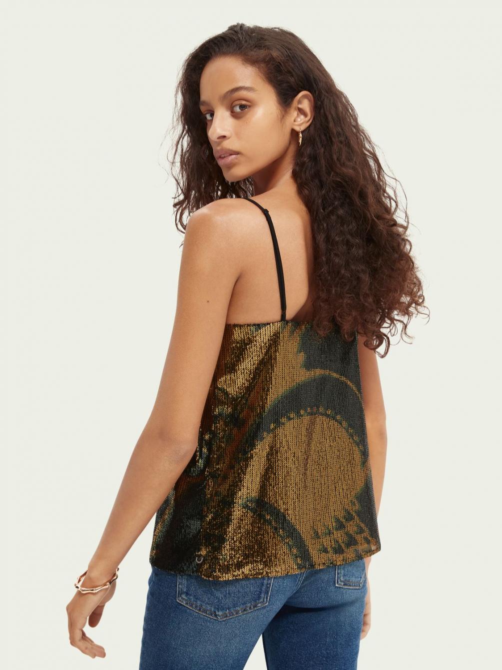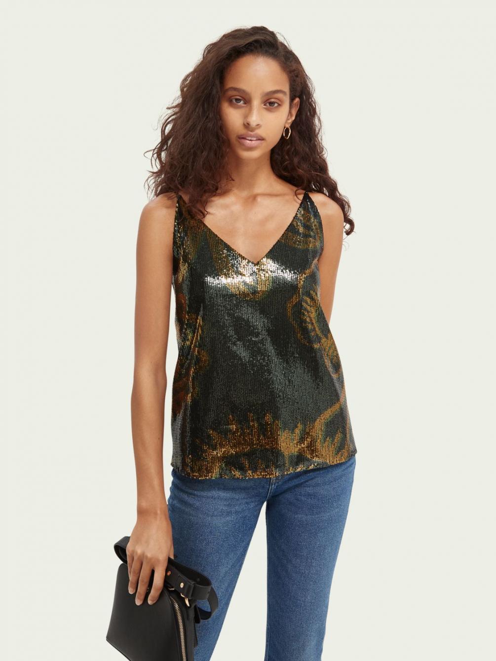 Op zoek naar de perfecte partytop? Je hebt hem gevonden. Deze top met V-hals is ontworpen met all-over pailletten die een print vormen. Hier maak je zeker een statement mee….