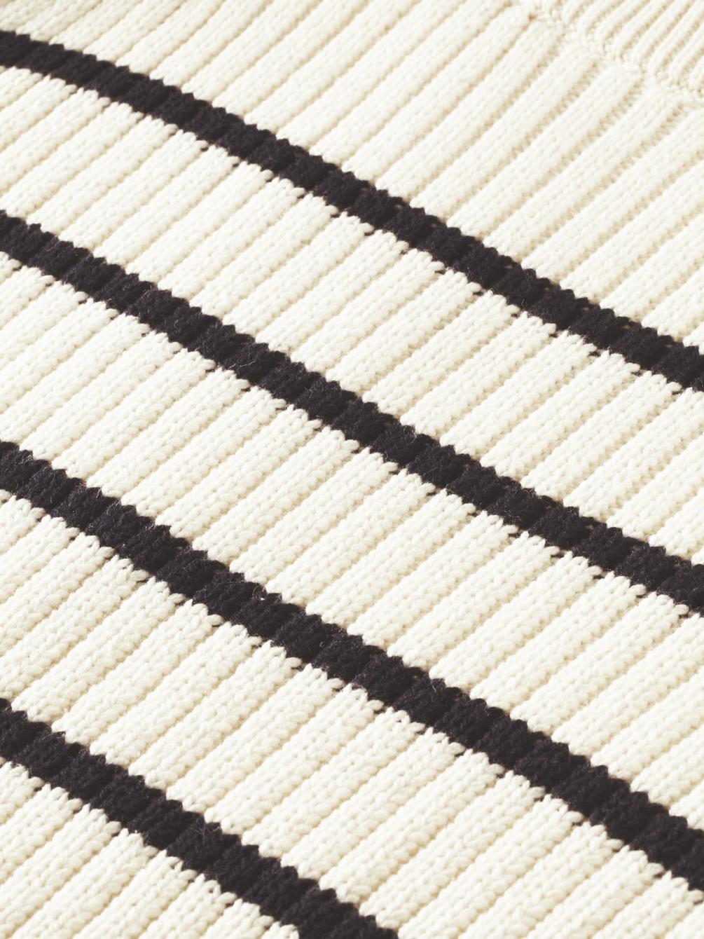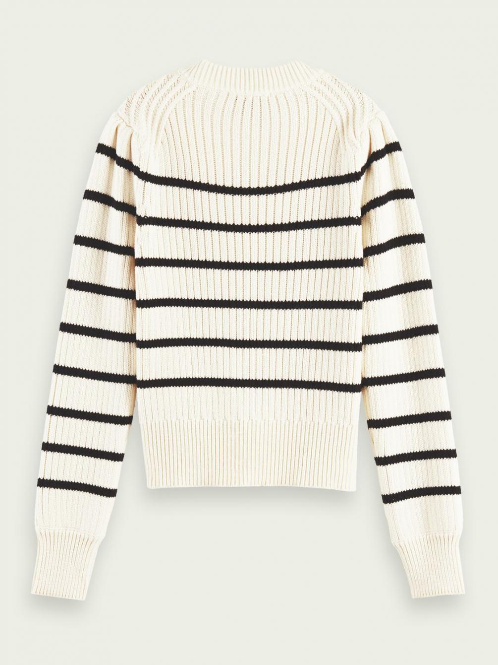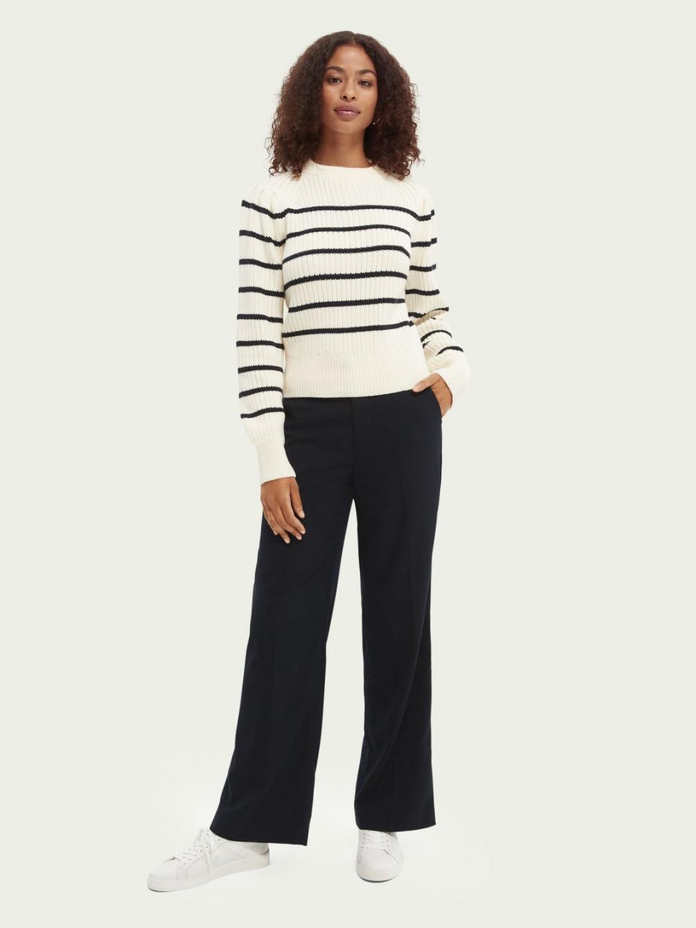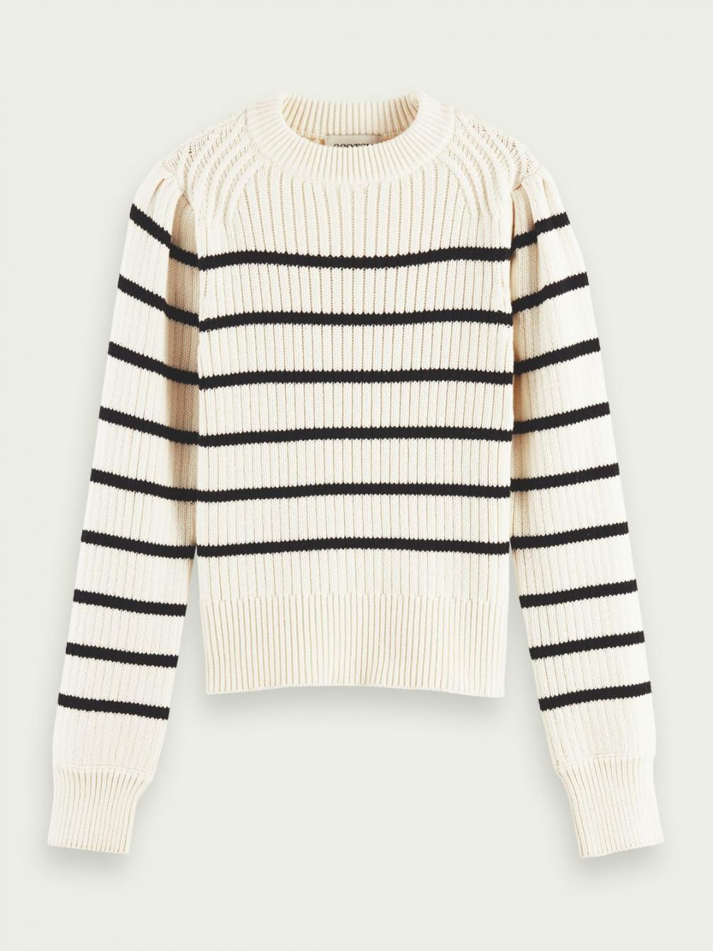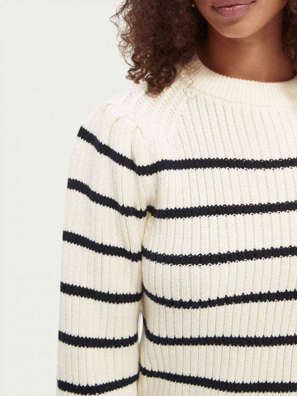 Bereid je voor om de kou te trotseren in onze sweater met ballonmouwen. Deze sweater is gebreid met horizontale strepen en heeft een geribbelde zoom, hals en mouwboorden om de warmte binnen te houden. Gedeeltelijk gemaakt met biologisch katoen (60%): niet genetisch gemodificeerde zaadjes worden gezaaid in grond die vrij is van pesticiden en kunstmest, met minder waterverbruik en geteeld met gebruik van gewasrotatie, wat beter is voor de gezondheid van de bodem. Dit is een mix, de precieze samenstelling van het materiaal staat vermeld op het label en in de highlights.