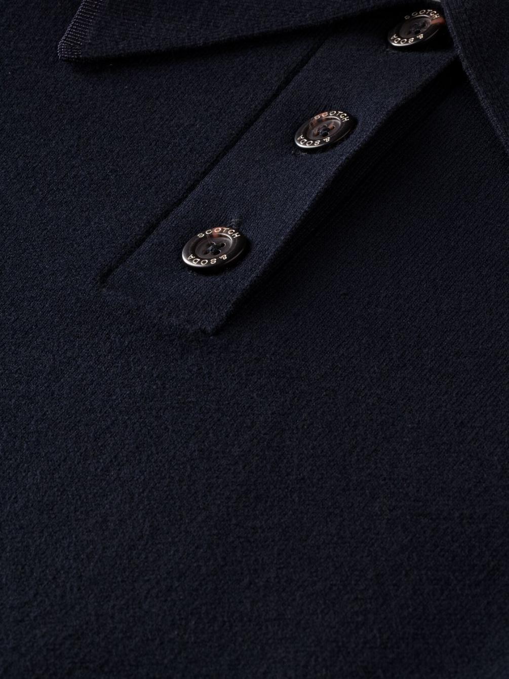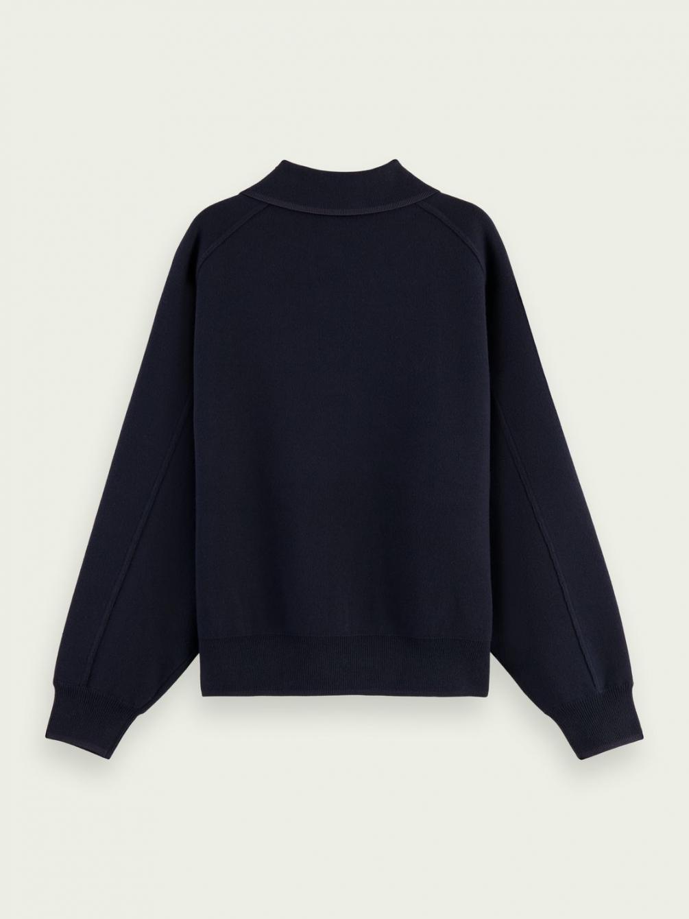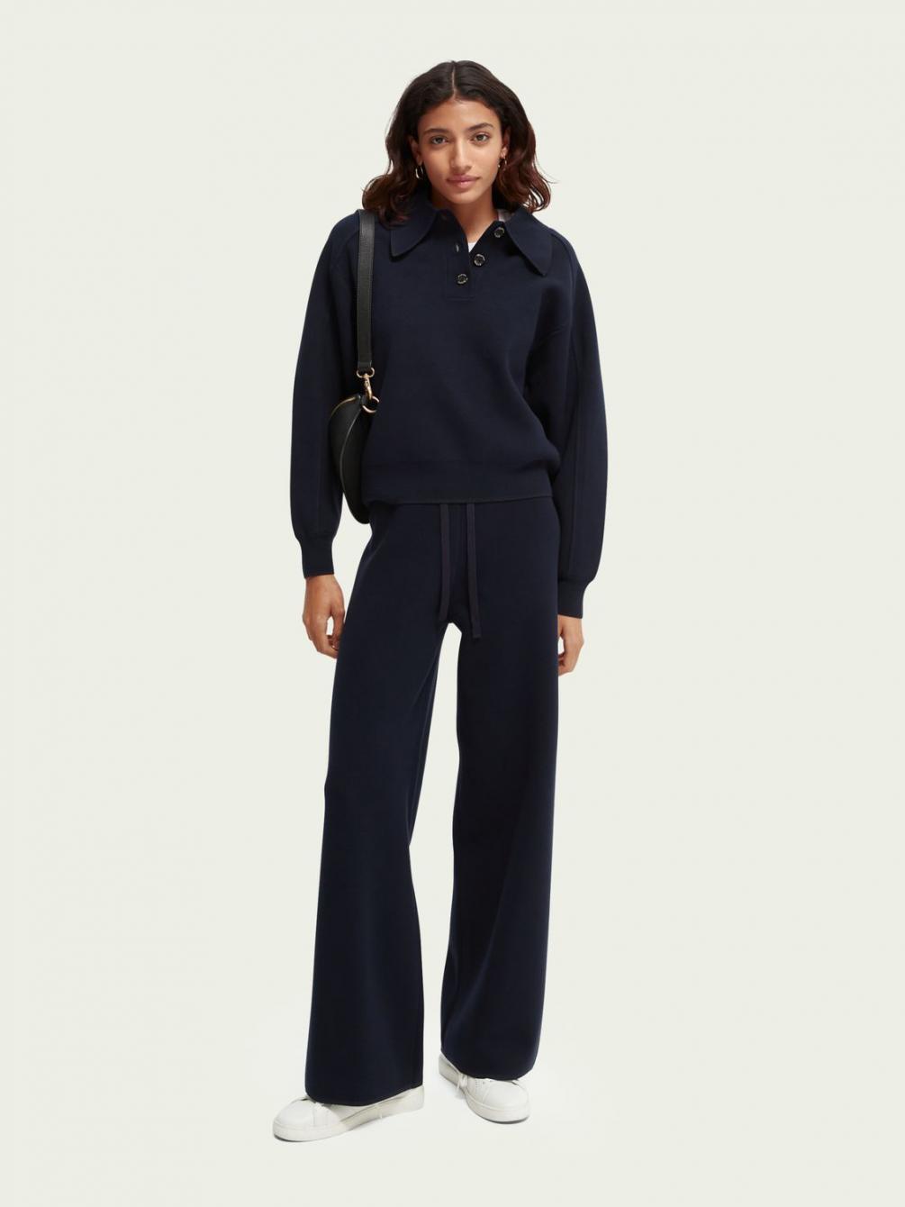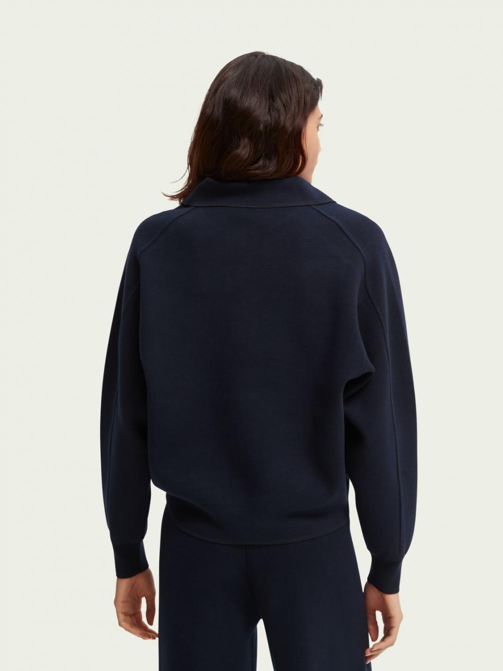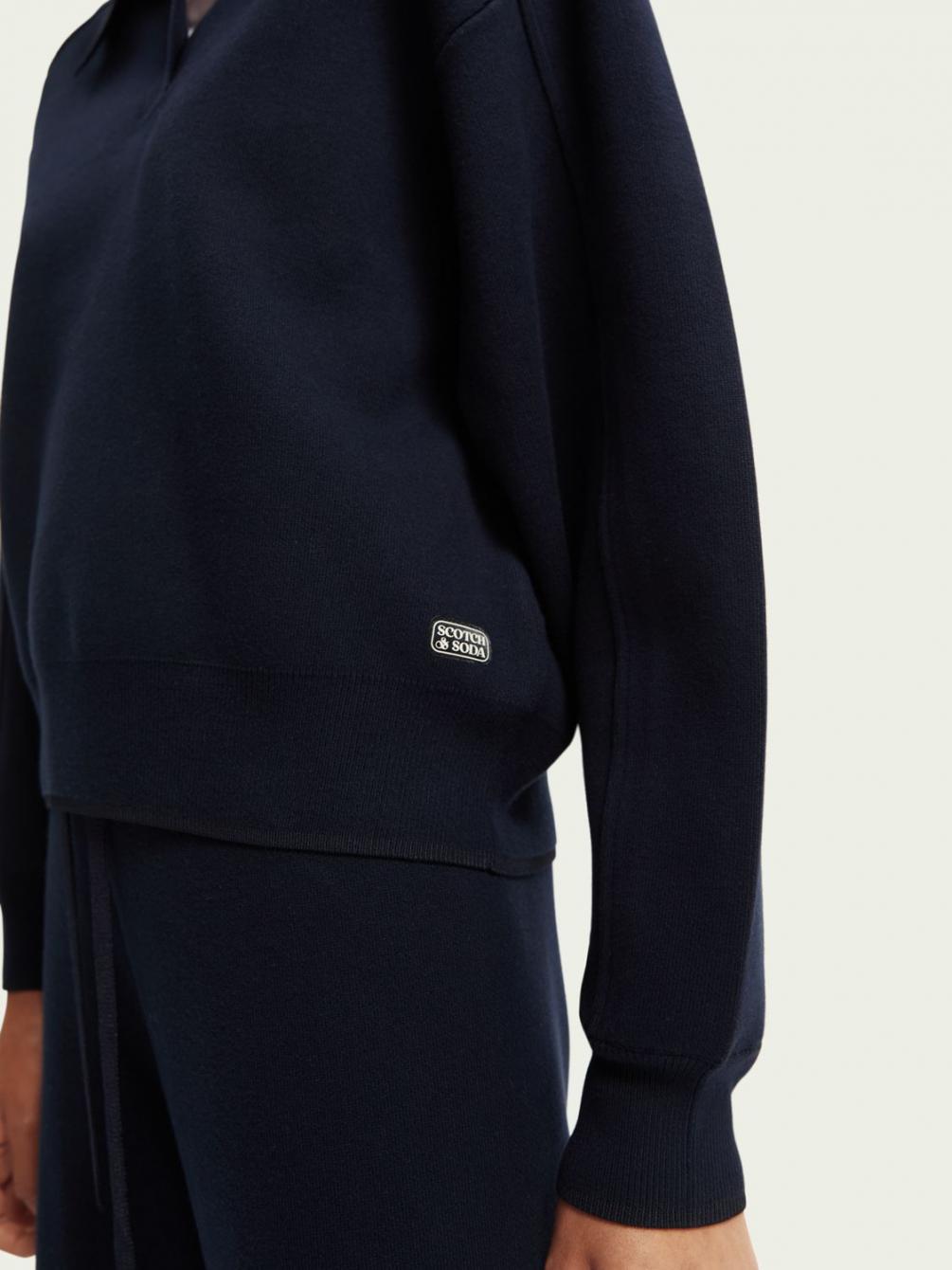 Voor onze nieuwste sweater volgen we de trends van dit seizoen: een grote polo halslijn en ballonmouwen. De donkere tint, subtiele plooien en grote knopen zijn de perfecte finishing tou…