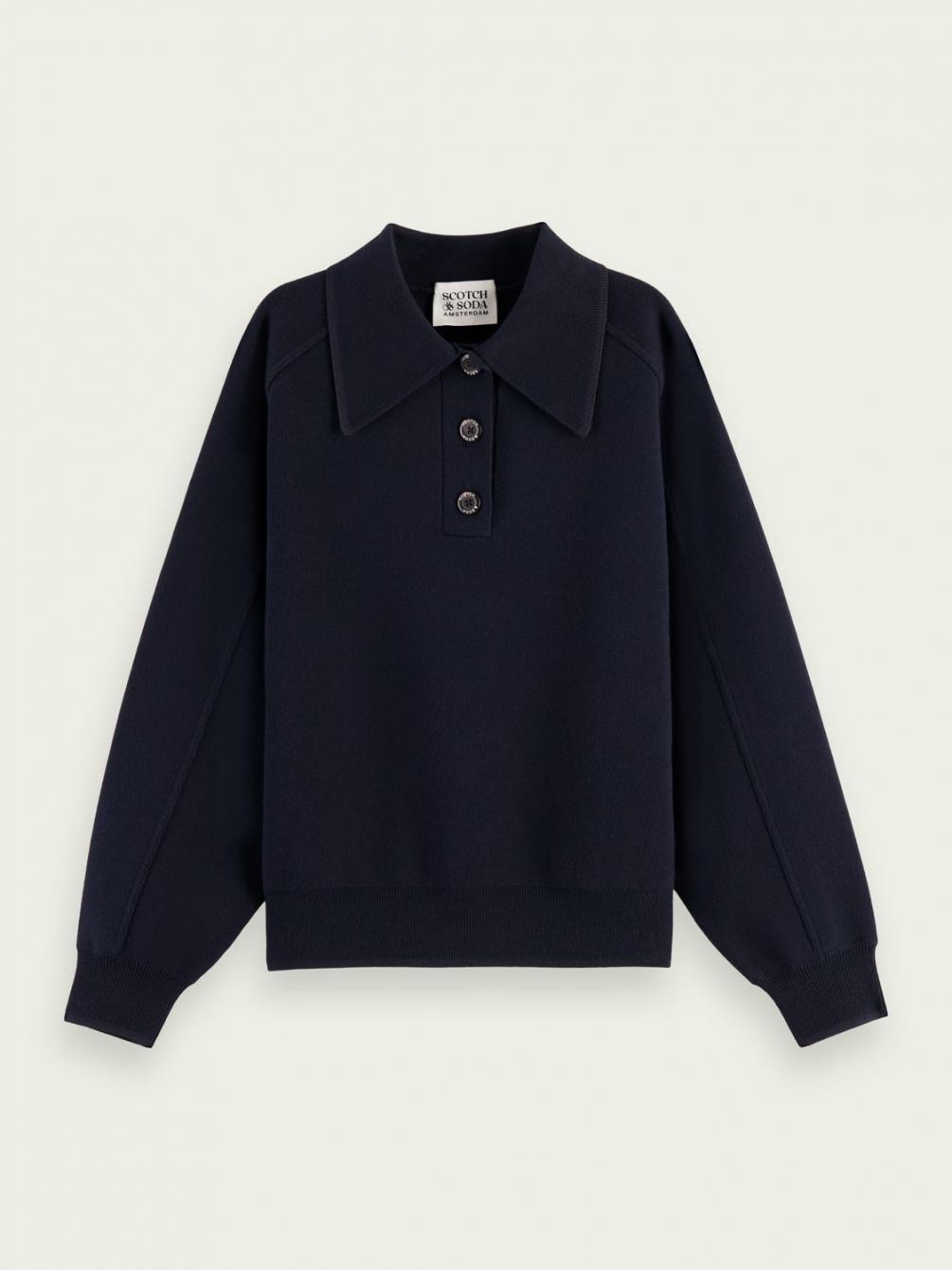 Voor onze nieuwste sweater volgen we de trends van dit seizoen: een grote polo halslijn en ballonmouwen. De donkere tint, subtiele plooien en grote knopen zijn de perfecte finishing touches.